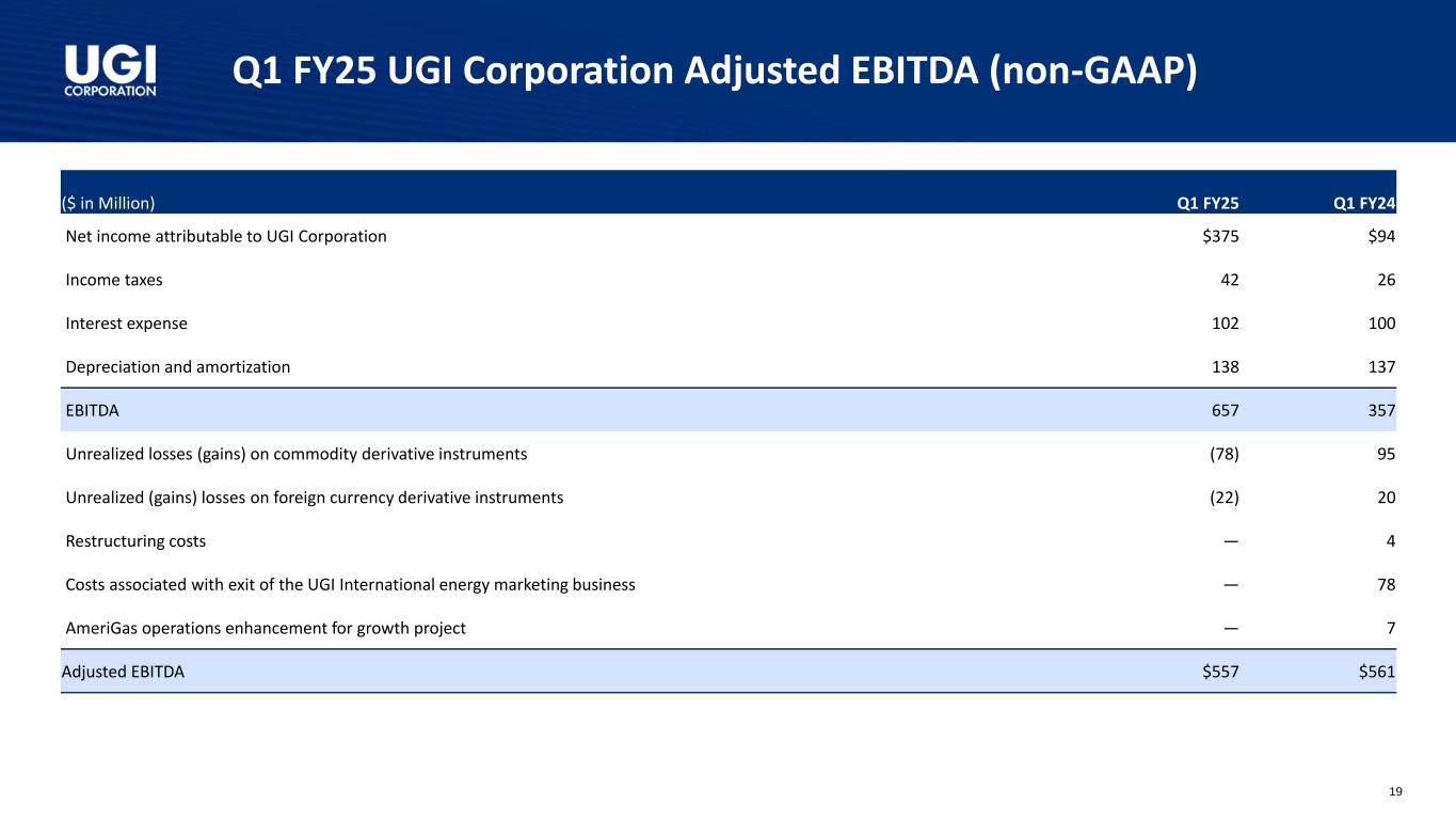 Q1 FY25 Segment Reconciliation (GAAP) 1. For US GAAP purposes, certain revenue-related taxes within our Utilities segment are included in “Operating and administrative expenses” above. Such costs reduce margin for Management’s Results of Operations reported in our periodic filings. 1 1 All non-GAAP adjustments are recorded at Corporate and Other. As a result, GAAP and non-GAAP earnings from each reportable segment – Utilities, Midstream & Marketing, UGI International and AmeriGas Propane – are the same. 18 ($ in Million) Total Utilities Midstream & Marketing UGI International AmeriGas Propane Corp & Other Revenues $2,030 $485 $367 $638 $627 $(87) Cost of sales (923) (204) (229) (374) (280) 164 Total margin $1,107 $281 $138 $264 $347 $77 Operating and administrative expenses (497) (98) (29) (134) (236) — Depreciation and amortization (138) (44) (20) (29) (45) — Other operating income (expense), net 15 (1) 2 5 8 1 Operating income (loss) 487 138 91 106 74 78 Income (loss) from equity investees 3 — 4 (1) — — Other non-operating (expense) income, net 29 3 — 5 — 21 Earnings (loss) before income taxes and interest expense 519 141 95 110 74 99 Interest expense (102) (26) (12) (10) (33) (21) Income (loss) before income taxes 417 115 83 100 41 78 Income tax (expense) benefit (42) (26) 6 — (87) 65 Net income (loss) income attributable to UGI Corporation $375 $89 $89 $100 $(46) $143