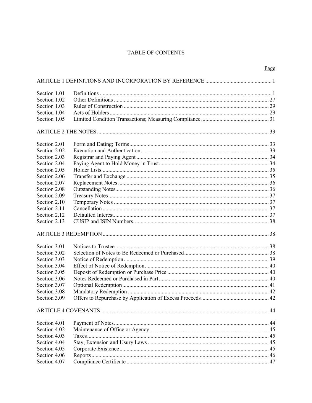 2 Section 4.08 Restricted Payments .......................................................................................................... 47 Section 4.09 Incurrence of Indebtedness ............................................................................................... 50 Section 4.10 Liens ................................................................................................................................. 52 Section 4.11 Limitations on Finance Corp. ........................................................................................... 53 Section 4.12 Dividend and Other Payment Restrictions Affecting Restricted Subsidiaries .................. 53 Section 4.13 Designation of Restricted and Unrestricted Subsidiaries .................................................. 54 Section 4.14 Transactions with Affiliates .............................................................................................. 55 Section 4.15 Offer to Repurchase Upon Change of Control Triggering Event ..................................... 57 Section 4.16 Asset Sales ........................................................................................................................ 58 Section 4.17 Effectiveness of Covenants ............................................................................................... 61 ARTICLE 5 SUCCESSORS ....................................................................................................................... 61 Section 5.01 Mergers, Consolidations, etc............................................................................................. 61 Section 5.02 Successor Entity Substituted ............................................................................................. 63 ARTICLE 6 DEFAULTS AND REMEDIES ............................................................................................. 63 Section 6.01 Events of Default .............................................................................................................. 63 Section 6.02 Acceleration ...................................................................................................................... 65 Section 6.03 Other Remedies ................................................................................................................. 65 Section 6.04 Waiver of Past Defaults .................................................................................................... 66 Section 6.05 Control by Majority .......................................................................................................... 66 Section 6.06 Limitation on Suits ............................................................................................................ 66 Section 6.07 Rights of Holders to Receive Payment ............................................................................. 67 Section 6.08 Collection Suit by Trustee ................................................................................................ 67 Section 6.09 Restoration of Rights and Remedies ................................................................................. 67 Section 6.10 Rights and Remedies Cumulative ..................................................................................... 67 Section 6.11 Delay or Omission Not Waiver......................................................................................... 67 Section 6.12 Trustee May File Proofs of Claim .................................................................................... 68 Section 6.13 Priorities ............................................................................................................................ 68 Section 6.14 Undertaking for Costs ....................................................................................................... 68 Section 6.15 Noteholder Direction ........................................................................................................ 69 ARTICLE 7 TRUSTEE .............................................................................................................................. 70 Section 7.01 Duties of Trustee ............................................................................................................... 70 Section 7.02 Rights of Trustee ............................................................................................................... 71 Section 7.03 Individual Rights of Trustee ............................................................................................. 73 Section 7.04 Trustee’s Disclaimer ......................................................................................................... 73 Section 7.05 Notice of Defaults ............................................................................................................. 73 Section 7.06 Compensation and Indemnity ........................................................................................... 73 Section 7.07 Replacement of Trustee .................................................................................................... 74 Section 7.08 Successor Trustee by Merger, etc. .................................................................................... 75 Section 7.09 Eligibility; Disqualification .............................................................................................. 75 ARTICLE 8 LEGAL DEFEASANCE AND COVENANT DEFEASANCE ............................................ 75 Section 8.01 Option to Effect Legal Defeasance or Covenant Defeasance ........................................... 75 Section 8.02 Legal Defeasance and Discharge ...................................................................................... 76 Section 8.03 Covenant Defeasance ........................................................................................................ 76