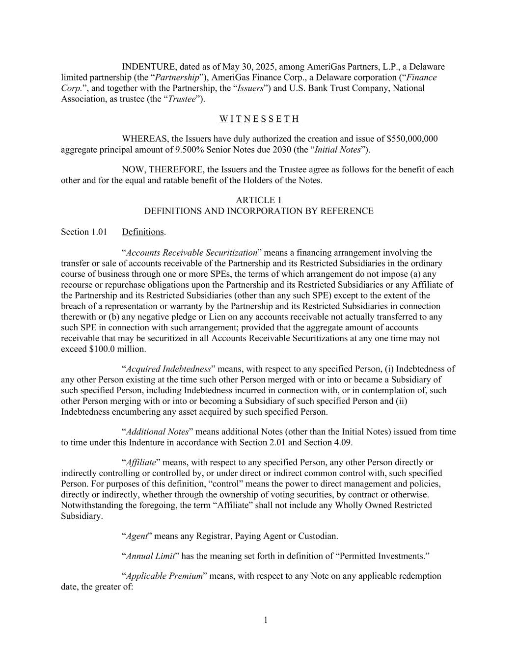 1 INDENTURE, dated as of May 30, 2025, among AmeriGas Partners, L.P., a Delaware limited partnership (the “Partnership”), AmeriGas Finance Corp., a Delaware corporation (“Finance Corp.”, and together with the Partnership, the “Issuers”) and U.S. Bank Trust Company, National Association, as trustee (the “Trustee”). W I T N E S S E T H WHEREAS, the Issuers have duly authorized the creation and issue of $550,000,000 aggregate principal amount of 9.500% Senior Notes due 2030 (the “Initial Notes”). NOW, THEREFORE, the Issuers and the Trustee agree as follows for the benefit of each other and for the equal and ratable benefit of the Holders of the Notes. ARTICLE 1 DEFINITIONS AND INCORPORATION BY REFERENCE Section 1.01 Definitions. “Accounts Receivable Securitization” means a financing arrangement involving the transfer or sale of accounts receivable of the Partnership and its Restricted Subsidiaries in the ordinary course of business through one or more SPEs, the terms of which arrangement do not impose (a) any recourse or repurchase obligations upon the Partnership and its Restricted Subsidiaries or any Affiliate of the Partnership and its Restricted Subsidiaries (other than any such SPE) except to the extent of the breach of a representation or warranty by the Partnership and its Restricted Subsidiaries in connection therewith or (b) any negative pledge or Lien on any accounts receivable not actually transferred to any such SPE in connection with such arrangement; provided that the aggregate amount of accounts receivable that may be securitized in all Accounts Receivable Securitizations at any one time may not exceed $100.0 million. “Acquired Indebtedness” means, with respect to any specified Person, (i) Indebtedness of any other Person existing at the time such other Person merged with or into or became a Subsidiary of such specified Person, including Indebtedness incurred in connection with, or in contemplation of, such other Person merging with or into or becoming a Subsidiary of such specified Person and (ii) Indebtedness encumbering any asset acquired by such specified Person. “Additional Notes” means additional Notes (other than the Initial Notes) issued from time to time under this Indenture in accordance with Section 2.01 and Section 4.09. “Affiliate” means, with respect to any specified Person, any other Person directly or indirectly controlling or controlled by, or under direct or indirect common control with, such specified Person. For purposes of this definition, “control” means the power to direct management and policies, directly or indirectly, whether through the ownership of voting securities, by contract or otherwise. Notwithstanding the foregoing, the term “Affiliate” shall not include any Wholly Owned Restricted Subsidiary. “Agent” means any Registrar, Paying Agent or Custodian. “Annual Limit” has the meaning set forth in definition of “Permitted Investments.” “Applicable Premium” means, with respect to any Note on any applicable redemption date, the greater of: