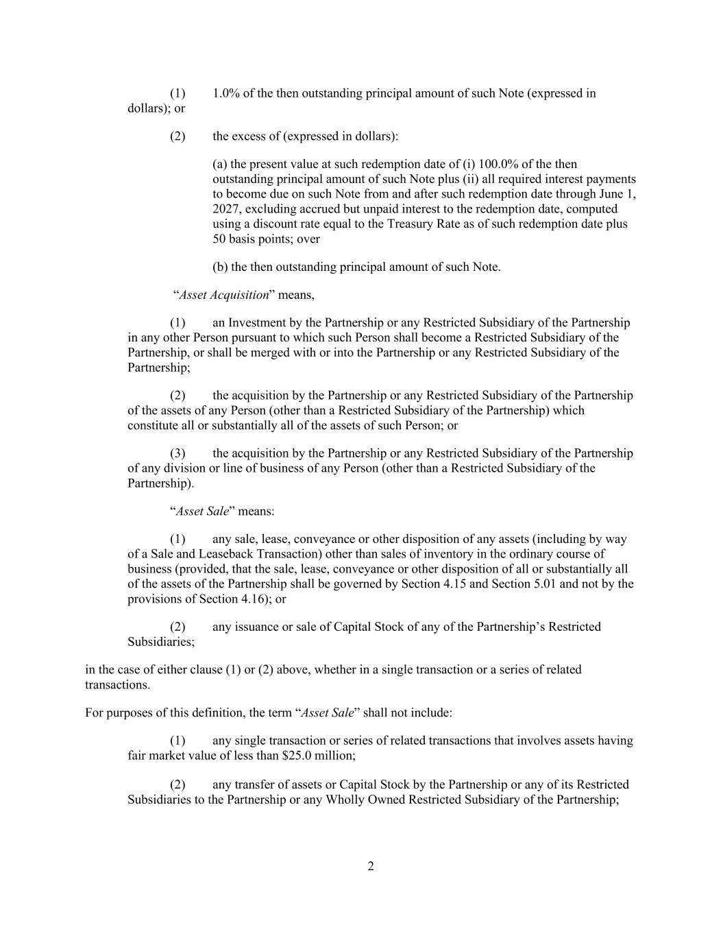 2 (1) 1.0% of the then outstanding principal amount of such Note (expressed in dollars); or (2) the excess of (expressed in dollars): (a) the present value at such redemption date of (i) 100.0% of the then outstanding principal amount of such Note plus (ii) all required interest payments to become due on such Note from and after such redemption date through June 1, 2027, excluding accrued but unpaid interest to the redemption date, computed using a discount rate equal to the Treasury Rate as of such redemption date plus 50 basis points; over (b) the then outstanding principal amount of such Note. “Asset Acquisition” means, (1) an Investment by the Partnership or any Restricted Subsidiary of the Partnership in any other Person pursuant to which such Person shall become a Restricted Subsidiary of the Partnership, or shall be merged with or into the Partnership or any Restricted Subsidiary of the Partnership; (2) the acquisition by the Partnership or any Restricted Subsidiary of the Partnership of the assets of any Person (other than a Restricted Subsidiary of the Partnership) which constitute all or substantially all of the assets of such Person; or (3) the acquisition by the Partnership or any Restricted Subsidiary of the Partnership of any division or line of business of any Person (other than a Restricted Subsidiary of the Partnership). “Asset Sale” means: (1) any sale, lease, conveyance or other disposition of any assets (including by way of a Sale and Leaseback Transaction) other than sales of inventory in the ordinary course of business (provided, that the sale, lease, conveyance or other disposition of all or substantially all of the assets of the Partnership shall be governed by Section 4.15 and Section 5.01 and not by the provisions of Section 4.16); or (2) any issuance or sale of Capital Stock of any of the Partnership’s Restricted Subsidiaries; in the case of either clause (1) or (2) above, whether in a single transaction or a series of related transactions. For purposes of this definition, the term “Asset Sale” shall not include: (1) any single transaction or series of related transactions that involves assets having fair market value of less than $25.0 million; (2) any transfer of assets or Capital Stock by the Partnership or any of its Restricted Subsidiaries to the Partnership or any Wholly Owned Restricted Subsidiary of the Partnership;