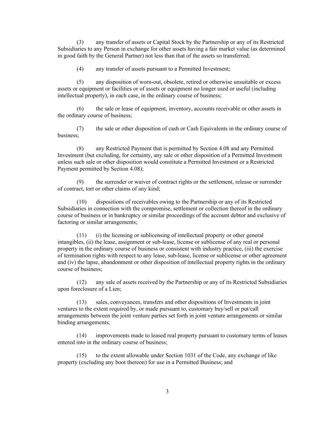 3 (3) any transfer of assets or Capital Stock by the Partnership or any of its Restricted Subsidiaries to any Person in exchange for other assets having a fair market value (as determined in good faith by the General Partner) not less than that of the assets so transferred; (4) any transfer of assets pursuant to a Permitted Investment; (5) any disposition of worn-out, obsolete, retired or otherwise unsuitable or excess assets or equipment or facilities or of assets or equipment no longer used or useful (including intellectual property), in each case, in the ordinary course of business; (6) the sale or lease of equipment, inventory, accounts receivable or other assets in the ordinary course of business; (7) the sale or other disposition of cash or Cash Equivalents in the ordinary course of business; (8) any Restricted Payment that is permitted by Section 4.08 and any Permitted Investment (but excluding, for certainty, any sale or other disposition of a Permitted Investment unless such sale or other disposition would constitute a Permitted Investment or a Restricted Payment permitted by Section 4.08); (9) the surrender or waiver of contract rights or the settlement, release or surrender of contract, tort or other claims of any kind; (10) dispositions of receivables owing to the Partnership or any of its Restricted Subsidiaries in connection with the compromise, settlement or collection thereof in the ordinary course of business or in bankruptcy or similar proceedings of the account debtor and exclusive of factoring or similar arrangements; (11) (i) the licensing or sublicensing of intellectual property or other general intangibles, (ii) the lease, assignment or sub-lease, license or sublicense of any real or personal property in the ordinary course of business or consistent with industry practice, (iii) the exercise of termination rights with respect to any lease, sub-lease, license or sublicense or other agreement and (iv) the lapse, abandonment or other disposition of intellectual property rights in the ordinary course of business; (12) any sale of assets received by the Partnership or any of its Restricted Subsidiaries upon foreclosure of a Lien; (13) sales, conveyances, transfers and other dispositions of Investments in joint ventures to the extent required by, or made pursuant to, customary buy/sell or put/call arrangements between the joint venture parties set forth in joint venture arrangements or similar binding arrangements; (14) improvements made to leased real property pursuant to customary terms of leases entered into in the ordinary course of business; (15) to the extent allowable under Section 1031 of the Code, any exchange of like property (excluding any boot thereon) for use in a Permitted Business; and