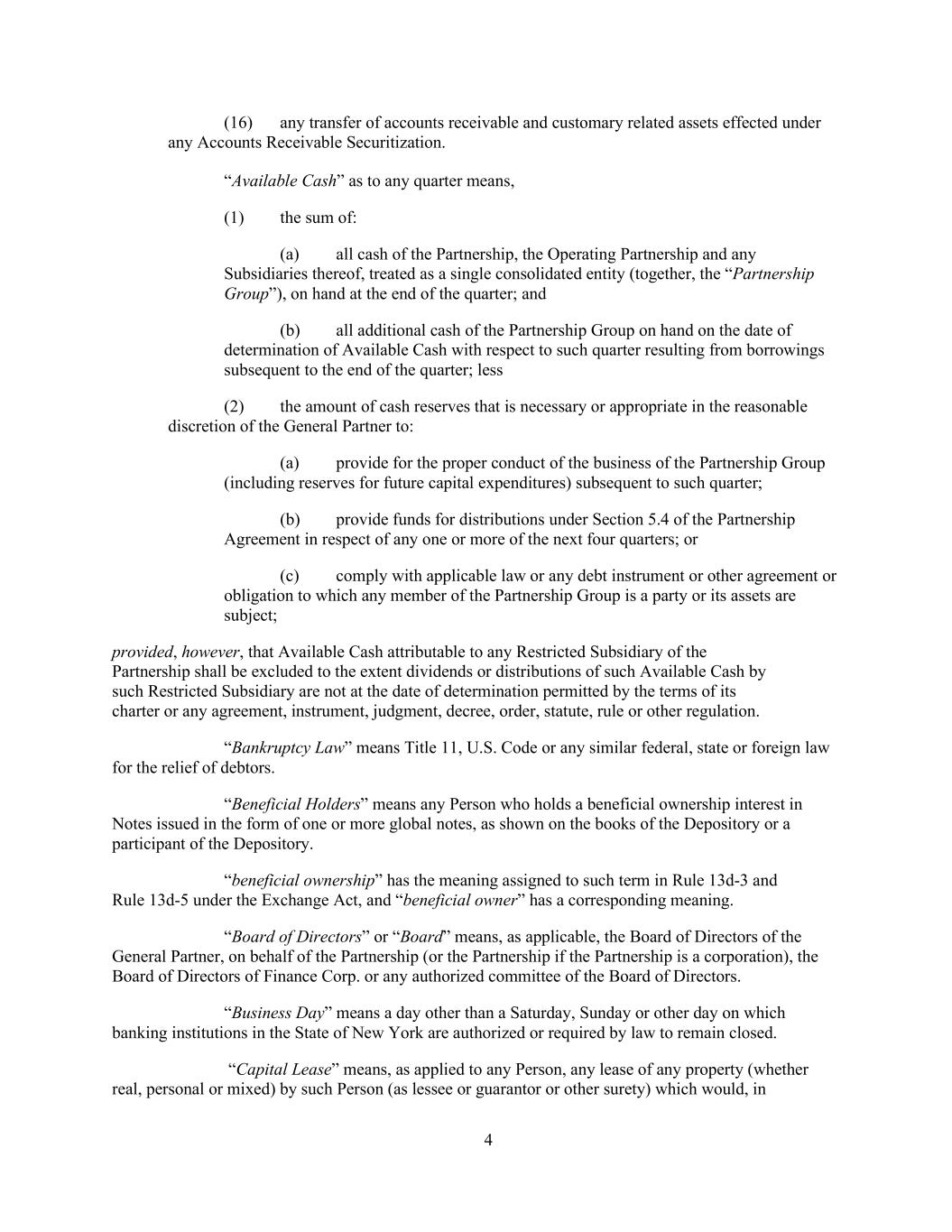 4 (16) any transfer of accounts receivable and customary related assets effected under any Accounts Receivable Securitization. “Available Cash” as to any quarter means, (1) the sum of: (a) all cash of the Partnership, the Operating Partnership and any Subsidiaries thereof, treated as a single consolidated entity (together, the “Partnership Group”), on hand at the end of the quarter; and (b) all additional cash of the Partnership Group on hand on the date of determination of Available Cash with respect to such quarter resulting from borrowings subsequent to the end of the quarter; less (2) the amount of cash reserves that is necessary or appropriate in the reasonable discretion of the General Partner to: (a) provide for the proper conduct of the business of the Partnership Group (including reserves for future capital expenditures) subsequent to such quarter; (b) provide funds for distributions under Section 5.4 of the Partnership Agreement in respect of any one or more of the next four quarters; or (c) comply with applicable law or any debt instrument or other agreement or obligation to which any member of the Partnership Group is a party or its assets are subject; provided, however, that Available Cash attributable to any Restricted Subsidiary of the Partnership shall be excluded to the extent dividends or distributions of such Available Cash by such Restricted Subsidiary are not at the date of determination permitted by the terms of its charter or any agreement, instrument, judgment, decree, order, statute, rule or other regulation. “Bankruptcy Law” means Title 11, U.S. Code or any similar federal, state or foreign law for the relief of debtors. “Beneficial Holders” means any Person who holds a beneficial ownership interest in Notes issued in the form of one or more global notes, as shown on the books of the Depository or a participant of the Depository. “beneficial ownership” has the meaning assigned to such term in Rule 13d-3 and Rule 13d-5 under the Exchange Act, and “beneficial owner” has a corresponding meaning. “Board of Directors” or “Board” means, as applicable, the Board of Directors of the General Partner, on behalf of the Partnership (or the Partnership if the Partnership is a corporation), the Board of Directors of Finance Corp. or any authorized committee of the Board of Directors. “Business Day” means a day other than a Saturday, Sunday or other day on which banking institutions in the State of New York are authorized or required by law to remain closed. “Capital Lease” means, as applied to any Person, any lease of any property (whether real, personal or mixed) by such Person (as lessee or guarantor or other surety) which would, in