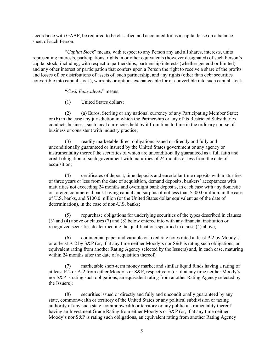 5 accordance with GAAP, be required to be classified and accounted for as a capital lease on a balance sheet of such Person. “Capital Stock” means, with respect to any Person any and all shares, interests, units representing interests, participations, rights in or other equivalents (however designated) of such Person’s capital stock, including, with respect to partnerships, partnership interests (whether general or limited) and any other interest or participation that confers upon a Person the right to receive a share of the profits and losses of, or distributions of assets of, such partnership, and any rights (other than debt securities convertible into capital stock), warrants or options exchangeable for or convertible into such capital stock. “Cash Equivalents” means: (1) United States dollars; (2) (a) Euros, Sterling or any national currency of any Participating Member State; or (b) in the case any jurisdiction in which the Partnership or any of its Restricted Subsidiaries conducts business, such local currencies held by it from time to time in the ordinary course of business or consistent with industry practice; (3) readily marketable direct obligations issued or directly and fully and unconditionally guaranteed or insured by the United States government or any agency or instrumentality thereof the securities of which are unconditionally guaranteed as a full faith and credit obligation of such government with maturities of 24 months or less from the date of acquisition; (4) certificates of deposit, time deposits and eurodollar time deposits with maturities of three years or less from the date of acquisition, demand deposits, bankers’ acceptances with maturities not exceeding 24 months and overnight bank deposits, in each case with any domestic or foreign commercial bank having capital and surplus of not less than $500.0 million, in the case of U.S. banks, and $100.0 million (or the United States dollar equivalent as of the date of determination), in the case of non-U.S. banks; (5) repurchase obligations for underlying securities of the types described in clauses (3) and (4) above or clauses (7) and (8) below entered into with any financial institution or recognized securities dealer meeting the qualifications specified in clause (4) above; (6) commercial paper and variable or fixed rate notes rated at least P-2 by Moody’s or at least A-2 by S&P (or, if at any time neither Moody’s nor S&P is rating such obligations, an equivalent rating from another Rating Agency selected by the Issuers) and, in each case, maturing within 24 months after the date of acquisition thereof; (7) marketable short-term money market and similar liquid funds having a rating of at least P-2 or A-2 from either Moody’s or S&P, respectively (or, if at any time neither Moody’s nor S&P is rating such obligations, an equivalent rating from another Rating Agency selected by the Issuers); (8) securities issued or directly and fully and unconditionally guaranteed by any state, commonwealth or territory of the United States or any political subdivision or taxing authority of any such state, commonwealth or territory or any public instrumentality thereof having an Investment Grade Rating from either Moody’s or S&P (or, if at any time neither Moody’s nor S&P is rating such obligations, an equivalent rating from another Rating Agency