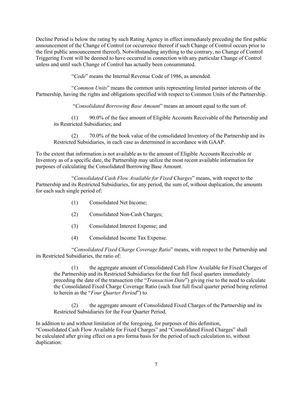 7 Decline Period is below the rating by such Rating Agency in effect immediately preceding the first public announcement of the Change of Control (or occurrence thereof if such Change of Control occurs prior to the first public announcement thereof). Notwithstanding anything to the contrary, no Change of Control Triggering Event will be deemed to have occurred in connection with any particular Change of Control unless and until such Change of Control has actually been consummated. “Code” means the Internal Revenue Code of 1986, as amended. “Common Units” means the common units representing limited partner interests of the Partnership, having the rights and obligations specified with respect to Common Units of the Partnership. “Consolidated Borrowing Base Amount” means an amount equal to the sum of: (1) 90.0% of the face amount of Eligible Accounts Receivable of the Partnership and its Restricted Subsidiaries; and (2) 70.0% of the book value of the consolidated Inventory of the Partnership and its Restricted Subsidiaries, in each case as determined in accordance with GAAP. To the extent that information is not available as to the amount of Eligible Accounts Receivable or Inventory as of a specific date, the Partnership may utilize the most recent available information for purposes of calculating the Consolidated Borrowing Base Amount. “Consolidated Cash Flow Available for Fixed Charges” means, with respect to the Partnership and its Restricted Subsidiaries, for any period, the sum of, without duplication, the amounts for each such single period of: (1) Consolidated Net Income; (2) Consolidated Non-Cash Charges; (3) Consolidated Interest Expense; and (4) Consolidated Income Tax Expense. “Consolidated Fixed Charge Coverage Ratio” means, with respect to the Partnership and its Restricted Subsidiaries, the ratio of: (1) the aggregate amount of Consolidated Cash Flow Available for Fixed Charges of the Partnership and its Restricted Subsidiaries for the four full fiscal quarters immediately preceding the date of the transaction (the “Transaction Date”) giving rise to the need to calculate the Consolidated Fixed Charge Coverage Ratio (such four full fiscal quarter period being referred to herein as the “Four Quarter Period”) to (2) the aggregate amount of Consolidated Fixed Charges of the Partnership and its Restricted Subsidiaries for the Four Quarter Period. In addition to and without limitation of the foregoing, for purposes of this definition, “Consolidated Cash Flow Available for Fixed Charges” and “Consolidated Fixed Charges” shall be calculated after giving effect on a pro forma basis for the period of such calculation to, without duplication: