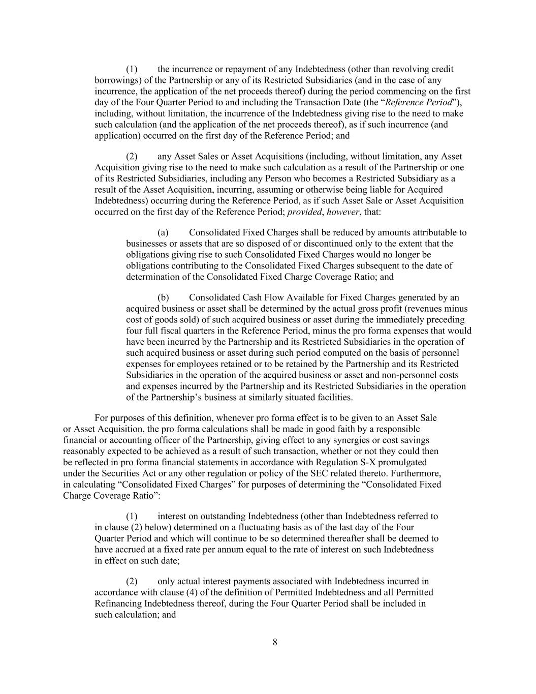 8 (1) the incurrence or repayment of any Indebtedness (other than revolving credit borrowings) of the Partnership or any of its Restricted Subsidiaries (and in the case of any incurrence, the application of the net proceeds thereof) during the period commencing on the first day of the Four Quarter Period to and including the Transaction Date (the “Reference Period”), including, without limitation, the incurrence of the Indebtedness giving rise to the need to make such calculation (and the application of the net proceeds thereof), as if such incurrence (and application) occurred on the first day of the Reference Period; and (2) any Asset Sales or Asset Acquisitions (including, without limitation, any Asset Acquisition giving rise to the need to make such calculation as a result of the Partnership or one of its Restricted Subsidiaries, including any Person who becomes a Restricted Subsidiary as a result of the Asset Acquisition, incurring, assuming or otherwise being liable for Acquired Indebtedness) occurring during the Reference Period, as if such Asset Sale or Asset Acquisition occurred on the first day of the Reference Period; provided, however, that: (a) Consolidated Fixed Charges shall be reduced by amounts attributable to businesses or assets that are so disposed of or discontinued only to the extent that the obligations giving rise to such Consolidated Fixed Charges would no longer be obligations contributing to the Consolidated Fixed Charges subsequent to the date of determination of the Consolidated Fixed Charge Coverage Ratio; and (b) Consolidated Cash Flow Available for Fixed Charges generated by an acquired business or asset shall be determined by the actual gross profit (revenues minus cost of goods sold) of such acquired business or asset during the immediately preceding four full fiscal quarters in the Reference Period, minus the pro forma expenses that would have been incurred by the Partnership and its Restricted Subsidiaries in the operation of such acquired business or asset during such period computed on the basis of personnel expenses for employees retained or to be retained by the Partnership and its Restricted Subsidiaries in the operation of the acquired business or asset and non-personnel costs and expenses incurred by the Partnership and its Restricted Subsidiaries in the operation of the Partnership’s business at similarly situated facilities. For purposes of this definition, whenever pro forma effect is to be given to an Asset Sale or Asset Acquisition, the pro forma calculations shall be made in good faith by a responsible financial or accounting officer of the Partnership, giving effect to any synergies or cost savings reasonably expected to be achieved as a result of such transaction, whether or not they could then be reflected in pro forma financial statements in accordance with Regulation S-X promulgated under the Securities Act or any other regulation or policy of the SEC related thereto. Furthermore, in calculating “Consolidated Fixed Charges” for purposes of determining the “Consolidated Fixed Charge Coverage Ratio”: (1) interest on outstanding Indebtedness (other than Indebtedness referred to in clause (2) below) determined on a fluctuating basis as of the last day of the Four Quarter Period and which will continue to be so determined thereafter shall be deemed to have accrued at a fixed rate per annum equal to the rate of interest on such Indebtedness in effect on such date; (2) only actual interest payments associated with Indebtedness incurred in accordance with clause (4) of the definition of Permitted Indebtedness and all Permitted Refinancing Indebtedness thereof, during the Four Quarter Period shall be included in such calculation; and
