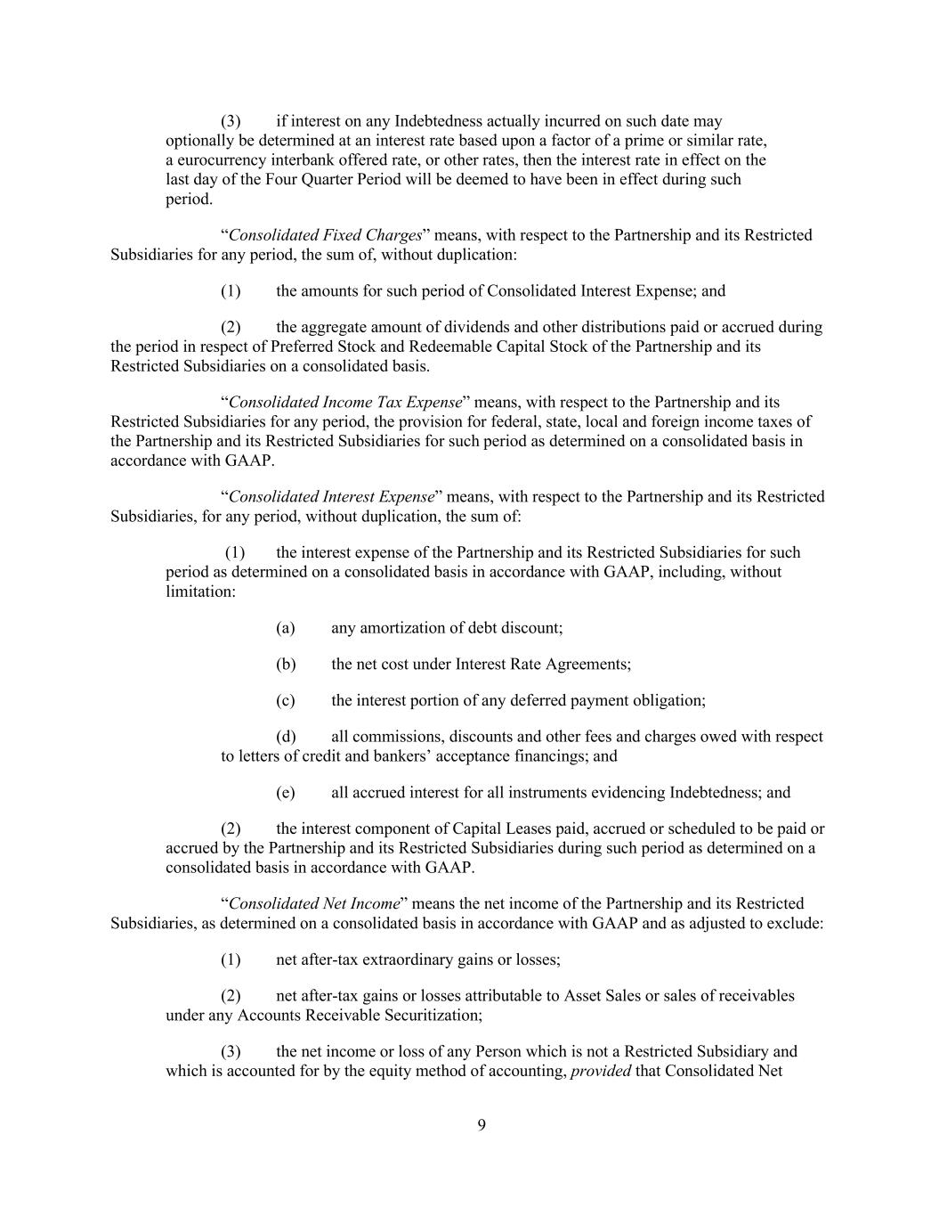 9 (3) if interest on any Indebtedness actually incurred on such date may optionally be determined at an interest rate based upon a factor of a prime or similar rate, a eurocurrency interbank offered rate, or other rates, then the interest rate in effect on the last day of the Four Quarter Period will be deemed to have been in effect during such period. “Consolidated Fixed Charges” means, with respect to the Partnership and its Restricted Subsidiaries for any period, the sum of, without duplication: (1) the amounts for such period of Consolidated Interest Expense; and (2) the aggregate amount of dividends and other distributions paid or accrued during the period in respect of Preferred Stock and Redeemable Capital Stock of the Partnership and its Restricted Subsidiaries on a consolidated basis. “Consolidated Income Tax Expense” means, with respect to the Partnership and its Restricted Subsidiaries for any period, the provision for federal, state, local and foreign income taxes of the Partnership and its Restricted Subsidiaries for such period as determined on a consolidated basis in accordance with GAAP. “Consolidated Interest Expense” means, with respect to the Partnership and its Restricted Subsidiaries, for any period, without duplication, the sum of: (1) the interest expense of the Partnership and its Restricted Subsidiaries for such period as determined on a consolidated basis in accordance with GAAP, including, without limitation: (a) any amortization of debt discount; (b) the net cost under Interest Rate Agreements; (c) the interest portion of any deferred payment obligation; (d) all commissions, discounts and other fees and charges owed with respect to letters of credit and bankers’ acceptance financings; and (e) all accrued interest for all instruments evidencing Indebtedness; and (2) the interest component of Capital Leases paid, accrued or scheduled to be paid or accrued by the Partnership and its Restricted Subsidiaries during such period as determined on a consolidated basis in accordance with GAAP. “Consolidated Net Income” means the net income of the Partnership and its Restricted Subsidiaries, as determined on a consolidated basis in accordance with GAAP and as adjusted to exclude: (1) net after-tax extraordinary gains or losses; (2) net after-tax gains or losses attributable to Asset Sales or sales of receivables under any Accounts Receivable Securitization; (3) the net income or loss of any Person which is not a Restricted Subsidiary and which is accounted for by the equity method of accounting, provided that Consolidated Net