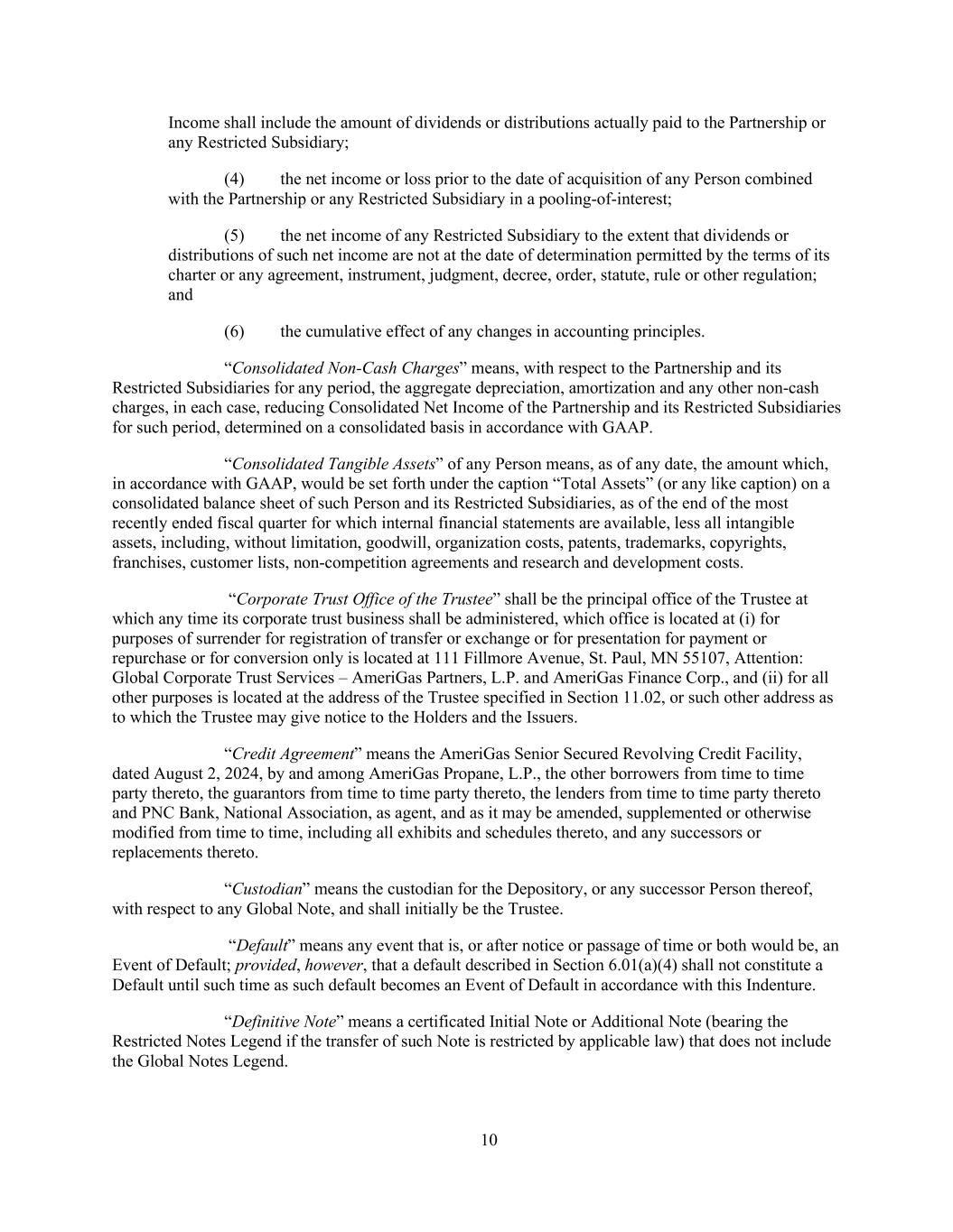 10 Income shall include the amount of dividends or distributions actually paid to the Partnership or any Restricted Subsidiary; (4) the net income or loss prior to the date of acquisition of any Person combined with the Partnership or any Restricted Subsidiary in a pooling-of-interest; (5) the net income of any Restricted Subsidiary to the extent that dividends or distributions of such net income are not at the date of determination permitted by the terms of its charter or any agreement, instrument, judgment, decree, order, statute, rule or other regulation; and (6) the cumulative effect of any changes in accounting principles. “Consolidated Non-Cash Charges” means, with respect to the Partnership and its Restricted Subsidiaries for any period, the aggregate depreciation, amortization and any other non-cash charges, in each case, reducing Consolidated Net Income of the Partnership and its Restricted Subsidiaries for such period, determined on a consolidated basis in accordance with GAAP. “Consolidated Tangible Assets” of any Person means, as of any date, the amount which, in accordance with GAAP, would be set forth under the caption “Total Assets” (or any like caption) on a consolidated balance sheet of such Person and its Restricted Subsidiaries, as of the end of the most recently ended fiscal quarter for which internal financial statements are available, less all intangible assets, including, without limitation, goodwill, organization costs, patents, trademarks, copyrights, franchises, customer lists, non-competition agreements and research and development costs. “Corporate Trust Office of the Trustee” shall be the principal office of the Trustee at which any time its corporate trust business shall be administered, which office is located at (i) for purposes of surrender for registration of transfer or exchange or for presentation for payment or repurchase or for conversion only is located at 111 Fillmore Avenue, St. Paul, MN 55107, Attention: Global Corporate Trust Services – AmeriGas Partners, L.P. and AmeriGas Finance Corp., and (ii) for all other purposes is located at the address of the Trustee specified in Section 11.02, or such other address as to which the Trustee may give notice to the Holders and the Issuers. “Credit Agreement” means the AmeriGas Senior Secured Revolving Credit Facility, dated August 2, 2024, by and among AmeriGas Propane, L.P., the other borrowers from time to time party thereto, the guarantors from time to time party thereto, the lenders from time to time party thereto and PNC Bank, National Association, as agent, and as it may be amended, supplemented or otherwise modified from time to time, including all exhibits and schedules thereto, and any successors or replacements thereto. “Custodian” means the custodian for the Depository, or any successor Person thereof, with respect to any Global Note, and shall initially be the Trustee. “Default” means any event that is, or after notice or passage of time or both would be, an Event of Default; provided, however, that a default described in Section 6.01(a)(4) shall not constitute a Default until such time as such default becomes an Event of Default in accordance with this Indenture. “Definitive Note” means a certificated Initial Note or Additional Note (bearing the Restricted Notes Legend if the transfer of such Note is restricted by applicable law) that does not include the Global Notes Legend.