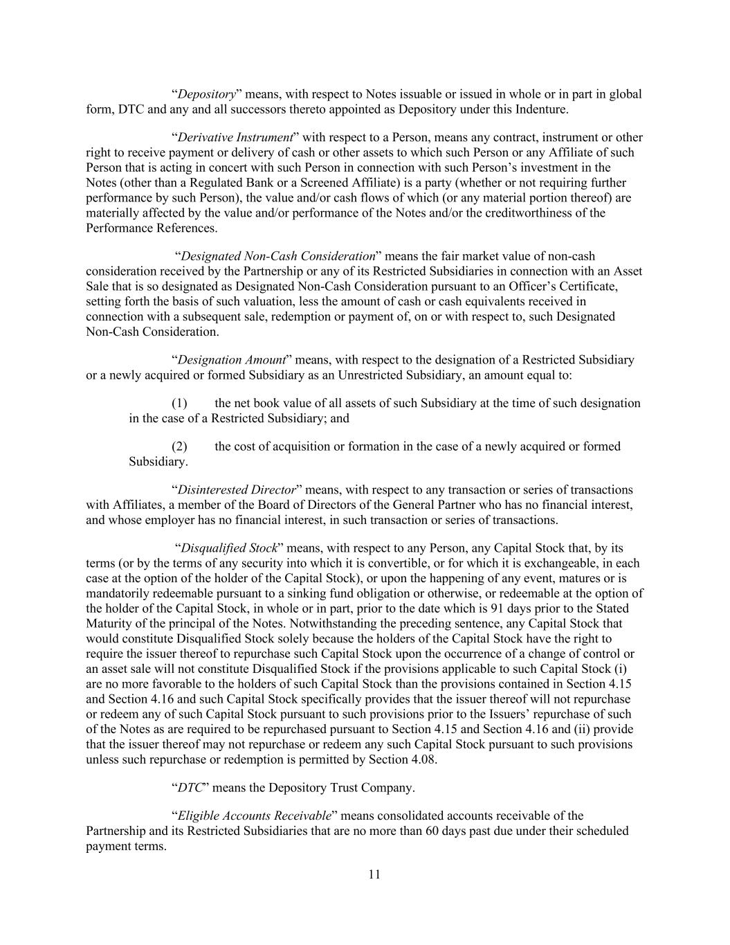 11 “Depository” means, with respect to Notes issuable or issued in whole or in part in global form, DTC and any and all successors thereto appointed as Depository under this Indenture. “Derivative Instrument” with respect to a Person, means any contract, instrument or other right to receive payment or delivery of cash or other assets to which such Person or any Affiliate of such Person that is acting in concert with such Person in connection with such Person’s investment in the Notes (other than a Regulated Bank or a Screened Affiliate) is a party (whether or not requiring further performance by such Person), the value and/or cash flows of which (or any material portion thereof) are materially affected by the value and/or performance of the Notes and/or the creditworthiness of the Performance References. “Designated Non-Cash Consideration” means the fair market value of non-cash consideration received by the Partnership or any of its Restricted Subsidiaries in connection with an Asset Sale that is so designated as Designated Non-Cash Consideration pursuant to an Officer’s Certificate, setting forth the basis of such valuation, less the amount of cash or cash equivalents received in connection with a subsequent sale, redemption or payment of, on or with respect to, such Designated Non-Cash Consideration. “Designation Amount” means, with respect to the designation of a Restricted Subsidiary or a newly acquired or formed Subsidiary as an Unrestricted Subsidiary, an amount equal to: (1) the net book value of all assets of such Subsidiary at the time of such designation in the case of a Restricted Subsidiary; and (2) the cost of acquisition or formation in the case of a newly acquired or formed Subsidiary. “Disinterested Director” means, with respect to any transaction or series of transactions with Affiliates, a member of the Board of Directors of the General Partner who has no financial interest, and whose employer has no financial interest, in such transaction or series of transactions. “Disqualified Stock” means, with respect to any Person, any Capital Stock that, by its terms (or by the terms of any security into which it is convertible, or for which it is exchangeable, in each case at the option of the holder of the Capital Stock), or upon the happening of any event, matures or is mandatorily redeemable pursuant to a sinking fund obligation or otherwise, or redeemable at the option of the holder of the Capital Stock, in whole or in part, prior to the date which is 91 days prior to the Stated Maturity of the principal of the Notes. Notwithstanding the preceding sentence, any Capital Stock that would constitute Disqualified Stock solely because the holders of the Capital Stock have the right to require the issuer thereof to repurchase such Capital Stock upon the occurrence of a change of control or an asset sale will not constitute Disqualified Stock if the provisions applicable to such Capital Stock (i) are no more favorable to the holders of such Capital Stock than the provisions contained in Section 4.15 and Section 4.16 and such Capital Stock specifically provides that the issuer thereof will not repurchase or redeem any of such Capital Stock pursuant to such provisions prior to the Issuers’ repurchase of such of the Notes as are required to be repurchased pursuant to Section 4.15 and Section 4.16 and (ii) provide that the issuer thereof may not repurchase or redeem any such Capital Stock pursuant to such provisions unless such repurchase or redemption is permitted by Section 4.08. “DTC” means the Depository Trust Company. “Eligible Accounts Receivable” means consolidated accounts receivable of the Partnership and its Restricted Subsidiaries that are no more than 60 days past due under their scheduled payment terms.