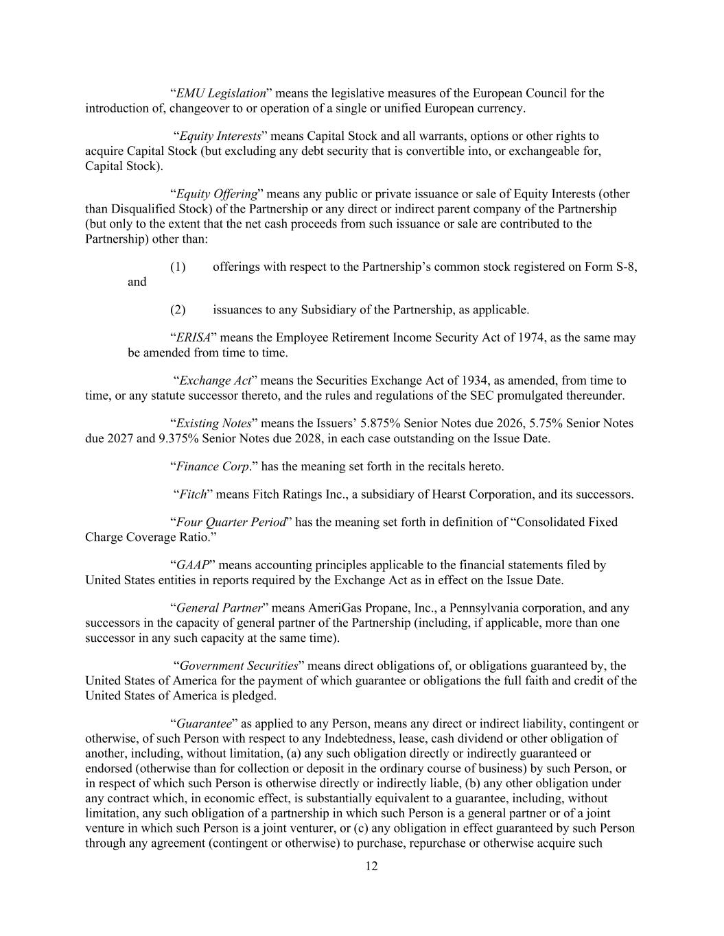 12 “EMU Legislation” means the legislative measures of the European Council for the introduction of, changeover to or operation of a single or unified European currency. “Equity Interests” means Capital Stock and all warrants, options or other rights to acquire Capital Stock (but excluding any debt security that is convertible into, or exchangeable for, Capital Stock). “Equity Offering” means any public or private issuance or sale of Equity Interests (other than Disqualified Stock) of the Partnership or any direct or indirect parent company of the Partnership (but only to the extent that the net cash proceeds from such issuance or sale are contributed to the Partnership) other than: (1) offerings with respect to the Partnership’s common stock registered on Form S-8, and (2) issuances to any Subsidiary of the Partnership, as applicable. “ERISA” means the Employee Retirement Income Security Act of 1974, as the same may be amended from time to time. “Exchange Act” means the Securities Exchange Act of 1934, as amended, from time to time, or any statute successor thereto, and the rules and regulations of the SEC promulgated thereunder. “Existing Notes” means the Issuers’ 5.875% Senior Notes due 2026, 5.75% Senior Notes due 2027 and 9.375% Senior Notes due 2028, in each case outstanding on the Issue Date. “Finance Corp.” has the meaning set forth in the recitals hereto. “Fitch” means Fitch Ratings Inc., a subsidiary of Hearst Corporation, and its successors. “Four Quarter Period” has the meaning set forth in definition of “Consolidated Fixed Charge Coverage Ratio.” “GAAP” means accounting principles applicable to the financial statements filed by United States entities in reports required by the Exchange Act as in effect on the Issue Date. “General Partner” means AmeriGas Propane, Inc., a Pennsylvania corporation, and any successors in the capacity of general partner of the Partnership (including, if applicable, more than one successor in any such capacity at the same time). “Government Securities” means direct obligations of, or obligations guaranteed by, the United States of America for the payment of which guarantee or obligations the full faith and credit of the United States of America is pledged. “Guarantee” as applied to any Person, means any direct or indirect liability, contingent or otherwise, of such Person with respect to any Indebtedness, lease, cash dividend or other obligation of another, including, without limitation, (a) any such obligation directly or indirectly guaranteed or endorsed (otherwise than for collection or deposit in the ordinary course of business) by such Person, or in respect of which such Person is otherwise directly or indirectly liable, (b) any other obligation under any contract which, in economic effect, is substantially equivalent to a guarantee, including, without limitation, any such obligation of a partnership in which such Person is a general partner or of a joint venture in which such Person is a joint venturer, or (c) any obligation in effect guaranteed by such Person through any agreement (contingent or otherwise) to purchase, repurchase or otherwise acquire such