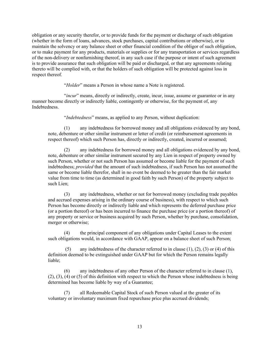 13 obligation or any security therefor, or to provide funds for the payment or discharge of such obligation (whether in the form of loans, advances, stock purchases, capital contributions or otherwise), or to maintain the solvency or any balance sheet or other financial condition of the obligor of such obligation, or to make payment for any products, materials or supplies or for any transportation or services regardless of the non-delivery or nonfurnishing thereof, in any such case if the purpose or intent of such agreement is to provide assurance that such obligation will be paid or discharged, or that any agreements relating thereto will be complied with, or that the holders of such obligation will be protected against loss in respect thereof. “Holder” means a Person in whose name a Note is registered. “incur” means, directly or indirectly, create, incur, issue, assume or guarantee or in any manner become directly or indirectly liable, contingently or otherwise, for the payment of, any Indebtedness. “Indebtedness” means, as applied to any Person, without duplication: (1) any indebtedness for borrowed money and all obligations evidenced by any bond, note, debenture or other similar instrument or letter of credit (or reimbursement agreements in respect thereof) which such Person has, directly or indirectly, created, incurred or assumed; (2) any indebtedness for borrowed money and all obligations evidenced by any bond, note, debenture or other similar instrument secured by any Lien in respect of property owned by such Person, whether or not such Person has assumed or become liable for the payment of such indebtedness; provided that the amount of such indebtedness, if such Person has not assumed the same or become liable therefor, shall in no event be deemed to be greater than the fair market value from time to time (as determined in good faith by such Person) of the property subject to such Lien; (3) any indebtedness, whether or not for borrowed money (excluding trade payables and accrued expenses arising in the ordinary course of business), with respect to which such Person has become directly or indirectly liable and which represents the deferred purchase price (or a portion thereof) or has been incurred to finance the purchase price (or a portion thereof) of any property or service or business acquired by such Person, whether by purchase, consolidation, merger or otherwise; (4) the principal component of any obligations under Capital Leases to the extent such obligations would, in accordance with GAAP, appear on a balance sheet of such Person; (5) any indebtedness of the character referred to in clause (1), (2), (3) or (4) of this definition deemed to be extinguished under GAAP but for which the Person remains legally liable; (6) any indebtedness of any other Person of the character referred to in clause (1), (2), (3), (4) or (5) of this definition with respect to which the Person whose indebtedness is being determined has become liable by way of a Guarantee; (7) all Redeemable Capital Stock of such Person valued at the greater of its voluntary or involuntary maximum fixed repurchase price plus accrued dividends;