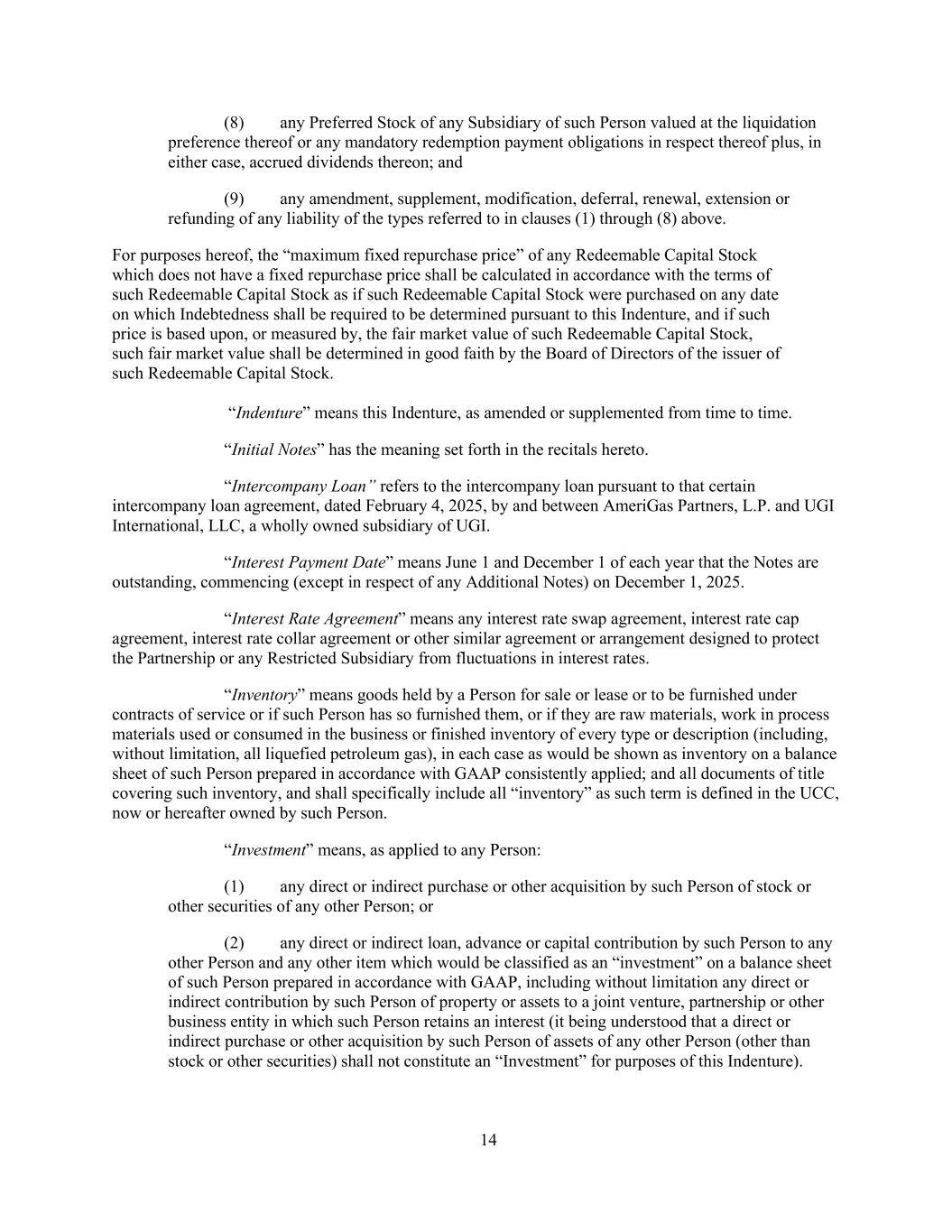 14 (8) any Preferred Stock of any Subsidiary of such Person valued at the liquidation preference thereof or any mandatory redemption payment obligations in respect thereof plus, in either case, accrued dividends thereon; and (9) any amendment, supplement, modification, deferral, renewal, extension or refunding of any liability of the types referred to in clauses (1) through (8) above. For purposes hereof, the “maximum fixed repurchase price” of any Redeemable Capital Stock which does not have a fixed repurchase price shall be calculated in accordance with the terms of such Redeemable Capital Stock as if such Redeemable Capital Stock were purchased on any date on which Indebtedness shall be required to be determined pursuant to this Indenture, and if such price is based upon, or measured by, the fair market value of such Redeemable Capital Stock, such fair market value shall be determined in good faith by the Board of Directors of the issuer of such Redeemable Capital Stock. “Indenture” means this Indenture, as amended or supplemented from time to time. “Initial Notes” has the meaning set forth in the recitals hereto. “Intercompany Loan” refers to the intercompany loan pursuant to that certain intercompany loan agreement, dated February 4, 2025, by and between AmeriGas Partners, L.P. and UGI International, LLC, a wholly owned subsidiary of UGI. “Interest Payment Date” means June 1 and December 1 of each year that the Notes are outstanding, commencing (except in respect of any Additional Notes) on December 1, 2025. “Interest Rate Agreement” means any interest rate swap agreement, interest rate cap agreement, interest rate collar agreement or other similar agreement or arrangement designed to protect the Partnership or any Restricted Subsidiary from fluctuations in interest rates. “Inventory” means goods held by a Person for sale or lease or to be furnished under contracts of service or if such Person has so furnished them, or if they are raw materials, work in process materials used or consumed in the business or finished inventory of every type or description (including, without limitation, all liquefied petroleum gas), in each case as would be shown as inventory on a balance sheet of such Person prepared in accordance with GAAP consistently applied; and all documents of title covering such inventory, and shall specifically include all “inventory” as such term is defined in the UCC, now or hereafter owned by such Person. “Investment” means, as applied to any Person: (1) any direct or indirect purchase or other acquisition by such Person of stock or other securities of any other Person; or (2) any direct or indirect loan, advance or capital contribution by such Person to any other Person and any other item which would be classified as an “investment” on a balance sheet of such Person prepared in accordance with GAAP, including without limitation any direct or indirect contribution by such Person of property or assets to a joint venture, partnership or other business entity in which such Person retains an interest (it being understood that a direct or indirect purchase or other acquisition by such Person of assets of any other Person (other than stock or other securities) shall not constitute an “Investment” for purposes of this Indenture).