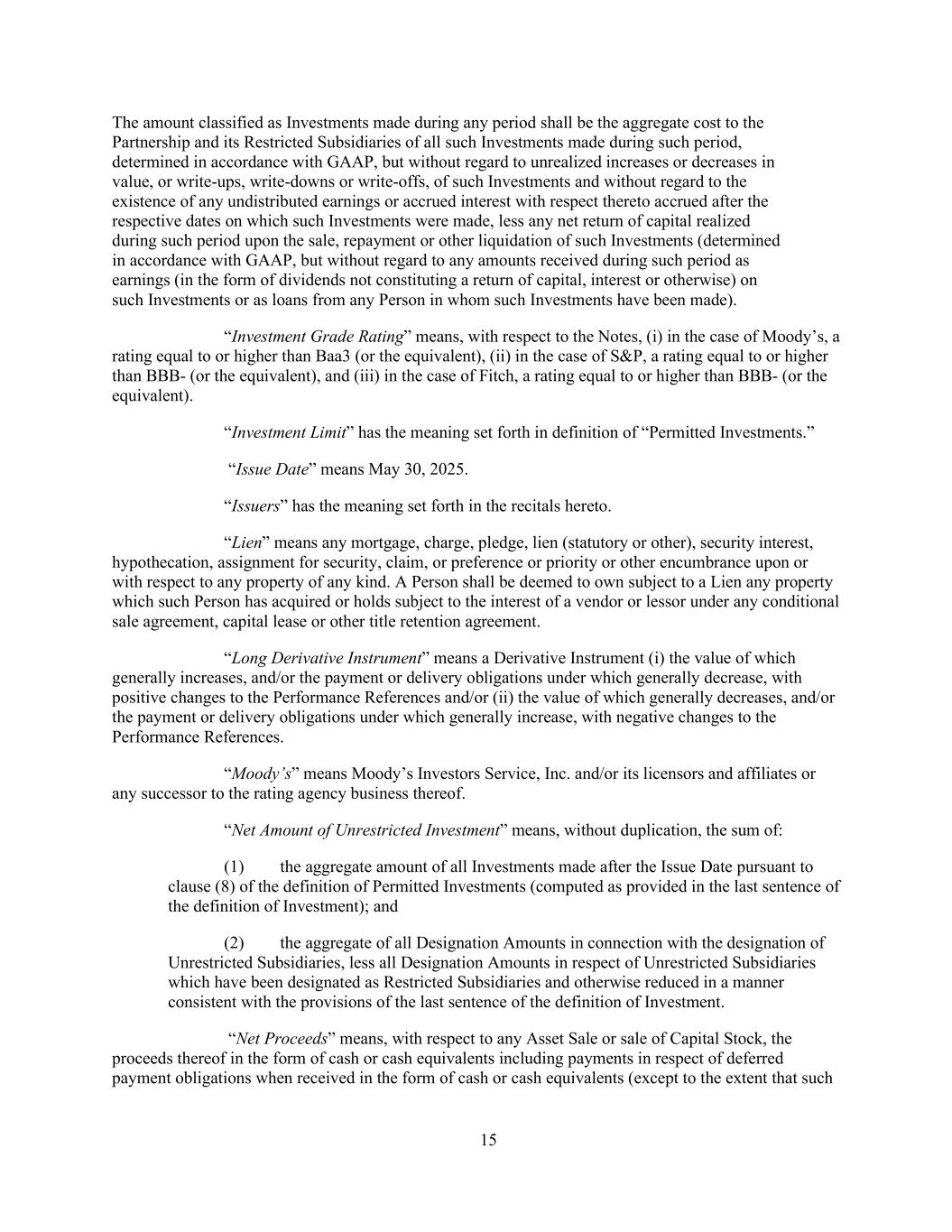 15 The amount classified as Investments made during any period shall be the aggregate cost to the Partnership and its Restricted Subsidiaries of all such Investments made during such period, determined in accordance with GAAP, but without regard to unrealized increases or decreases in value, or write-ups, write-downs or write-offs, of such Investments and without regard to the existence of any undistributed earnings or accrued interest with respect thereto accrued after the respective dates on which such Investments were made, less any net return of capital realized during such period upon the sale, repayment or other liquidation of such Investments (determined in accordance with GAAP, but without regard to any amounts received during such period as earnings (in the form of dividends not constituting a return of capital, interest or otherwise) on such Investments or as loans from any Person in whom such Investments have been made). “Investment Grade Rating” means, with respect to the Notes, (i) in the case of Moody’s, a rating equal to or higher than Baa3 (or the equivalent), (ii) in the case of S&P, a rating equal to or higher than BBB- (or the equivalent), and (iii) in the case of Fitch, a rating equal to or higher than BBB- (or the equivalent). “Investment Limit” has the meaning set forth in definition of “Permitted Investments.” “Issue Date” means May 30, 2025. “Issuers” has the meaning set forth in the recitals hereto. “Lien” means any mortgage, charge, pledge, lien (statutory or other), security interest, hypothecation, assignment for security, claim, or preference or priority or other encumbrance upon or with respect to any property of any kind. A Person shall be deemed to own subject to a Lien any property which such Person has acquired or holds subject to the interest of a vendor or lessor under any conditional sale agreement, capital lease or other title retention agreement. “Long Derivative Instrument” means a Derivative Instrument (i) the value of which generally increases, and/or the payment or delivery obligations under which generally decrease, with positive changes to the Performance References and/or (ii) the value of which generally decreases, and/or the payment or delivery obligations under which generally increase, with negative changes to the Performance References. “Moody’s” means Moody’s Investors Service, Inc. and/or its licensors and affiliates or any successor to the rating agency business thereof. “Net Amount of Unrestricted Investment” means, without duplication, the sum of: (1) the aggregate amount of all Investments made after the Issue Date pursuant to clause (8) of the definition of Permitted Investments (computed as provided in the last sentence of the definition of Investment); and (2) the aggregate of all Designation Amounts in connection with the designation of Unrestricted Subsidiaries, less all Designation Amounts in respect of Unrestricted Subsidiaries which have been designated as Restricted Subsidiaries and otherwise reduced in a manner consistent with the provisions of the last sentence of the definition of Investment. “Net Proceeds” means, with respect to any Asset Sale or sale of Capital Stock, the proceeds thereof in the form of cash or cash equivalents including payments in respect of deferred payment obligations when received in the form of cash or cash equivalents (except to the extent that such