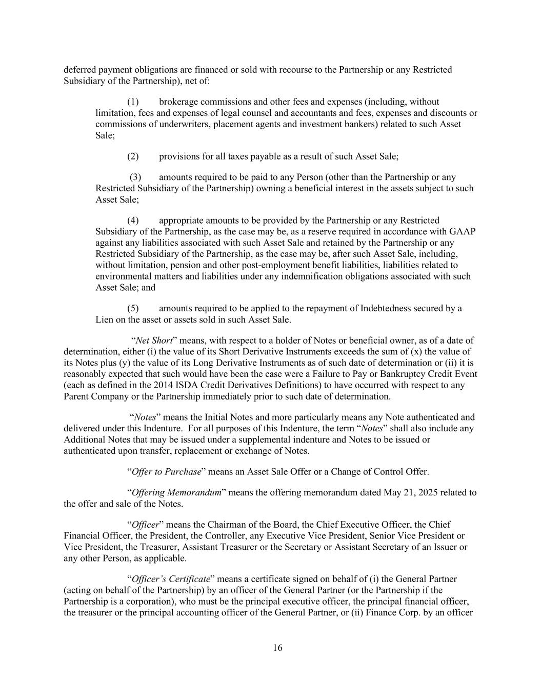 16 deferred payment obligations are financed or sold with recourse to the Partnership or any Restricted Subsidiary of the Partnership), net of: (1) brokerage commissions and other fees and expenses (including, without limitation, fees and expenses of legal counsel and accountants and fees, expenses and discounts or commissions of underwriters, placement agents and investment bankers) related to such Asset Sale; (2) provisions for all taxes payable as a result of such Asset Sale; (3) amounts required to be paid to any Person (other than the Partnership or any Restricted Subsidiary of the Partnership) owning a beneficial interest in the assets subject to such Asset Sale; (4) appropriate amounts to be provided by the Partnership or any Restricted Subsidiary of the Partnership, as the case may be, as a reserve required in accordance with GAAP against any liabilities associated with such Asset Sale and retained by the Partnership or any Restricted Subsidiary of the Partnership, as the case may be, after such Asset Sale, including, without limitation, pension and other post-employment benefit liabilities, liabilities related to environmental matters and liabilities under any indemnification obligations associated with such Asset Sale; and (5) amounts required to be applied to the repayment of Indebtedness secured by a Lien on the asset or assets sold in such Asset Sale. “Net Short” means, with respect to a holder of Notes or beneficial owner, as of a date of determination, either (i) the value of its Short Derivative Instruments exceeds the sum of (x) the value of its Notes plus (y) the value of its Long Derivative Instruments as of such date of determination or (ii) it is reasonably expected that such would have been the case were a Failure to Pay or Bankruptcy Credit Event (each as defined in the 2014 ISDA Credit Derivatives Definitions) to have occurred with respect to any Parent Company or the Partnership immediately prior to such date of determination. “Notes” means the Initial Notes and more particularly means any Note authenticated and delivered under this Indenture. For all purposes of this Indenture, the term “Notes” shall also include any Additional Notes that may be issued under a supplemental indenture and Notes to be issued or authenticated upon transfer, replacement or exchange of Notes. “Offer to Purchase” means an Asset Sale Offer or a Change of Control Offer. “Offering Memorandum” means the offering memorandum dated May 21, 2025 related to the offer and sale of the Notes. “Officer” means the Chairman of the Board, the Chief Executive Officer, the Chief Financial Officer, the President, the Controller, any Executive Vice President, Senior Vice President or Vice President, the Treasurer, Assistant Treasurer or the Secretary or Assistant Secretary of an Issuer or any other Person, as applicable. “Officer’s Certificate” means a certificate signed on behalf of (i) the General Partner (acting on behalf of the Partnership) by an officer of the General Partner (or the Partnership if the Partnership is a corporation), who must be the principal executive officer, the principal financial officer, the treasurer or the principal accounting officer of the General Partner, or (ii) Finance Corp. by an officer