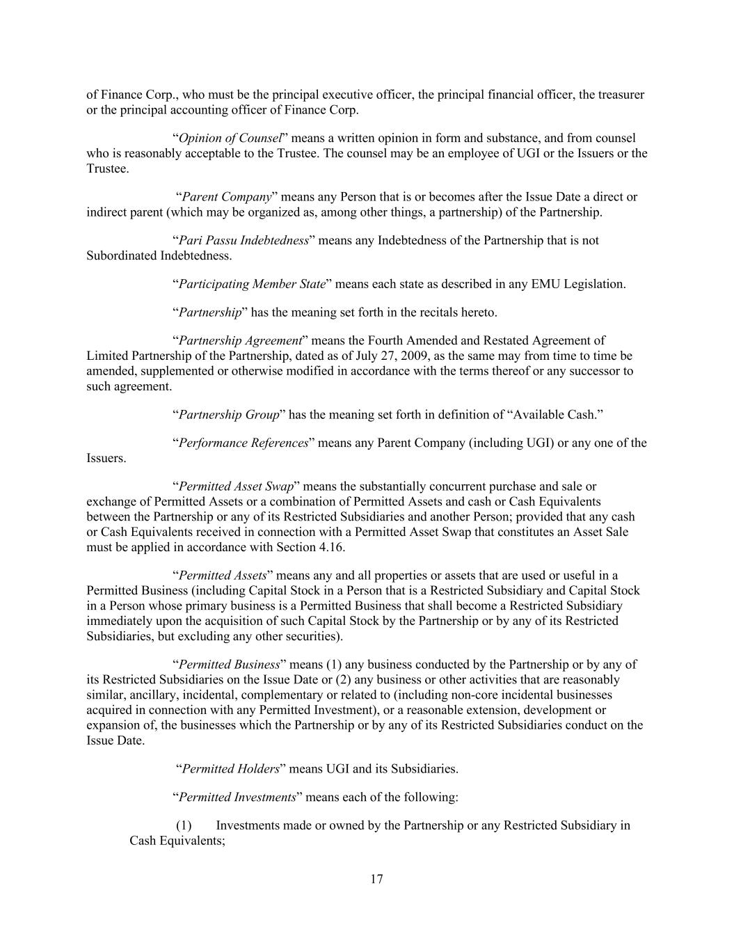 17 of Finance Corp., who must be the principal executive officer, the principal financial officer, the treasurer or the principal accounting officer of Finance Corp. “Opinion of Counsel” means a written opinion in form and substance, and from counsel who is reasonably acceptable to the Trustee. The counsel may be an employee of UGI or the Issuers or the Trustee. “Parent Company” means any Person that is or becomes after the Issue Date a direct or indirect parent (which may be organized as, among other things, a partnership) of the Partnership. “Pari Passu Indebtedness” means any Indebtedness of the Partnership that is not Subordinated Indebtedness. “Participating Member State” means each state as described in any EMU Legislation. “Partnership” has the meaning set forth in the recitals hereto. “Partnership Agreement” means the Fourth Amended and Restated Agreement of Limited Partnership of the Partnership, dated as of July 27, 2009, as the same may from time to time be amended, supplemented or otherwise modified in accordance with the terms thereof or any successor to such agreement. “Partnership Group” has the meaning set forth in definition of “Available Cash.” “Performance References” means any Parent Company (including UGI) or any one of the Issuers. “Permitted Asset Swap” means the substantially concurrent purchase and sale or exchange of Permitted Assets or a combination of Permitted Assets and cash or Cash Equivalents between the Partnership or any of its Restricted Subsidiaries and another Person; provided that any cash or Cash Equivalents received in connection with a Permitted Asset Swap that constitutes an Asset Sale must be applied in accordance with Section 4.16. “Permitted Assets” means any and all properties or assets that are used or useful in a Permitted Business (including Capital Stock in a Person that is a Restricted Subsidiary and Capital Stock in a Person whose primary business is a Permitted Business that shall become a Restricted Subsidiary immediately upon the acquisition of such Capital Stock by the Partnership or by any of its Restricted Subsidiaries, but excluding any other securities). “Permitted Business” means (1) any business conducted by the Partnership or by any of its Restricted Subsidiaries on the Issue Date or (2) any business or other activities that are reasonably similar, ancillary, incidental, complementary or related to (including non-core incidental businesses acquired in connection with any Permitted Investment), or a reasonable extension, development or expansion of, the businesses which the Partnership or by any of its Restricted Subsidiaries conduct on the Issue Date. “Permitted Holders” means UGI and its Subsidiaries. “Permitted Investments” means each of the following: (1) Investments made or owned by the Partnership or any Restricted Subsidiary in Cash Equivalents;