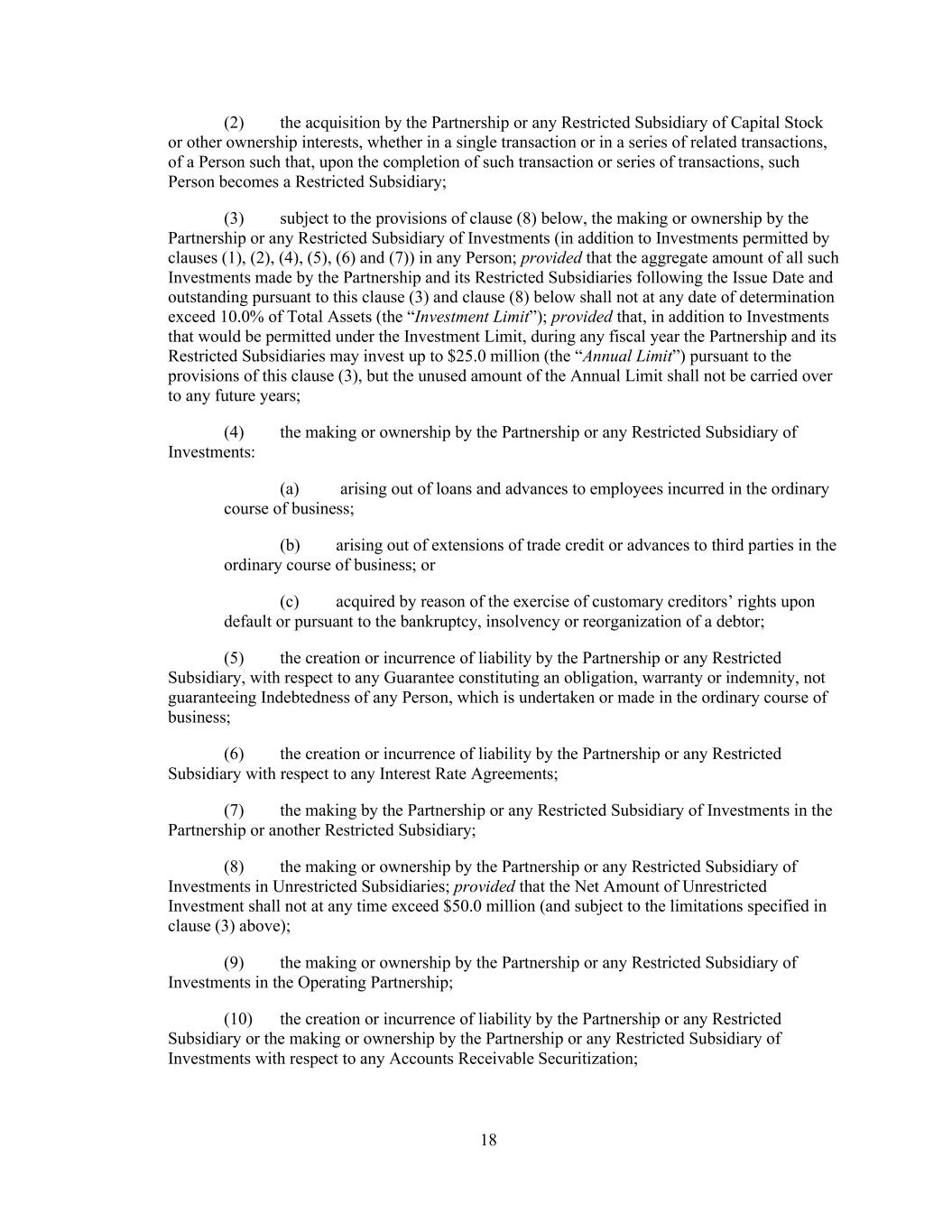 18 (2) the acquisition by the Partnership or any Restricted Subsidiary of Capital Stock or other ownership interests, whether in a single transaction or in a series of related transactions, of a Person such that, upon the completion of such transaction or series of transactions, such Person becomes a Restricted Subsidiary; (3) subject to the provisions of clause (8) below, the making or ownership by the Partnership or any Restricted Subsidiary of Investments (in addition to Investments permitted by clauses (1), (2), (4), (5), (6) and (7)) in any Person; provided that the aggregate amount of all such Investments made by the Partnership and its Restricted Subsidiaries following the Issue Date and outstanding pursuant to this clause (3) and clause (8) below shall not at any date of determination exceed 10.0% of Total Assets (the “Investment Limit”); provided that, in addition to Investments that would be permitted under the Investment Limit, during any fiscal year the Partnership and its Restricted Subsidiaries may invest up to $25.0 million (the “Annual Limit”) pursuant to the provisions of this clause (3), but the unused amount of the Annual Limit shall not be carried over to any future years; (4) the making or ownership by the Partnership or any Restricted Subsidiary of Investments: (a) arising out of loans and advances to employees incurred in the ordinary course of business; (b) arising out of extensions of trade credit or advances to third parties in the ordinary course of business; or (c) acquired by reason of the exercise of customary creditors’ rights upon default or pursuant to the bankruptcy, insolvency or reorganization of a debtor; (5) the creation or incurrence of liability by the Partnership or any Restricted Subsidiary, with respect to any Guarantee constituting an obligation, warranty or indemnity, not guaranteeing Indebtedness of any Person, which is undertaken or made in the ordinary course of business; (6) the creation or incurrence of liability by the Partnership or any Restricted Subsidiary with respect to any Interest Rate Agreements; (7) the making by the Partnership or any Restricted Subsidiary of Investments in the Partnership or another Restricted Subsidiary; (8) the making or ownership by the Partnership or any Restricted Subsidiary of Investments in Unrestricted Subsidiaries; provided that the Net Amount of Unrestricted Investment shall not at any time exceed $50.0 million (and subject to the limitations specified in clause (3) above); (9) the making or ownership by the Partnership or any Restricted Subsidiary of Investments in the Operating Partnership; (10) the creation or incurrence of liability by the Partnership or any Restricted Subsidiary or the making or ownership by the Partnership or any Restricted Subsidiary of Investments with respect to any Accounts Receivable Securitization;