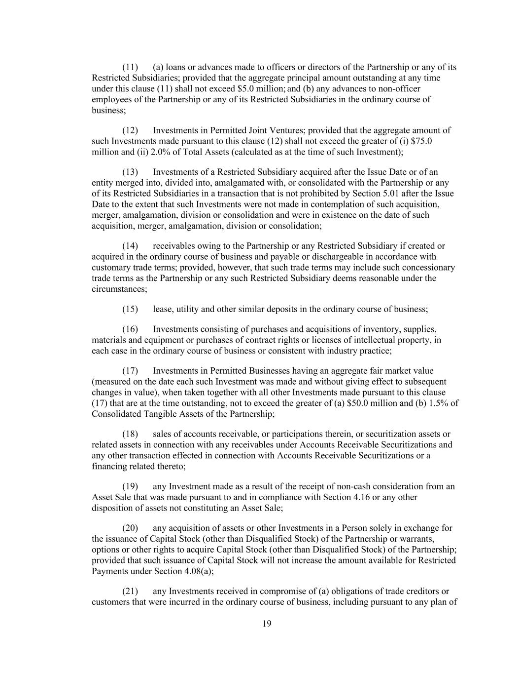 19 (11) (a) loans or advances made to officers or directors of the Partnership or any of its Restricted Subsidiaries; provided that the aggregate principal amount outstanding at any time under this clause (11) shall not exceed $5.0 million; and (b) any advances to non-officer employees of the Partnership or any of its Restricted Subsidiaries in the ordinary course of business; (12) Investments in Permitted Joint Ventures; provided that the aggregate amount of such Investments made pursuant to this clause (12) shall not exceed the greater of (i) $75.0 million and (ii) 2.0% of Total Assets (calculated as at the time of such Investment); (13) Investments of a Restricted Subsidiary acquired after the Issue Date or of an entity merged into, divided into, amalgamated with, or consolidated with the Partnership or any of its Restricted Subsidiaries in a transaction that is not prohibited by Section 5.01 after the Issue Date to the extent that such Investments were not made in contemplation of such acquisition, merger, amalgamation, division or consolidation and were in existence on the date of such acquisition, merger, amalgamation, division or consolidation; (14) receivables owing to the Partnership or any Restricted Subsidiary if created or acquired in the ordinary course of business and payable or dischargeable in accordance with customary trade terms; provided, however, that such trade terms may include such concessionary trade terms as the Partnership or any such Restricted Subsidiary deems reasonable under the circumstances; (15) lease, utility and other similar deposits in the ordinary course of business; (16) Investments consisting of purchases and acquisitions of inventory, supplies, materials and equipment or purchases of contract rights or licenses of intellectual property, in each case in the ordinary course of business or consistent with industry practice; (17) Investments in Permitted Businesses having an aggregate fair market value (measured on the date each such Investment was made and without giving effect to subsequent changes in value), when taken together with all other Investments made pursuant to this clause (17) that are at the time outstanding, not to exceed the greater of (a) $50.0 million and (b) 1.5% of Consolidated Tangible Assets of the Partnership; (18) sales of accounts receivable, or participations therein, or securitization assets or related assets in connection with any receivables under Accounts Receivable Securitizations and any other transaction effected in connection with Accounts Receivable Securitizations or a financing related thereto; (19) any Investment made as a result of the receipt of non-cash consideration from an Asset Sale that was made pursuant to and in compliance with Section 4.16 or any other disposition of assets not constituting an Asset Sale; (20) any acquisition of assets or other Investments in a Person solely in exchange for the issuance of Capital Stock (other than Disqualified Stock) of the Partnership or warrants, options or other rights to acquire Capital Stock (other than Disqualified Stock) of the Partnership; provided that such issuance of Capital Stock will not increase the amount available for Restricted Payments under Section 4.08(a); (21) any Investments received in compromise of (a) obligations of trade creditors or customers that were incurred in the ordinary course of business, including pursuant to any plan of