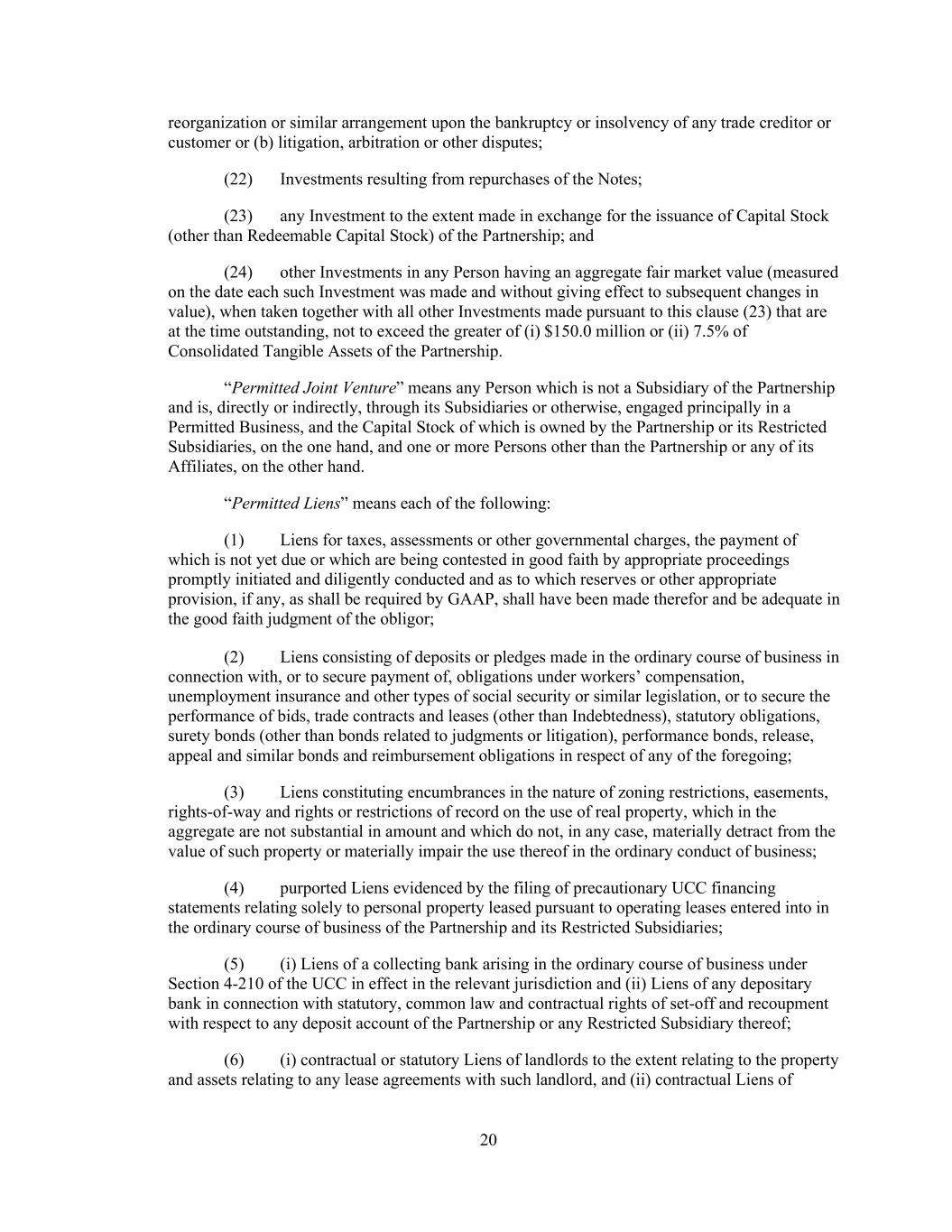 20 reorganization or similar arrangement upon the bankruptcy or insolvency of any trade creditor or customer or (b) litigation, arbitration or other disputes; (22) Investments resulting from repurchases of the Notes; (23) any Investment to the extent made in exchange for the issuance of Capital Stock (other than Redeemable Capital Stock) of the Partnership; and (24) other Investments in any Person having an aggregate fair market value (measured on the date each such Investment was made and without giving effect to subsequent changes in value), when taken together with all other Investments made pursuant to this clause (23) that are at the time outstanding, not to exceed the greater of (i) $150.0 million or (ii) 7.5% of Consolidated Tangible Assets of the Partnership. “Permitted Joint Venture” means any Person which is not a Subsidiary of the Partnership and is, directly or indirectly, through its Subsidiaries or otherwise, engaged principally in a Permitted Business, and the Capital Stock of which is owned by the Partnership or its Restricted Subsidiaries, on the one hand, and one or more Persons other than the Partnership or any of its Affiliates, on the other hand. “Permitted Liens” means each of the following: (1) Liens for taxes, assessments or other governmental charges, the payment of which is not yet due or which are being contested in good faith by appropriate proceedings promptly initiated and diligently conducted and as to which reserves or other appropriate provision, if any, as shall be required by GAAP, shall have been made therefor and be adequate in the good faith judgment of the obligor; (2) Liens consisting of deposits or pledges made in the ordinary course of business in connection with, or to secure payment of, obligations under workers’ compensation, unemployment insurance and other types of social security or similar legislation, or to secure the performance of bids, trade contracts and leases (other than Indebtedness), statutory obligations, surety bonds (other than bonds related to judgments or litigation), performance bonds, release, appeal and similar bonds and reimbursement obligations in respect of any of the foregoing; (3) Liens constituting encumbrances in the nature of zoning restrictions, easements, rights-of-way and rights or restrictions of record on the use of real property, which in the aggregate are not substantial in amount and which do not, in any case, materially detract from the value of such property or materially impair the use thereof in the ordinary conduct of business; (4) purported Liens evidenced by the filing of precautionary UCC financing statements relating solely to personal property leased pursuant to operating leases entered into in the ordinary course of business of the Partnership and its Restricted Subsidiaries; (5) (i) Liens of a collecting bank arising in the ordinary course of business under Section 4-210 of the UCC in effect in the relevant jurisdiction and (ii) Liens of any depositary bank in connection with statutory, common law and contractual rights of set-off and recoupment with respect to any deposit account of the Partnership or any Restricted Subsidiary thereof; (6) (i) contractual or statutory Liens of landlords to the extent relating to the property and assets relating to any lease agreements with such landlord, and (ii) contractual Liens of