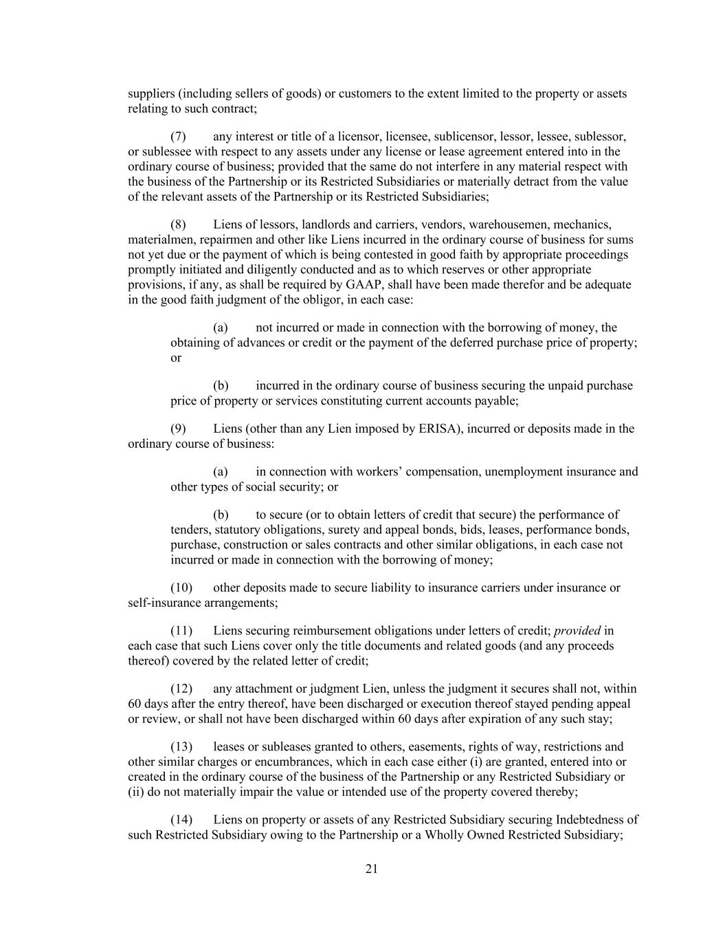 21 suppliers (including sellers of goods) or customers to the extent limited to the property or assets relating to such contract; (7) any interest or title of a licensor, licensee, sublicensor, lessor, lessee, sublessor, or sublessee with respect to any assets under any license or lease agreement entered into in the ordinary course of business; provided that the same do not interfere in any material respect with the business of the Partnership or its Restricted Subsidiaries or materially detract from the value of the relevant assets of the Partnership or its Restricted Subsidiaries; (8) Liens of lessors, landlords and carriers, vendors, warehousemen, mechanics, materialmen, repairmen and other like Liens incurred in the ordinary course of business for sums not yet due or the payment of which is being contested in good faith by appropriate proceedings promptly initiated and diligently conducted and as to which reserves or other appropriate provisions, if any, as shall be required by GAAP, shall have been made therefor and be adequate in the good faith judgment of the obligor, in each case: (a) not incurred or made in connection with the borrowing of money, the obtaining of advances or credit or the payment of the deferred purchase price of property; or (b) incurred in the ordinary course of business securing the unpaid purchase price of property or services constituting current accounts payable; (9) Liens (other than any Lien imposed by ERISA), incurred or deposits made in the ordinary course of business: (a) in connection with workers’ compensation, unemployment insurance and other types of social security; or (b) to secure (or to obtain letters of credit that secure) the performance of tenders, statutory obligations, surety and appeal bonds, bids, leases, performance bonds, purchase, construction or sales contracts and other similar obligations, in each case not incurred or made in connection with the borrowing of money; (10) other deposits made to secure liability to insurance carriers under insurance or self-insurance arrangements; (11) Liens securing reimbursement obligations under letters of credit; provided in each case that such Liens cover only the title documents and related goods (and any proceeds thereof) covered by the related letter of credit; (12) any attachment or judgment Lien, unless the judgment it secures shall not, within 60 days after the entry thereof, have been discharged or execution thereof stayed pending appeal or review, or shall not have been discharged within 60 days after expiration of any such stay; (13) leases or subleases granted to others, easements, rights of way, restrictions and other similar charges or encumbrances, which in each case either (i) are granted, entered into or created in the ordinary course of the business of the Partnership or any Restricted Subsidiary or (ii) do not materially impair the value or intended use of the property covered thereby; (14) Liens on property or assets of any Restricted Subsidiary securing Indebtedness of such Restricted Subsidiary owing to the Partnership or a Wholly Owned Restricted Subsidiary;