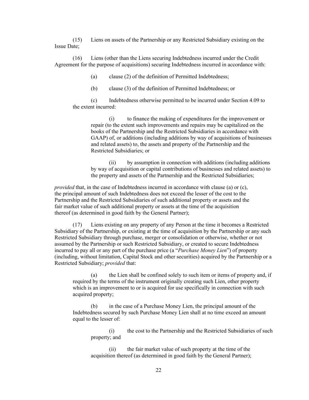 22 (15) Liens on assets of the Partnership or any Restricted Subsidiary existing on the Issue Date; (16) Liens (other than the Liens securing Indebtedness incurred under the Credit Agreement for the purpose of acquisitions) securing Indebtedness incurred in accordance with: (a) clause (2) of the definition of Permitted Indebtedness; (b) clause (3) of the definition of Permitted Indebtedness; or (c) Indebtedness otherwise permitted to be incurred under Section 4.09 to the extent incurred: (i) to finance the making of expenditures for the improvement or repair (to the extent such improvements and repairs may be capitalized on the books of the Partnership and the Restricted Subsidiaries in accordance with GAAP) of, or additions (including additions by way of acquisitions of businesses and related assets) to, the assets and property of the Partnership and the Restricted Subsidiaries; or (ii) by assumption in connection with additions (including additions by way of acquisition or capital contributions of businesses and related assets) to the property and assets of the Partnership and the Restricted Subsidiaries; provided that, in the case of Indebtedness incurred in accordance with clause (a) or (c), the principal amount of such Indebtedness does not exceed the lesser of the cost to the Partnership and the Restricted Subsidiaries of such additional property or assets and the fair market value of such additional property or assets at the time of the acquisition thereof (as determined in good faith by the General Partner); (17) Liens existing on any property of any Person at the time it becomes a Restricted Subsidiary of the Partnership, or existing at the time of acquisition by the Partnership or any such Restricted Subsidiary through purchase, merger or consolidation or otherwise, whether or not assumed by the Partnership or such Restricted Subsidiary, or created to secure Indebtedness incurred to pay all or any part of the purchase price (a “Purchase Money Lien”) of property (including, without limitation, Capital Stock and other securities) acquired by the Partnership or a Restricted Subsidiary; provided that: (a) the Lien shall be confined solely to such item or items of property and, if required by the terms of the instrument originally creating such Lien, other property which is an improvement to or is acquired for use specifically in connection with such acquired property; (b) in the case of a Purchase Money Lien, the principal amount of the Indebtedness secured by such Purchase Money Lien shall at no time exceed an amount equal to the lesser of: (i) the cost to the Partnership and the Restricted Subsidiaries of such property; and (ii) the fair market value of such property at the time of the acquisition thereof (as determined in good faith by the General Partner);