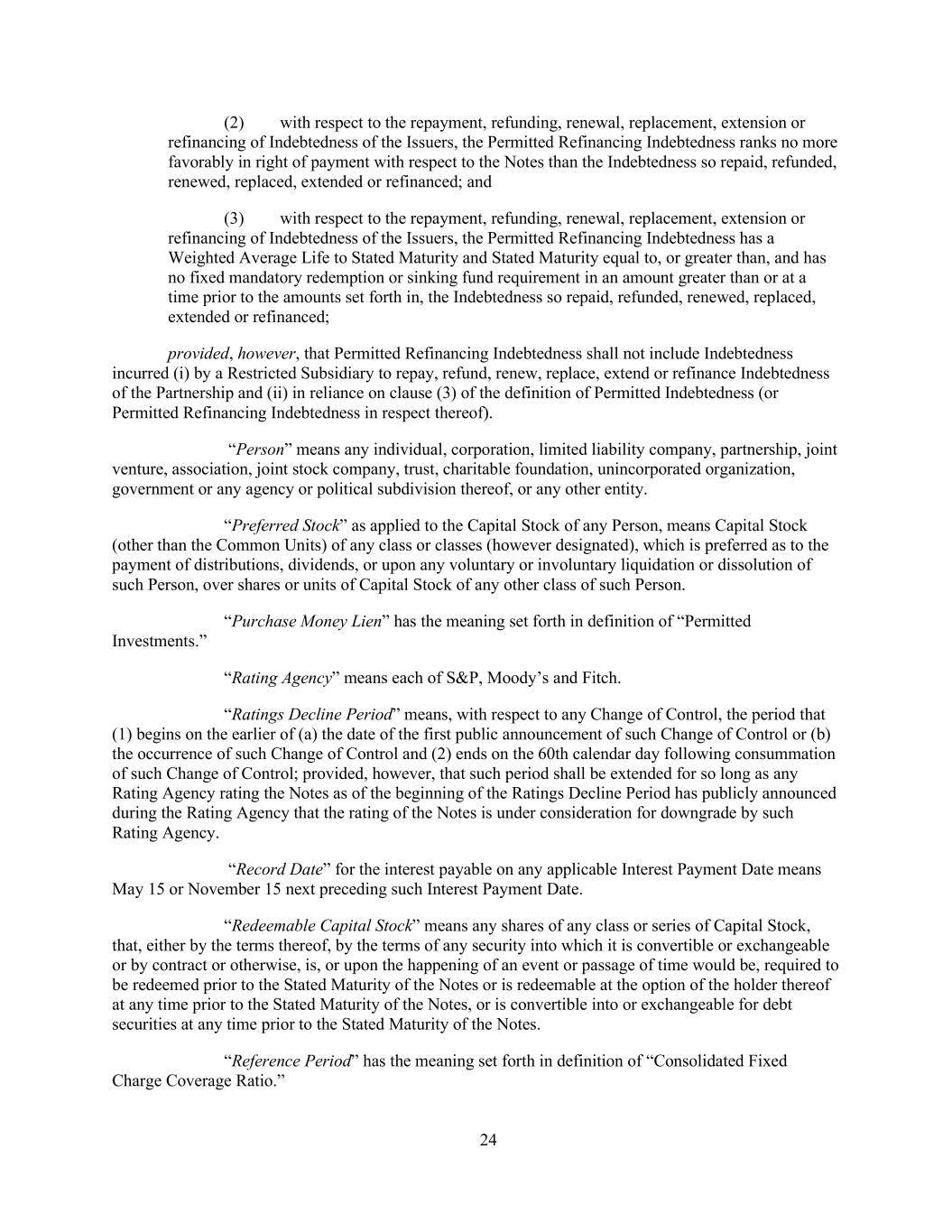 24 (2) with respect to the repayment, refunding, renewal, replacement, extension or refinancing of Indebtedness of the Issuers, the Permitted Refinancing Indebtedness ranks no more favorably in right of payment with respect to the Notes than the Indebtedness so repaid, refunded, renewed, replaced, extended or refinanced; and (3) with respect to the repayment, refunding, renewal, replacement, extension or refinancing of Indebtedness of the Issuers, the Permitted Refinancing Indebtedness has a Weighted Average Life to Stated Maturity and Stated Maturity equal to, or greater than, and has no fixed mandatory redemption or sinking fund requirement in an amount greater than or at a time prior to the amounts set forth in, the Indebtedness so repaid, refunded, renewed, replaced, extended or refinanced; provided, however, that Permitted Refinancing Indebtedness shall not include Indebtedness incurred (i) by a Restricted Subsidiary to repay, refund, renew, replace, extend or refinance Indebtedness of the Partnership and (ii) in reliance on clause (3) of the definition of Permitted Indebtedness (or Permitted Refinancing Indebtedness in respect thereof). “Person” means any individual, corporation, limited liability company, partnership, joint venture, association, joint stock company, trust, charitable foundation, unincorporated organization, government or any agency or political subdivision thereof, or any other entity. “Preferred Stock” as applied to the Capital Stock of any Person, means Capital Stock (other than the Common Units) of any class or classes (however designated), which is preferred as to the payment of distributions, dividends, or upon any voluntary or involuntary liquidation or dissolution of such Person, over shares or units of Capital Stock of any other class of such Person. “Purchase Money Lien” has the meaning set forth in definition of “Permitted Investments.” “Rating Agency” means each of S&P, Moody’s and Fitch. “Ratings Decline Period” means, with respect to any Change of Control, the period that (1) begins on the earlier of (a) the date of the first public announcement of such Change of Control or (b) the occurrence of such Change of Control and (2) ends on the 60th calendar day following consummation of such Change of Control; provided, however, that such period shall be extended for so long as any Rating Agency rating the Notes as of the beginning of the Ratings Decline Period has publicly announced during the Rating Agency that the rating of the Notes is under consideration for downgrade by such Rating Agency. “Record Date” for the interest payable on any applicable Interest Payment Date means May 15 or November 15 next preceding such Interest Payment Date. “Redeemable Capital Stock” means any shares of any class or series of Capital Stock, that, either by the terms thereof, by the terms of any security into which it is convertible or exchangeable or by contract or otherwise, is, or upon the happening of an event or passage of time would be, required to be redeemed prior to the Stated Maturity of the Notes or is redeemable at the option of the holder thereof at any time prior to the Stated Maturity of the Notes, or is convertible into or exchangeable for debt securities at any time prior to the Stated Maturity of the Notes. “Reference Period” has the meaning set forth in definition of “Consolidated Fixed Charge Coverage Ratio.”