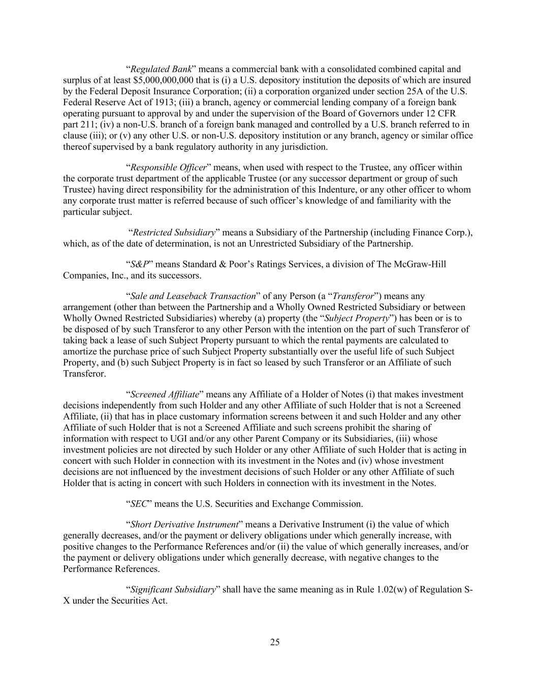 25 “Regulated Bank” means a commercial bank with a consolidated combined capital and surplus of at least $5,000,000,000 that is (i) a U.S. depository institution the deposits of which are insured by the Federal Deposit Insurance Corporation; (ii) a corporation organized under section 25A of the U.S. Federal Reserve Act of 1913; (iii) a branch, agency or commercial lending company of a foreign bank operating pursuant to approval by and under the supervision of the Board of Governors under 12 CFR part 211; (iv) a non-U.S. branch of a foreign bank managed and controlled by a U.S. branch referred to in clause (iii); or (v) any other U.S. or non-U.S. depository institution or any branch, agency or similar office thereof supervised by a bank regulatory authority in any jurisdiction. “Responsible Officer” means, when used with respect to the Trustee, any officer within the corporate trust department of the applicable Trustee (or any successor department or group of such Trustee) having direct responsibility for the administration of this Indenture, or any other officer to whom any corporate trust matter is referred because of such officer’s knowledge of and familiarity with the particular subject. “Restricted Subsidiary” means a Subsidiary of the Partnership (including Finance Corp.), which, as of the date of determination, is not an Unrestricted Subsidiary of the Partnership. “S&P” means Standard & Poor’s Ratings Services, a division of The McGraw-Hill Companies, Inc., and its successors. “Sale and Leaseback Transaction” of any Person (a “Transferor”) means any arrangement (other than between the Partnership and a Wholly Owned Restricted Subsidiary or between Wholly Owned Restricted Subsidiaries) whereby (a) property (the “Subject Property”) has been or is to be disposed of by such Transferor to any other Person with the intention on the part of such Transferor of taking back a lease of such Subject Property pursuant to which the rental payments are calculated to amortize the purchase price of such Subject Property substantially over the useful life of such Subject Property, and (b) such Subject Property is in fact so leased by such Transferor or an Affiliate of such Transferor. “Screened Affiliate” means any Affiliate of a Holder of Notes (i) that makes investment decisions independently from such Holder and any other Affiliate of such Holder that is not a Screened Affiliate, (ii) that has in place customary information screens between it and such Holder and any other Affiliate of such Holder that is not a Screened Affiliate and such screens prohibit the sharing of information with respect to UGI and/or any other Parent Company or its Subsidiaries, (iii) whose investment policies are not directed by such Holder or any other Affiliate of such Holder that is acting in concert with such Holder in connection with its investment in the Notes and (iv) whose investment decisions are not influenced by the investment decisions of such Holder or any other Affiliate of such Holder that is acting in concert with such Holders in connection with its investment in the Notes. “SEC” means the U.S. Securities and Exchange Commission. “Short Derivative Instrument” means a Derivative Instrument (i) the value of which generally decreases, and/or the payment or delivery obligations under which generally increase, with positive changes to the Performance References and/or (ii) the value of which generally increases, and/or the payment or delivery obligations under which generally decrease, with negative changes to the Performance References. “Significant Subsidiary” shall have the same meaning as in Rule 1.02(w) of Regulation S- X under the Securities Act.