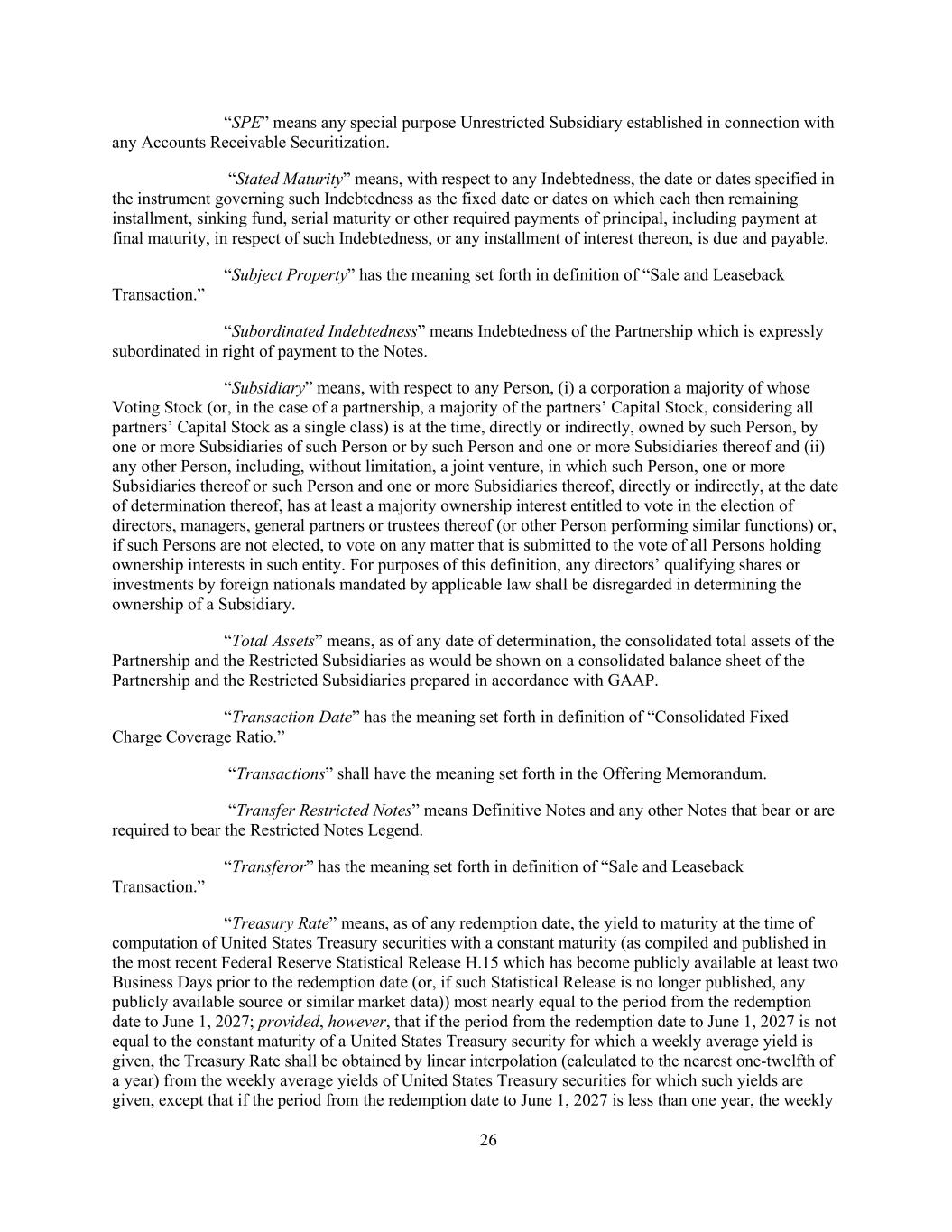 26 “SPE” means any special purpose Unrestricted Subsidiary established in connection with any Accounts Receivable Securitization. “Stated Maturity” means, with respect to any Indebtedness, the date or dates specified in the instrument governing such Indebtedness as the fixed date or dates on which each then remaining installment, sinking fund, serial maturity or other required payments of principal, including payment at final maturity, in respect of such Indebtedness, or any installment of interest thereon, is due and payable. “Subject Property” has the meaning set forth in definition of “Sale and Leaseback Transaction.” “Subordinated Indebtedness” means Indebtedness of the Partnership which is expressly subordinated in right of payment to the Notes. “Subsidiary” means, with respect to any Person, (i) a corporation a majority of whose Voting Stock (or, in the case of a partnership, a majority of the partners’ Capital Stock, considering all partners’ Capital Stock as a single class) is at the time, directly or indirectly, owned by such Person, by one or more Subsidiaries of such Person or by such Person and one or more Subsidiaries thereof and (ii) any other Person, including, without limitation, a joint venture, in which such Person, one or more Subsidiaries thereof or such Person and one or more Subsidiaries thereof, directly or indirectly, at the date of determination thereof, has at least a majority ownership interest entitled to vote in the election of directors, managers, general partners or trustees thereof (or other Person performing similar functions) or, if such Persons are not elected, to vote on any matter that is submitted to the vote of all Persons holding ownership interests in such entity. For purposes of this definition, any directors’ qualifying shares or investments by foreign nationals mandated by applicable law shall be disregarded in determining the ownership of a Subsidiary. “Total Assets” means, as of any date of determination, the consolidated total assets of the Partnership and the Restricted Subsidiaries as would be shown on a consolidated balance sheet of the Partnership and the Restricted Subsidiaries prepared in accordance with GAAP. “Transaction Date” has the meaning set forth in definition of “Consolidated Fixed Charge Coverage Ratio.” “Transactions” shall have the meaning set forth in the Offering Memorandum. “Transfer Restricted Notes” means Definitive Notes and any other Notes that bear or are required to bear the Restricted Notes Legend. “Transferor” has the meaning set forth in definition of “Sale and Leaseback Transaction.” “Treasury Rate” means, as of any redemption date, the yield to maturity at the time of computation of United States Treasury securities with a constant maturity (as compiled and published in the most recent Federal Reserve Statistical Release H.15 which has become publicly available at least two Business Days prior to the redemption date (or, if such Statistical Release is no longer published, any publicly available source or similar market data)) most nearly equal to the period from the redemption date to June 1, 2027; provided, however, that if the period from the redemption date to June 1, 2027 is not equal to the constant maturity of a United States Treasury security for which a weekly average yield is given, the Treasury Rate shall be obtained by linear interpolation (calculated to the nearest one-twelfth of a year) from the weekly average yields of United States Treasury securities for which such yields are given, except that if the period from the redemption date to June 1, 2027 is less than one year, the weekly