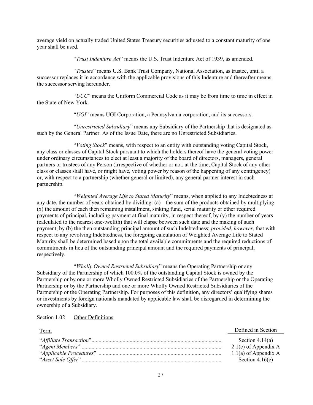 27 average yield on actually traded United States Treasury securities adjusted to a constant maturity of one year shall be used. “Trust Indenture Act” means the U.S. Trust Indenture Act of 1939, as amended. “Trustee” means U.S. Bank Trust Company, National Association, as trustee, until a successor replaces it in accordance with the applicable provisions of this Indenture and thereafter means the successor serving hereunder. “UCC” means the Uniform Commercial Code as it may be from time to time in effect in the State of New York. “UGI” means UGI Corporation, a Pennsylvania corporation, and its successors. “Unrestricted Subsidiary” means any Subsidiary of the Partnership that is designated as such by the General Partner. As of the Issue Date, there are no Unrestricted Subsidiaries. “Voting Stock” means, with respect to an entity with outstanding voting Capital Stock, any class or classes of Capital Stock pursuant to which the holders thereof have the general voting power under ordinary circumstances to elect at least a majority of the board of directors, managers, general partners or trustees of any Person (irrespective of whether or not, at the time, Capital Stock of any other class or classes shall have, or might have, voting power by reason of the happening of any contingency) or, with respect to a partnership (whether general or limited), any general partner interest in such partnership. “Weighted Average Life to Stated Maturity” means, when applied to any Indebtedness at any date, the number of years obtained by dividing: (a) the sum of the products obtained by multiplying (x) the amount of each then remaining installment, sinking fund, serial maturity or other required payments of principal, including payment at final maturity, in respect thereof, by (y) the number of years (calculated to the nearest one-twelfth) that will elapse between such date and the making of such payment, by (b) the then outstanding principal amount of such Indebtedness; provided, however, that with respect to any revolving Indebtedness, the foregoing calculation of Weighted Average Life to Stated Maturity shall be determined based upon the total available commitments and the required reductions of commitments in lieu of the outstanding principal amount and the required payments of principal, respectively. “Wholly Owned Restricted Subsidiary” means the Operating Partnership or any Subsidiary of the Partnership of which 100.0% of the outstanding Capital Stock is owned by the Partnership or by one or more Wholly Owned Restricted Subsidiaries of the Partnership or the Operating Partnership or by the Partnership and one or more Wholly Owned Restricted Subsidiaries of the Partnership or the Operating Partnership. For purposes of this definition, any directors’ qualifying shares or investments by foreign nationals mandated by applicable law shall be disregarded in determining the ownership of a Subsidiary. Section 1.02 Other Definitions. Term Defined in Section “Affiliate Transaction” ............................................................................................ Section 4.14(a) “Agent Members” .................................................................................................... 2.1(c) of Appendix A “Applicable Procedures” ....................................................................................... 1.1(a) of Appendix A “Asset Sale Offer” ................................................................................................... Section 4.16(e)