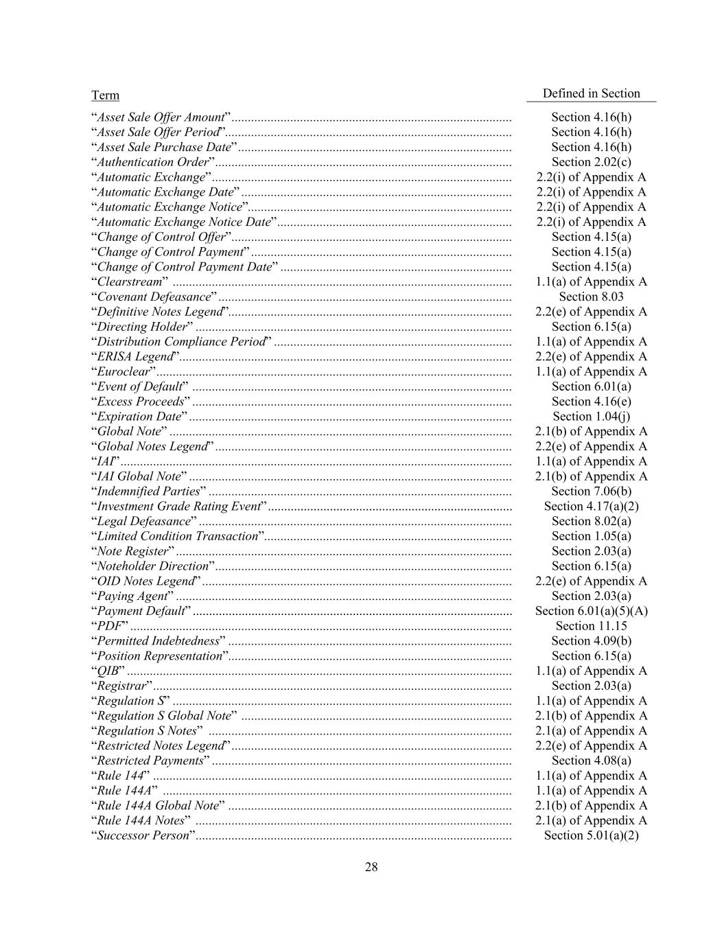 28 Term Defined in Section “Asset Sale Offer Amount” ...................................................................................... Section 4.16(h) “Asset Sale Offer Period”........................................................................................ Section 4.16(h) “Asset Sale Purchase Date” .................................................................................... Section 4.16(h) “Authentication Order” ........................................................................................... Section 2.02(c) “Automatic Exchange” ............................................................................................ 2.2(i) of Appendix A “Automatic Exchange Date” ................................................................................... 2.2(i) of Appendix A “Automatic Exchange Notice” ................................................................................. 2.2(i) of Appendix A “Automatic Exchange Notice Date” ........................................................................ 2.2(i) of Appendix A “Change of Control Offer” ...................................................................................... Section 4.15(a) “Change of Control Payment” ................................................................................ Section 4.15(a) “Change of Control Payment Date” ....................................................................... Section 4.15(a) “Clearstream” ........................................................................................................ 1.1(a) of Appendix A “Covenant Defeasance” .......................................................................................... Section 8.03 “Definitive Notes Legend”....................................................................................... 2.2(e) of Appendix A “Directing Holder” ................................................................................................. Section 6.15(a) “Distribution Compliance Period” ......................................................................... 1.1(a) of Appendix A “ERISA Legend” ...................................................................................................... 2.2(e) of Appendix A “Euroclear” ............................................................................................................. 1.1(a) of Appendix A “Event of Default” .................................................................................................. Section 6.01(a) “Excess Proceeds” .................................................................................................. Section 4.16(e) “Expiration Date” ................................................................................................... Section 1.04(j) “Global Note” ......................................................................................................... 2.1(b) of Appendix A “Global Notes Legend” ........................................................................................... 2.2(e) of Appendix A “IAI” ........................................................................................................................ 1.1(a) of Appendix A “IAI Global Note” ................................................................................................... 2.1(b) of Appendix A “Indemnified Parties” ............................................................................................. Section 7.06(b) “Investment Grade Rating Event” ........................................................................... Section 4.17(a)(2) “Legal Defeasance” ................................................................................................ Section 8.02(a) “Limited Condition Transaction” ............................................................................ Section 1.05(a) “Note Register” ....................................................................................................... Section 2.03(a) “Noteholder Direction” ........................................................................................... Section 6.15(a) “OID Notes Legend” ............................................................................................... 2.2(e) of Appendix A “Paying Agent” ....................................................................................................... Section 2.03(a) “Payment Default” .................................................................................................. Section 6.01(a)(5)(A) “PDF” ..................................................................................................................... Section 11.15 “Permitted Indebtedness” ....................................................................................... Section 4.09(b) “Position Representation” ....................................................................................... Section 6.15(a) “QIB” ...................................................................................................................... 1.1(a) of Appendix A “Registrar” .............................................................................................................. Section 2.03(a) “Regulation S” ........................................................................................................ 1.1(a) of Appendix A “Regulation S Global Note” ................................................................................... 2.1(b) of Appendix A “Regulation S Notes” ............................................................................................. 2.1(a) of Appendix A “Restricted Notes Legend” ...................................................................................... 2.2(e) of Appendix A “Restricted Payments” .................................
