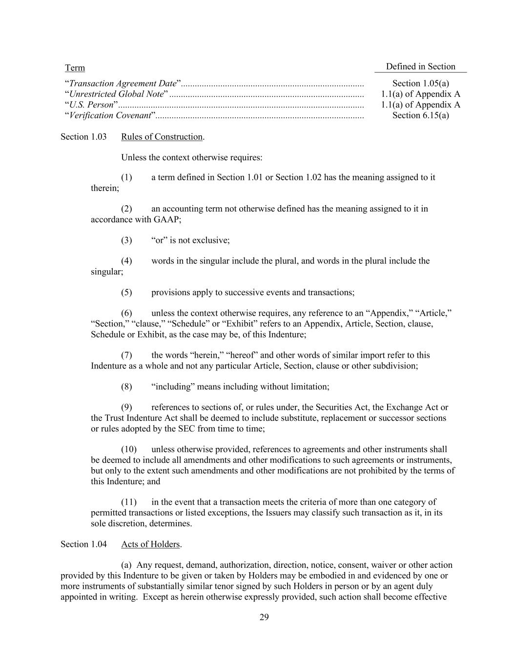 29 Term Defined in Section “Transaction Agreement Date” ............................................................................... Section 1.05(a) “Unrestricted Global Note” .................................................................................... 1.1(a) of Appendix A “U.S. Person” .......................................................................................................... 1.1(a) of Appendix A “Verification Covenant” .......................................................................................... Section 6.15(a) Section 1.03 Rules of Construction. Unless the context otherwise requires: (1) a term defined in Section 1.01 or Section 1.02 has the meaning assigned to it therein; (2) an accounting term not otherwise defined has the meaning assigned to it in accordance with GAAP; (3) “or” is not exclusive; (4) words in the singular include the plural, and words in the plural include the singular; (5) provisions apply to successive events and transactions; (6) unless the context otherwise requires, any reference to an “Appendix,” “Article,” “Section,” “clause,” “Schedule” or “Exhibit” refers to an Appendix, Article, Section, clause, Schedule or Exhibit, as the case may be, of this Indenture; (7) the words “herein,” “hereof” and other words of similar import refer to this Indenture as a whole and not any particular Article, Section, clause or other subdivision; (8) “including” means including without limitation; (9) references to sections of, or rules under, the Securities Act, the Exchange Act or the Trust Indenture Act shall be deemed to include substitute, replacement or successor sections or rules adopted by the SEC from time to time; (10) unless otherwise provided, references to agreements and other instruments shall be deemed to include all amendments and other modifications to such agreements or instruments, but only to the extent such amendments and other modifications are not prohibited by the terms of this Indenture; and (11) in the event that a transaction meets the criteria of more than one category of permitted transactions or listed exceptions, the Issuers may classify such transaction as it, in its sole discretion, determines. Section 1.04 Acts of Holders. (a) Any request, demand, authorization, direction, notice, consent, waiver or other action provided by this Indenture to be given or taken by Holders may be embodied in and evidenced by one or more instruments of substantially similar tenor signed by such Holders in person or by an agent duly appointed in writing. Except as herein otherwise expressly provided, such action shall become effective