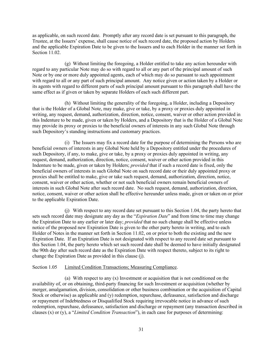 31 as applicable, on such record date. Promptly after any record date is set pursuant to this paragraph, the Trustee, at the Issuers’ expense, shall cause notice of such record date, the proposed action by Holders and the applicable Expiration Date to be given to the Issuers and to each Holder in the manner set forth in Section 11.02. (g) Without limiting the foregoing, a Holder entitled to take any action hereunder with regard to any particular Note may do so with regard to all or any part of the principal amount of such Note or by one or more duly appointed agents, each of which may do so pursuant to such appointment with regard to all or any part of such principal amount. Any notice given or action taken by a Holder or its agents with regard to different parts of such principal amount pursuant to this paragraph shall have the same effect as if given or taken by separate Holders of each such different part. (h) Without limiting the generality of the foregoing, a Holder, including a Depository that is the Holder of a Global Note, may make, give or take, by a proxy or proxies duly appointed in writing, any request, demand, authorization, direction, notice, consent, waiver or other action provided in this Indenture to be made, given or taken by Holders, and a Depository that is the Holder of a Global Note may provide its proxy or proxies to the beneficial owners of interests in any such Global Note through such Depository’s standing instructions and customary practices. (i) The Issuers may fix a record date for the purpose of determining the Persons who are beneficial owners of interests in any Global Note held by a Depository entitled under the procedures of such Depository, if any, to make, give or take, by a proxy or proxies duly appointed in writing, any request, demand, authorization, direction, notice, consent, waiver or other action provided in this Indenture to be made, given or taken by Holders; provided that if such a record date is fixed, only the beneficial owners of interests in such Global Note on such record date or their duly appointed proxy or proxies shall be entitled to make, give or take such request, demand, authorization, direction, notice, consent, waiver or other action, whether or not such beneficial owners remain beneficial owners of interests in such Global Note after such record date. No such request, demand, authorization, direction, notice, consent, waiver or other action shall be effective hereunder unless made, given or taken on or prior to the applicable Expiration Date. (j) With respect to any record date set pursuant to this Section 1.04, the party hereto that sets such record date may designate any day as the “Expiration Date” and from time to time may change the Expiration Date to any earlier or later day; provided that no such change shall be effective unless notice of the proposed new Expiration Date is given to the other party hereto in writing, and to each Holder of Notes in the manner set forth in Section 11.02, on or prior to both the existing and the new Expiration Date. If an Expiration Date is not designated with respect to any record date set pursuant to this Section 1.04, the party hereto which set such record date shall be deemed to have initially designated the 90th day after such record date as the Expiration Date with respect thereto, subject to its right to change the Expiration Date as provided in this clause (j). Section 1.05 Limited Condition Transactions; Measuring Compliance. (a) With respect to any (x) Investment or acquisition that is not conditioned on the availability of, or on obtaining, third-party financing for such Investment or acquisition (whether by merger, amalgamation, division, consolidation or other business combination or the acquisition of Capital Stock or otherwise) as applicable and (y) redemption, repurchase, defeasance, satisfaction and discharge or repayment of Indebtedness or Disqualified Stock requiring irrevocable notice in advance of such redemption, repurchase, defeasance, satisfaction and discharge or repayment (any transaction described in clauses (x) or (y), a “Limited Condition Transaction”), in each case for purposes of determining: