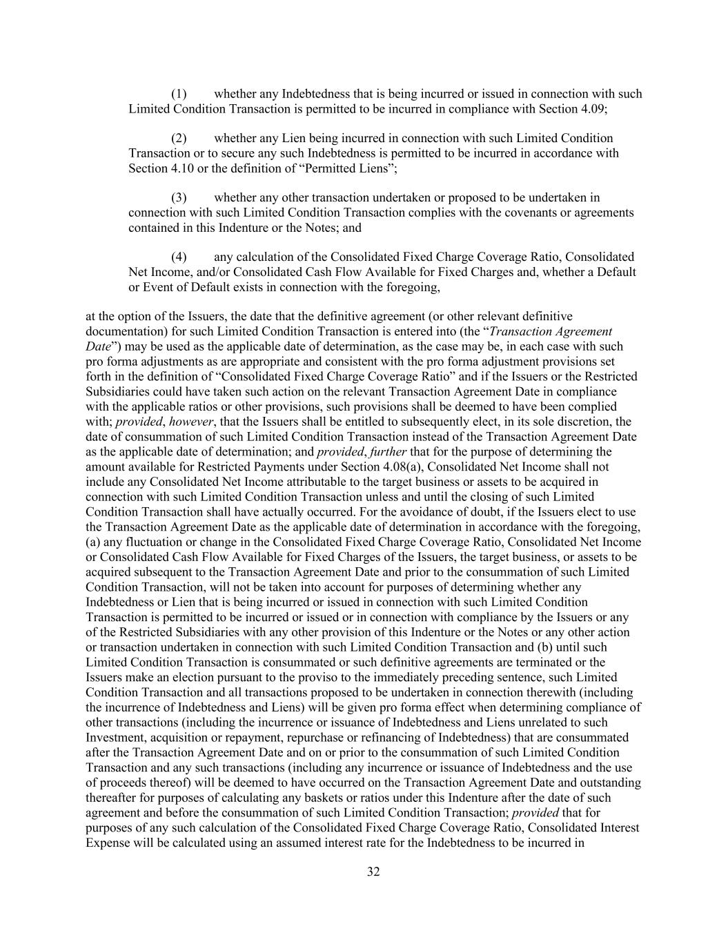 32 (1) whether any Indebtedness that is being incurred or issued in connection with such Limited Condition Transaction is permitted to be incurred in compliance with Section 4.09; (2) whether any Lien being incurred in connection with such Limited Condition Transaction or to secure any such Indebtedness is permitted to be incurred in accordance with Section 4.10 or the definition of “Permitted Liens”; (3) whether any other transaction undertaken or proposed to be undertaken in connection with such Limited Condition Transaction complies with the covenants or agreements contained in this Indenture or the Notes; and (4) any calculation of the Consolidated Fixed Charge Coverage Ratio, Consolidated Net Income, and/or Consolidated Cash Flow Available for Fixed Charges and, whether a Default or Event of Default exists in connection with the foregoing, at the option of the Issuers, the date that the definitive agreement (or other relevant definitive documentation) for such Limited Condition Transaction is entered into (the “Transaction Agreement Date”) may be used as the applicable date of determination, as the case may be, in each case with such pro forma adjustments as are appropriate and consistent with the pro forma adjustment provisions set forth in the definition of “Consolidated Fixed Charge Coverage Ratio” and if the Issuers or the Restricted Subsidiaries could have taken such action on the relevant Transaction Agreement Date in compliance with the applicable ratios or other provisions, such provisions shall be deemed to have been complied with; provided, however, that the Issuers shall be entitled to subsequently elect, in its sole discretion, the date of consummation of such Limited Condition Transaction instead of the Transaction Agreement Date as the applicable date of determination; and provided, further that for the purpose of determining the amount available for Restricted Payments under Section 4.08(a), Consolidated Net Income shall not include any Consolidated Net Income attributable to the target business or assets to be acquired in connection with such Limited Condition Transaction unless and until the closing of such Limited Condition Transaction shall have actually occurred. For the avoidance of doubt, if the Issuers elect to use the Transaction Agreement Date as the applicable date of determination in accordance with the foregoing, (a) any fluctuation or change in the Consolidated Fixed Charge Coverage Ratio, Consolidated Net Income or Consolidated Cash Flow Available for Fixed Charges of the Issuers, the target business, or assets to be acquired subsequent to the Transaction Agreement Date and prior to the consummation of such Limited Condition Transaction, will not be taken into account for purposes of determining whether any Indebtedness or Lien that is being incurred or issued in connection with such Limited Condition Transaction is permitted to be incurred or issued or in connection with compliance by the Issuers or any of the Restricted Subsidiaries with any other provision of this Indenture or the Notes or any other action or transaction undertaken in connection with such Limited Condition Transaction and (b) until such Limited Condition Transaction is consummated or such definitive agreements are terminated or the Issuers make an election pursuant to the proviso to the immediately preceding sentence, such Limited Condition Transaction and all transactions proposed to be undertaken in connection therewith (including the incurrence of Indebtedness and Liens) will be given pro forma effect when determining compliance of other transactions (including the incurrence or issuance of Indebtedness and Liens unrelated to such Investment, acquisition or repayment, repurchase or refinancing of Indebtedness) that are consummated after the Transaction Agreement Date and on or prior to the consummation of such Limited Condition Transaction and any such transactions (including any incurrence or issuance of Indebtedness and the use of proceeds thereof) will be deemed to have occurred on the Transaction Agreement Date and outstanding thereafter for purposes of calculating any baskets or ratios under this Indenture after the date of such agreement and before the consummation of such Limited Condition Transaction; provided that for purposes of any such calculation of the Consolidated Fixed Charge Coverage Ratio, Consolidated Interest Expense will be calculated using an assumed interest rate for the Indebtedness to be incurred in
