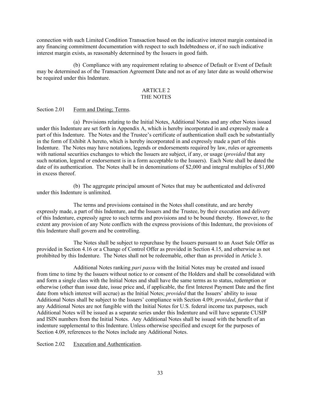 33 connection with such Limited Condition Transaction based on the indicative interest margin contained in any financing commitment documentation with respect to such Indebtedness or, if no such indicative interest margin exists, as reasonably determined by the Issuers in good faith. (b) Compliance with any requirement relating to absence of Default or Event of Default may be determined as of the Transaction Agreement Date and not as of any later date as would otherwise be required under this Indenture. ARTICLE 2 THE NOTES Section 2.01 Form and Dating; Terms. (a) Provisions relating to the Initial Notes, Additional Notes and any other Notes issued under this Indenture are set forth in Appendix A, which is hereby incorporated in and expressly made a part of this Indenture. The Notes and the Trustee’s certificate of authentication shall each be substantially in the form of Exhibit A hereto, which is hereby incorporated in and expressly made a part of this Indenture. The Notes may have notations, legends or endorsements required by law, rules or agreements with national securities exchanges to which the Issuers are subject, if any, or usage (provided that any such notation, legend or endorsement is in a form acceptable to the Issuers). Each Note shall be dated the date of its authentication. The Notes shall be in denominations of $2,000 and integral multiples of $1,000 in excess thereof. (b) The aggregate principal amount of Notes that may be authenticated and delivered under this Indenture is unlimited. The terms and provisions contained in the Notes shall constitute, and are hereby expressly made, a part of this Indenture, and the Issuers and the Trustee, by their execution and delivery of this Indenture, expressly agree to such terms and provisions and to be bound thereby. However, to the extent any provision of any Note conflicts with the express provisions of this Indenture, the provisions of this Indenture shall govern and be controlling. The Notes shall be subject to repurchase by the Issuers pursuant to an Asset Sale Offer as provided in Section 4.16 or a Change of Control Offer as provided in Section 4.15, and otherwise as not prohibited by this Indenture. The Notes shall not be redeemable, other than as provided in Article 3. Additional Notes ranking pari passu with the Initial Notes may be created and issued from time to time by the Issuers without notice to or consent of the Holders and shall be consolidated with and form a single class with the Initial Notes and shall have the same terms as to status, redemption or otherwise (other than issue date, issue price and, if applicable, the first Interest Payment Date and the first date from which interest will accrue) as the Initial Notes; provided that the Issuers’ ability to issue Additional Notes shall be subject to the Issuers’ compliance with Section 4.09; provided, further that if any Additional Notes are not fungible with the Initial Notes for U.S. federal income tax purposes, such Additional Notes will be issued as a separate series under this Indenture and will have separate CUSIP and ISIN numbers from the Initial Notes. Any Additional Notes shall be issued with the benefit of an indenture supplemental to this Indenture. Unless otherwise specified and except for the purposes of Section 4.09, references to the Notes include any Additional Notes. Section 2.02 Execution and Authentication.