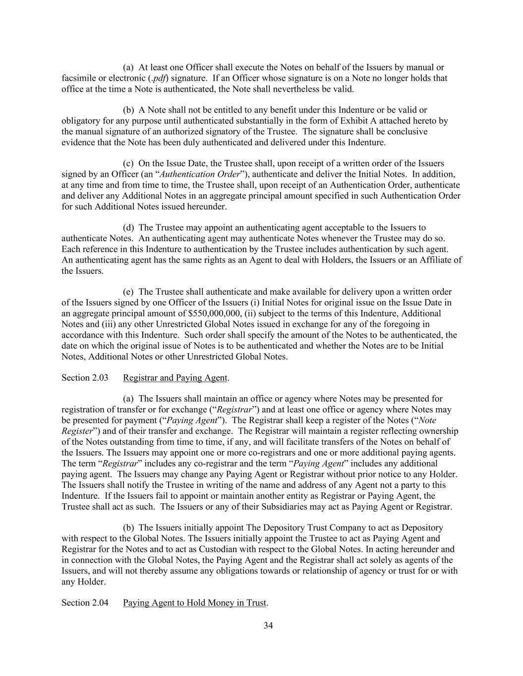 34 (a) At least one Officer shall execute the Notes on behalf of the Issuers by manual or facsimile or electronic (.pdf) signature. If an Officer whose signature is on a Note no longer holds that office at the time a Note is authenticated, the Note shall nevertheless be valid. (b) A Note shall not be entitled to any benefit under this Indenture or be valid or obligatory for any purpose until authenticated substantially in the form of Exhibit A attached hereto by the manual signature of an authorized signatory of the Trustee. The signature shall be conclusive evidence that the Note has been duly authenticated and delivered under this Indenture. (c) On the Issue Date, the Trustee shall, upon receipt of a written order of the Issuers signed by an Officer (an “Authentication Order”), authenticate and deliver the Initial Notes. In addition, at any time and from time to time, the Trustee shall, upon receipt of an Authentication Order, authenticate and deliver any Additional Notes in an aggregate principal amount specified in such Authentication Order for such Additional Notes issued hereunder. (d) The Trustee may appoint an authenticating agent acceptable to the Issuers to authenticate Notes. An authenticating agent may authenticate Notes whenever the Trustee may do so. Each reference in this Indenture to authentication by the Trustee includes authentication by such agent. An authenticating agent has the same rights as an Agent to deal with Holders, the Issuers or an Affiliate of the Issuers. (e) The Trustee shall authenticate and make available for delivery upon a written order of the Issuers signed by one Officer of the Issuers (i) Initial Notes for original issue on the Issue Date in an aggregate principal amount of $550,000,000, (ii) subject to the terms of this Indenture, Additional Notes and (iii) any other Unrestricted Global Notes issued in exchange for any of the foregoing in accordance with this Indenture. Such order shall specify the amount of the Notes to be authenticated, the date on which the original issue of Notes is to be authenticated and whether the Notes are to be Initial Notes, Additional Notes or other Unrestricted Global Notes. Section 2.03 Registrar and Paying Agent. (a) The Issuers shall maintain an office or agency where Notes may be presented for registration of transfer or for exchange (“Registrar”) and at least one office or agency where Notes may be presented for payment (“Paying Agent”). The Registrar shall keep a register of the Notes (“Note Register”) and of their transfer and exchange. The Registrar will maintain a register reflecting ownership of the Notes outstanding from time to time, if any, and will facilitate transfers of the Notes on behalf of the Issuers. The Issuers may appoint one or more co-registrars and one or more additional paying agents. The term “Registrar” includes any co-registrar and the term “Paying Agent” includes any additional paying agent. The Issuers may change any Paying Agent or Registrar without prior notice to any Holder. The Issuers shall notify the Trustee in writing of the name and address of any Agent not a party to this Indenture. If the Issuers fail to appoint or maintain another entity as Registrar or Paying Agent, the Trustee shall act as such. The Issuers or any of their Subsidiaries may act as Paying Agent or Registrar. (b) The Issuers initially appoint The Depository Trust Company to act as Depository with respect to the Global Notes. The Issuers initially appoint the Trustee to act as Paying Agent and Registrar for the Notes and to act as Custodian with respect to the Global Notes. In acting hereunder and in connection with the Global Notes, the Paying Agent and the Registrar shall act solely as agents of the Issuers, and will not thereby assume any obligations towards or relationship of agency or trust for or with any Holder. Section 2.04 Paying Agent to Hold Money in Trust.
