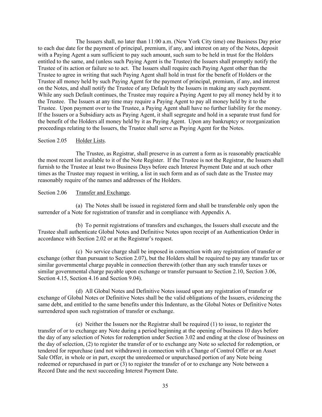 35 The Issuers shall, no later than 11:00 a.m. (New York City time) one Business Day prior to each due date for the payment of principal, premium, if any, and interest on any of the Notes, deposit with a Paying Agent a sum sufficient to pay such amount, such sum to be held in trust for the Holders entitled to the same, and (unless such Paying Agent is the Trustee) the Issuers shall promptly notify the Trustee of its action or failure so to act. The Issuers shall require each Paying Agent other than the Trustee to agree in writing that such Paying Agent shall hold in trust for the benefit of Holders or the Trustee all money held by such Paying Agent for the payment of principal, premium, if any, and interest on the Notes, and shall notify the Trustee of any Default by the Issuers in making any such payment. While any such Default continues, the Trustee may require a Paying Agent to pay all money held by it to the Trustee. The Issuers at any time may require a Paying Agent to pay all money held by it to the Trustee. Upon payment over to the Trustee, a Paying Agent shall have no further liability for the money. If the Issuers or a Subsidiary acts as Paying Agent, it shall segregate and hold in a separate trust fund for the benefit of the Holders all money held by it as Paying Agent. Upon any bankruptcy or reorganization proceedings relating to the Issuers, the Trustee shall serve as Paying Agent for the Notes. Section 2.05 Holder Lists. The Trustee, as Registrar, shall preserve in as current a form as is reasonably practicable the most recent list available to it of the Note Register. If the Trustee is not the Registrar, the Issuers shall furnish to the Trustee at least two Business Days before each Interest Payment Date and at such other times as the Trustee may request in writing, a list in such form and as of such date as the Trustee may reasonably require of the names and addresses of the Holders. Section 2.06 Transfer and Exchange. (a) The Notes shall be issued in registered form and shall be transferable only upon the surrender of a Note for registration of transfer and in compliance with Appendix A. (b) To permit registrations of transfers and exchanges, the Issuers shall execute and the Trustee shall authenticate Global Notes and Definitive Notes upon receipt of an Authentication Order in accordance with Section 2.02 or at the Registrar’s request. (c) No service charge shall be imposed in connection with any registration of transfer or exchange (other than pursuant to Section 2.07), but the Holders shall be required to pay any transfer tax or similar governmental charge payable in connection therewith (other than any such transfer taxes or similar governmental charge payable upon exchange or transfer pursuant to Section 2.10, Section 3.06, Section 4.15, Section 4.16 and Section 9.04). (d) All Global Notes and Definitive Notes issued upon any registration of transfer or exchange of Global Notes or Definitive Notes shall be the valid obligations of the Issuers, evidencing the same debt, and entitled to the same benefits under this Indenture, as the Global Notes or Definitive Notes surrendered upon such registration of transfer or exchange. (e) Neither the Issuers nor the Registrar shall be required (1) to issue, to register the transfer of or to exchange any Note during a period beginning at the opening of business 10 days before the day of any selection of Notes for redemption under Section 3.02 and ending at the close of business on the day of selection, (2) to register the transfer of or to exchange any Note so selected for redemption, or tendered for repurchase (and not withdrawn) in connection with a Change of Control Offer or an Asset Sale Offer, in whole or in part, except the unredeemed or unpurchased portion of any Note being redeemed or repurchased in part or (3) to register the transfer of or to exchange any Note between a Record Date and the next succeeding Interest Payment Date.