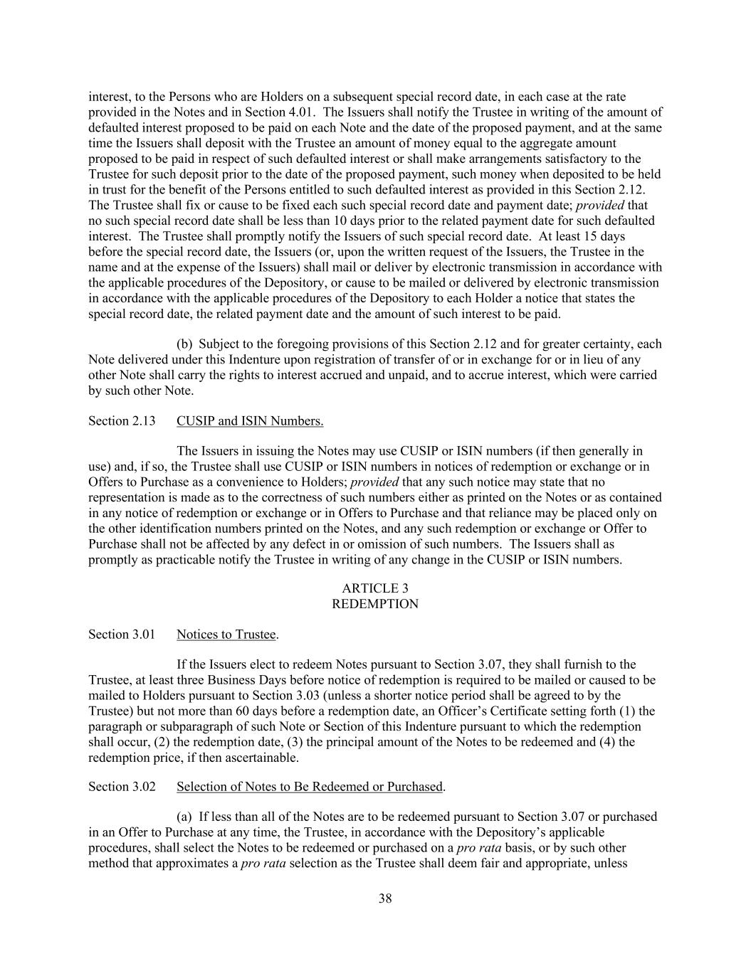 38 interest, to the Persons who are Holders on a subsequent special record date, in each case at the rate provided in the Notes and in Section 4.01. The Issuers shall notify the Trustee in writing of the amount of defaulted interest proposed to be paid on each Note and the date of the proposed payment, and at the same time the Issuers shall deposit with the Trustee an amount of money equal to the aggregate amount proposed to be paid in respect of such defaulted interest or shall make arrangements satisfactory to the Trustee for such deposit prior to the date of the proposed payment, such money when deposited to be held in trust for the benefit of the Persons entitled to such defaulted interest as provided in this Section 2.12. The Trustee shall fix or cause to be fixed each such special record date and payment date; provided that no such special record date shall be less than 10 days prior to the related payment date for such defaulted interest. The Trustee shall promptly notify the Issuers of such special record date. At least 15 days before the special record date, the Issuers (or, upon the written request of the Issuers, the Trustee in the name and at the expense of the Issuers) shall mail or deliver by electronic transmission in accordance with the applicable procedures of the Depository, or cause to be mailed or delivered by electronic transmission in accordance with the applicable procedures of the Depository to each Holder a notice that states the special record date, the related payment date and the amount of such interest to be paid. (b) Subject to the foregoing provisions of this Section 2.12 and for greater certainty, each Note delivered under this Indenture upon registration of transfer of or in exchange for or in lieu of any other Note shall carry the rights to interest accrued and unpaid, and to accrue interest, which were carried by such other Note. Section 2.13 CUSIP and ISIN Numbers. The Issuers in issuing the Notes may use CUSIP or ISIN numbers (if then generally in use) and, if so, the Trustee shall use CUSIP or ISIN numbers in notices of redemption or exchange or in Offers to Purchase as a convenience to Holders; provided that any such notice may state that no representation is made as to the correctness of such numbers either as printed on the Notes or as contained in any notice of redemption or exchange or in Offers to Purchase and that reliance may be placed only on the other identification numbers printed on the Notes, and any such redemption or exchange or Offer to Purchase shall not be affected by any defect in or omission of such numbers. The Issuers shall as promptly as practicable notify the Trustee in writing of any change in the CUSIP or ISIN numbers. ARTICLE 3 REDEMPTION Section 3.01 Notices to Trustee. If the Issuers elect to redeem Notes pursuant to Section 3.07, they shall furnish to the Trustee, at least three Business Days before notice of redemption is required to be mailed or caused to be mailed to Holders pursuant to Section 3.03 (unless a shorter notice period shall be agreed to by the Trustee) but not more than 60 days before a redemption date, an Officer’s Certificate setting forth (1) the paragraph or subparagraph of such Note or Section of this Indenture pursuant to which the redemption shall occur, (2) the redemption date, (3) the principal amount of the Notes to be redeemed and (4) the redemption price, if then ascertainable. Section 3.02 Selection of Notes to Be Redeemed or Purchased. (a) If less than all of the Notes are to be redeemed pursuant to Section 3.07 or purchased in an Offer to Purchase at any time, the Trustee, in accordance with the Depository’s applicable procedures, shall select the Notes to be redeemed or purchased on a pro rata basis, or by such other method that approximates a pro rata selection as the Trustee shall deem fair and appropriate, unless