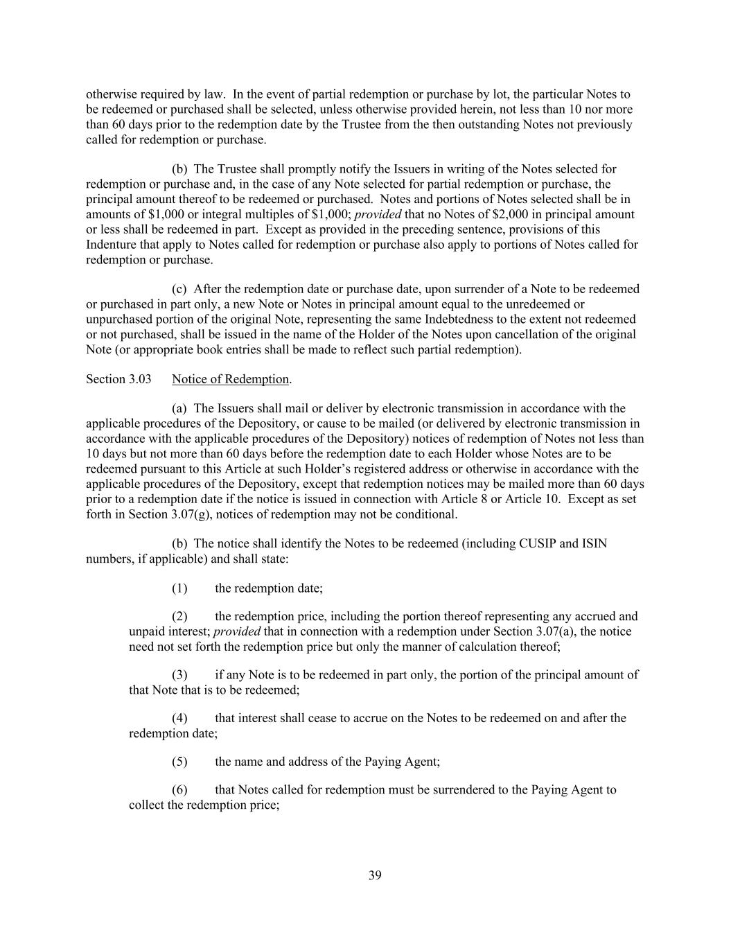 39 otherwise required by law. In the event of partial redemption or purchase by lot, the particular Notes to be redeemed or purchased shall be selected, unless otherwise provided herein, not less than 10 nor more than 60 days prior to the redemption date by the Trustee from the then outstanding Notes not previously called for redemption or purchase. (b) The Trustee shall promptly notify the Issuers in writing of the Notes selected for redemption or purchase and, in the case of any Note selected for partial redemption or purchase, the principal amount thereof to be redeemed or purchased. Notes and portions of Notes selected shall be in amounts of $1,000 or integral multiples of $1,000; provided that no Notes of $2,000 in principal amount or less shall be redeemed in part. Except as provided in the preceding sentence, provisions of this Indenture that apply to Notes called for redemption or purchase also apply to portions of Notes called for redemption or purchase. (c) After the redemption date or purchase date, upon surrender of a Note to be redeemed or purchased in part only, a new Note or Notes in principal amount equal to the unredeemed or unpurchased portion of the original Note, representing the same Indebtedness to the extent not redeemed or not purchased, shall be issued in the name of the Holder of the Notes upon cancellation of the original Note (or appropriate book entries shall be made to reflect such partial redemption). Section 3.03 Notice of Redemption. (a) The Issuers shall mail or deliver by electronic transmission in accordance with the applicable procedures of the Depository, or cause to be mailed (or delivered by electronic transmission in accordance with the applicable procedures of the Depository) notices of redemption of Notes not less than 10 days but not more than 60 days before the redemption date to each Holder whose Notes are to be redeemed pursuant to this Article at such Holder’s registered address or otherwise in accordance with the applicable procedures of the Depository, except that redemption notices may be mailed more than 60 days prior to a redemption date if the notice is issued in connection with Article 8 or Article 10. Except as set forth in Section 3.07(g), notices of redemption may not be conditional. (b) The notice shall identify the Notes to be redeemed (including CUSIP and ISIN numbers, if applicable) and shall state: (1) the redemption date; (2) the redemption price, including the portion thereof representing any accrued and unpaid interest; provided that in connection with a redemption under Section 3.07(a), the notice need not set forth the redemption price but only the manner of calculation thereof; (3) if any Note is to be redeemed in part only, the portion of the principal amount of that Note that is to be redeemed; (4) that interest shall cease to accrue on the Notes to be redeemed on and after the redemption date; (5) the name and address of the Paying Agent; (6) that Notes called for redemption must be surrendered to the Paying Agent to collect the redemption price;