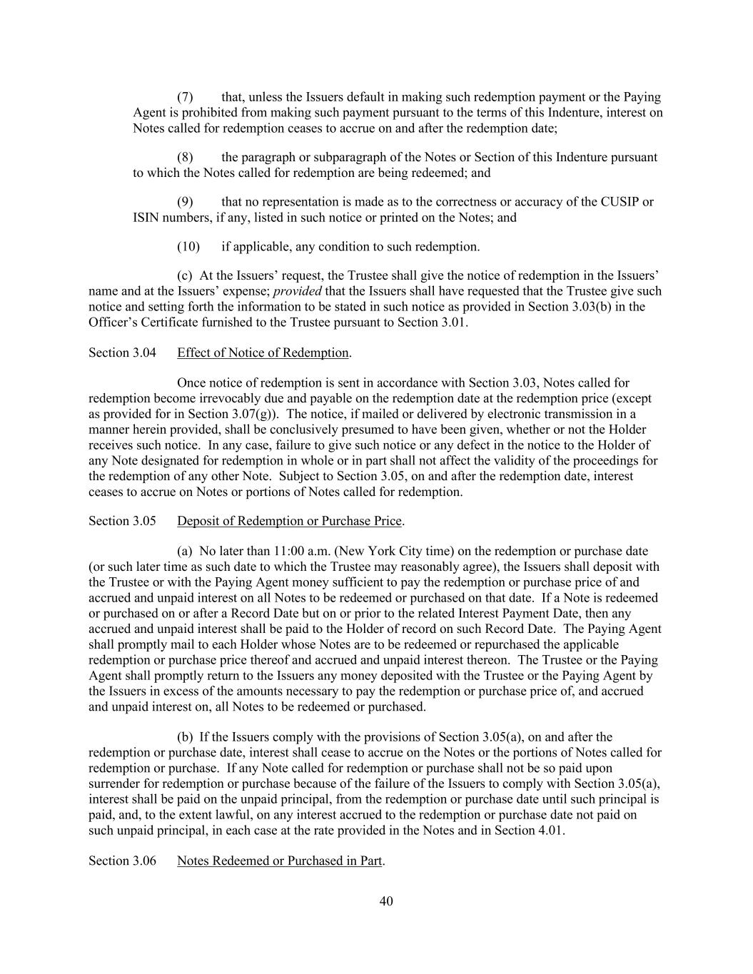 40 (7) that, unless the Issuers default in making such redemption payment or the Paying Agent is prohibited from making such payment pursuant to the terms of this Indenture, interest on Notes called for redemption ceases to accrue on and after the redemption date; (8) the paragraph or subparagraph of the Notes or Section of this Indenture pursuant to which the Notes called for redemption are being redeemed; and (9) that no representation is made as to the correctness or accuracy of the CUSIP or ISIN numbers, if any, listed in such notice or printed on the Notes; and (10) if applicable, any condition to such redemption. (c) At the Issuers’ request, the Trustee shall give the notice of redemption in the Issuers’ name and at the Issuers’ expense; provided that the Issuers shall have requested that the Trustee give such notice and setting forth the information to be stated in such notice as provided in Section 3.03(b) in the Officer’s Certificate furnished to the Trustee pursuant to Section 3.01. Section 3.04 Effect of Notice of Redemption. Once notice of redemption is sent in accordance with Section 3.03, Notes called for redemption become irrevocably due and payable on the redemption date at the redemption price (except as provided for in Section 3.07(g)). The notice, if mailed or delivered by electronic transmission in a manner herein provided, shall be conclusively presumed to have been given, whether or not the Holder receives such notice. In any case, failure to give such notice or any defect in the notice to the Holder of any Note designated for redemption in whole or in part shall not affect the validity of the proceedings for the redemption of any other Note. Subject to Section 3.05, on and after the redemption date, interest ceases to accrue on Notes or portions of Notes called for redemption. Section 3.05 Deposit of Redemption or Purchase Price. (a) No later than 11:00 a.m. (New York City time) on the redemption or purchase date (or such later time as such date to which the Trustee may reasonably agree), the Issuers shall deposit with the Trustee or with the Paying Agent money sufficient to pay the redemption or purchase price of and accrued and unpaid interest on all Notes to be redeemed or purchased on that date. If a Note is redeemed or purchased on or after a Record Date but on or prior to the related Interest Payment Date, then any accrued and unpaid interest shall be paid to the Holder of record on such Record Date. The Paying Agent shall promptly mail to each Holder whose Notes are to be redeemed or repurchased the applicable redemption or purchase price thereof and accrued and unpaid interest thereon. The Trustee or the Paying Agent shall promptly return to the Issuers any money deposited with the Trustee or the Paying Agent by the Issuers in excess of the amounts necessary to pay the redemption or purchase price of, and accrued and unpaid interest on, all Notes to be redeemed or purchased. (b) If the Issuers comply with the provisions of Section 3.05(a), on and after the redemption or purchase date, interest shall cease to accrue on the Notes or the portions of Notes called for redemption or purchase. If any Note called for redemption or purchase shall not be so paid upon surrender for redemption or purchase because of the failure of the Issuers to comply with Section 3.05(a), interest shall be paid on the unpaid principal, from the redemption or purchase date until such principal is paid, and, to the extent lawful, on any interest accrued to the redemption or purchase date not paid on such unpaid principal, in each case at the rate provided in the Notes and in Section 4.01. Section 3.06 Notes Redeemed or Purchased in Part.