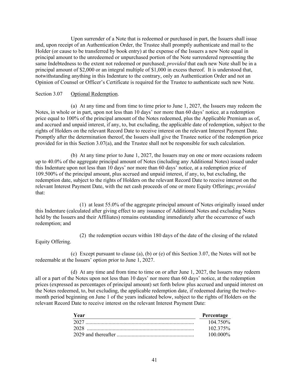 41 Upon surrender of a Note that is redeemed or purchased in part, the Issuers shall issue and, upon receipt of an Authentication Order, the Trustee shall promptly authenticate and mail to the Holder (or cause to be transferred by book entry) at the expense of the Issuers a new Note equal in principal amount to the unredeemed or unpurchased portion of the Note surrendered representing the same Indebtedness to the extent not redeemed or purchased; provided that each new Note shall be in a principal amount of $2,000 or an integral multiple of $1,000 in excess thereof. It is understood that, notwithstanding anything in this Indenture to the contrary, only an Authentication Order and not an Opinion of Counsel or Officer’s Certificate is required for the Trustee to authenticate such new Note. Section 3.07 Optional Redemption. (a) At any time and from time to time prior to June 1, 2027, the Issuers may redeem the Notes, in whole or in part, upon not less than 10 days’ nor more than 60 days’ notice, at a redemption price equal to 100% of the principal amount of the Notes redeemed, plus the Applicable Premium as of, and accrued and unpaid interest, if any, to, but excluding, the applicable date of redemption, subject to the rights of Holders on the relevant Record Date to receive interest on the relevant Interest Payment Date. Promptly after the determination thereof, the Issuers shall give the Trustee notice of the redemption price provided for in this Section 3.07(a), and the Trustee shall not be responsible for such calculation. (b) At any time prior to June 1, 2027, the Issuers may on one or more occasions redeem up to 40.0% of the aggregate principal amount of Notes (including any Additional Notes) issued under this Indenture upon not less than 10 days’ nor more than 60 days’ notice, at a redemption price of 109.500% of the principal amount, plus accrued and unpaid interest, if any, to, but excluding, the redemption date, subject to the rights of Holders on the relevant Record Date to receive interest on the relevant Interest Payment Date, with the net cash proceeds of one or more Equity Offerings; provided that: (1) at least 55.0% of the aggregate principal amount of Notes originally issued under this Indenture (calculated after giving effect to any issuance of Additional Notes and excluding Notes held by the Issuers and their Affiliates) remains outstanding immediately after the occurrence of such redemption; and (2) the redemption occurs within 180 days of the date of the closing of the related Equity Offering. (c) Except pursuant to clause (a), (b) or (e) of this Section 3.07, the Notes will not be redeemable at the Issuers’ option prior to June 1, 2027. (d) At any time and from time to time on or after June 1, 2027, the Issuers may redeem all or a part of the Notes upon not less than 10 days’ nor more than 60 days’ notice, at the redemption prices (expressed as percentages of principal amount) set forth below plus accrued and unpaid interest on the Notes redeemed, to, but excluding, the applicable redemption date, if redeemed during the twelve- month period beginning on June 1 of the years indicated below, subject to the rights of Holders on the relevant Record Date to receive interest on the relevant Interest Payment Date: Year Percentage 2027 ................................................................................ 104.750% 2028 ............................................................................... 102.375% 2029 and thereafter ......................................................... 100.000%