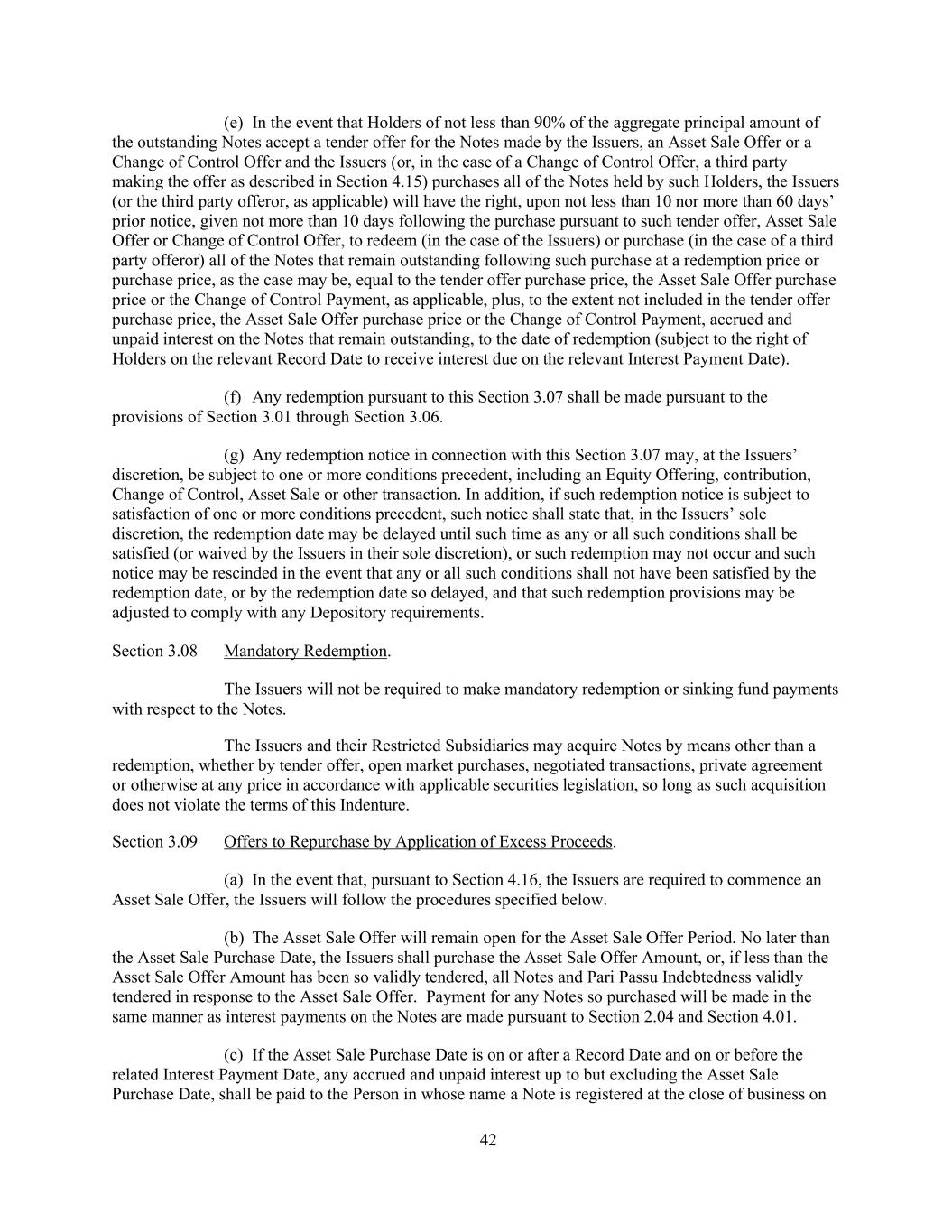 42 (e) In the event that Holders of not less than 90% of the aggregate principal amount of the outstanding Notes accept a tender offer for the Notes made by the Issuers, an Asset Sale Offer or a Change of Control Offer and the Issuers (or, in the case of a Change of Control Offer, a third party making the offer as described in Section 4.15) purchases all of the Notes held by such Holders, the Issuers (or the third party offeror, as applicable) will have the right, upon not less than 10 nor more than 60 days’ prior notice, given not more than 10 days following the purchase pursuant to such tender offer, Asset Sale Offer or Change of Control Offer, to redeem (in the case of the Issuers) or purchase (in the case of a third party offeror) all of the Notes that remain outstanding following such purchase at a redemption price or purchase price, as the case may be, equal to the tender offer purchase price, the Asset Sale Offer purchase price or the Change of Control Payment, as applicable, plus, to the extent not included in the tender offer purchase price, the Asset Sale Offer purchase price or the Change of Control Payment, accrued and unpaid interest on the Notes that remain outstanding, to the date of redemption (subject to the right of Holders on the relevant Record Date to receive interest due on the relevant Interest Payment Date). (f) Any redemption pursuant to this Section 3.07 shall be made pursuant to the provisions of Section 3.01 through Section 3.06. (g) Any redemption notice in connection with this Section 3.07 may, at the Issuers’ discretion, be subject to one or more conditions precedent, including an Equity Offering, contribution, Change of Control, Asset Sale or other transaction. In addition, if such redemption notice is subject to satisfaction of one or more conditions precedent, such notice shall state that, in the Issuers’ sole discretion, the redemption date may be delayed until such time as any or all such conditions shall be satisfied (or waived by the Issuers in their sole discretion), or such redemption may not occur and such notice may be rescinded in the event that any or all such conditions shall not have been satisfied by the redemption date, or by the redemption date so delayed, and that such redemption provisions may be adjusted to comply with any Depository requirements. Section 3.08 Mandatory Redemption. The Issuers will not be required to make mandatory redemption or sinking fund payments with respect to the Notes. The Issuers and their Restricted Subsidiaries may acquire Notes by means other than a redemption, whether by tender offer, open market purchases, negotiated transactions, private agreement or otherwise at any price in accordance with applicable securities legislation, so long as such acquisition does not violate the terms of this Indenture. Section 3.09 Offers to Repurchase by Application of Excess Proceeds. (a) In the event that, pursuant to Section 4.16, the Issuers are required to commence an Asset Sale Offer, the Issuers will follow the procedures specified below. (b) The Asset Sale Offer will remain open for the Asset Sale Offer Period. No later than the Asset Sale Purchase Date, the Issuers shall purchase the Asset Sale Offer Amount, or, if less than the Asset Sale Offer Amount has been so validly tendered, all Notes and Pari Passu Indebtedness validly tendered in response to the Asset Sale Offer. Payment for any Notes so purchased will be made in the same manner as interest payments on the Notes are made pursuant to Section 2.04 and Section 4.01. (c) If the Asset Sale Purchase Date is on or after a Record Date and on or before the related Interest Payment Date, any accrued and unpaid interest up to but excluding the Asset Sale Purchase Date, shall be paid to the Person in whose name a Note is registered at the close of business on