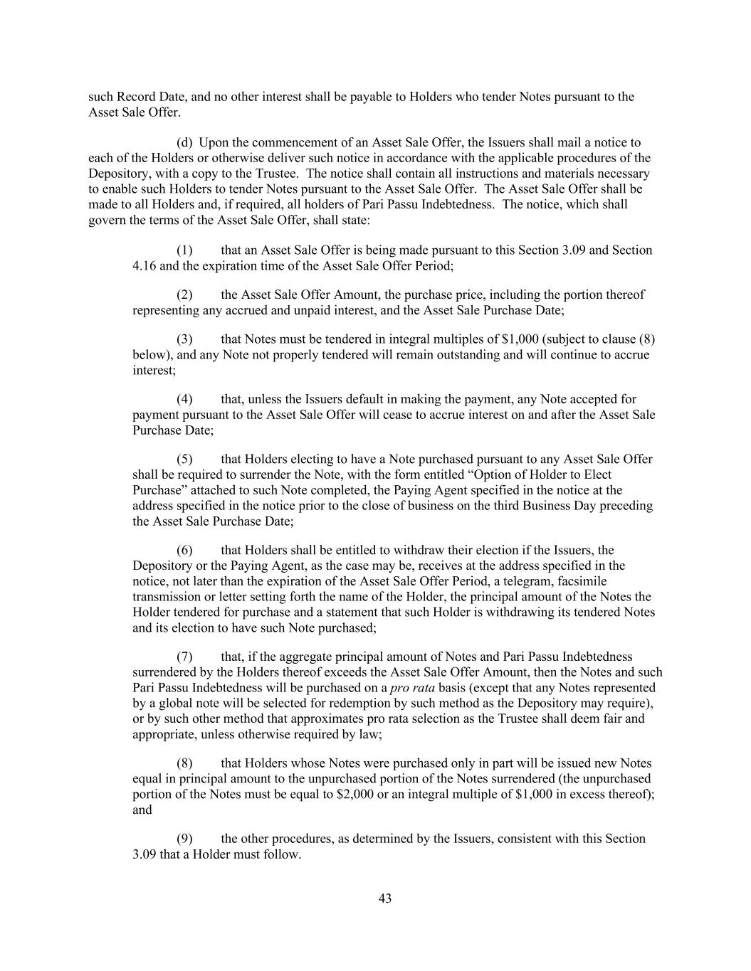 43 such Record Date, and no other interest shall be payable to Holders who tender Notes pursuant to the Asset Sale Offer. (d) Upon the commencement of an Asset Sale Offer, the Issuers shall mail a notice to each of the Holders or otherwise deliver such notice in accordance with the applicable procedures of the Depository, with a copy to the Trustee. The notice shall contain all instructions and materials necessary to enable such Holders to tender Notes pursuant to the Asset Sale Offer. The Asset Sale Offer shall be made to all Holders and, if required, all holders of Pari Passu Indebtedness. The notice, which shall govern the terms of the Asset Sale Offer, shall state: (1) that an Asset Sale Offer is being made pursuant to this Section 3.09 and Section 4.16 and the expiration time of the Asset Sale Offer Period; (2) the Asset Sale Offer Amount, the purchase price, including the portion thereof representing any accrued and unpaid interest, and the Asset Sale Purchase Date; (3) that Notes must be tendered in integral multiples of $1,000 (subject to clause (8) below), and any Note not properly tendered will remain outstanding and will continue to accrue interest; (4) that, unless the Issuers default in making the payment, any Note accepted for payment pursuant to the Asset Sale Offer will cease to accrue interest on and after the Asset Sale Purchase Date; (5) that Holders electing to have a Note purchased pursuant to any Asset Sale Offer shall be required to surrender the Note, with the form entitled “Option of Holder to Elect Purchase” attached to such Note completed, the Paying Agent specified in the notice at the address specified in the notice prior to the close of business on the third Business Day preceding the Asset Sale Purchase Date; (6) that Holders shall be entitled to withdraw their election if the Issuers, the Depository or the Paying Agent, as the case may be, receives at the address specified in the notice, not later than the expiration of the Asset Sale Offer Period, a telegram, facsimile transmission or letter setting forth the name of the Holder, the principal amount of the Notes the Holder tendered for purchase and a statement that such Holder is withdrawing its tendered Notes and its election to have such Note purchased; (7) that, if the aggregate principal amount of Notes and Pari Passu Indebtedness surrendered by the Holders thereof exceeds the Asset Sale Offer Amount, then the Notes and such Pari Passu Indebtedness will be purchased on a pro rata basis (except that any Notes represented by a global note will be selected for redemption by such method as the Depository may require), or by such other method that approximates pro rata selection as the Trustee shall deem fair and appropriate, unless otherwise required by law; (8) that Holders whose Notes were purchased only in part will be issued new Notes equal in principal amount to the unpurchased portion of the Notes surrendered (the unpurchased portion of the Notes must be equal to $2,000 or an integral multiple of $1,000 in excess thereof); and (9) the other procedures, as determined by the Issuers, consistent with this Section 3.09 that a Holder must follow.