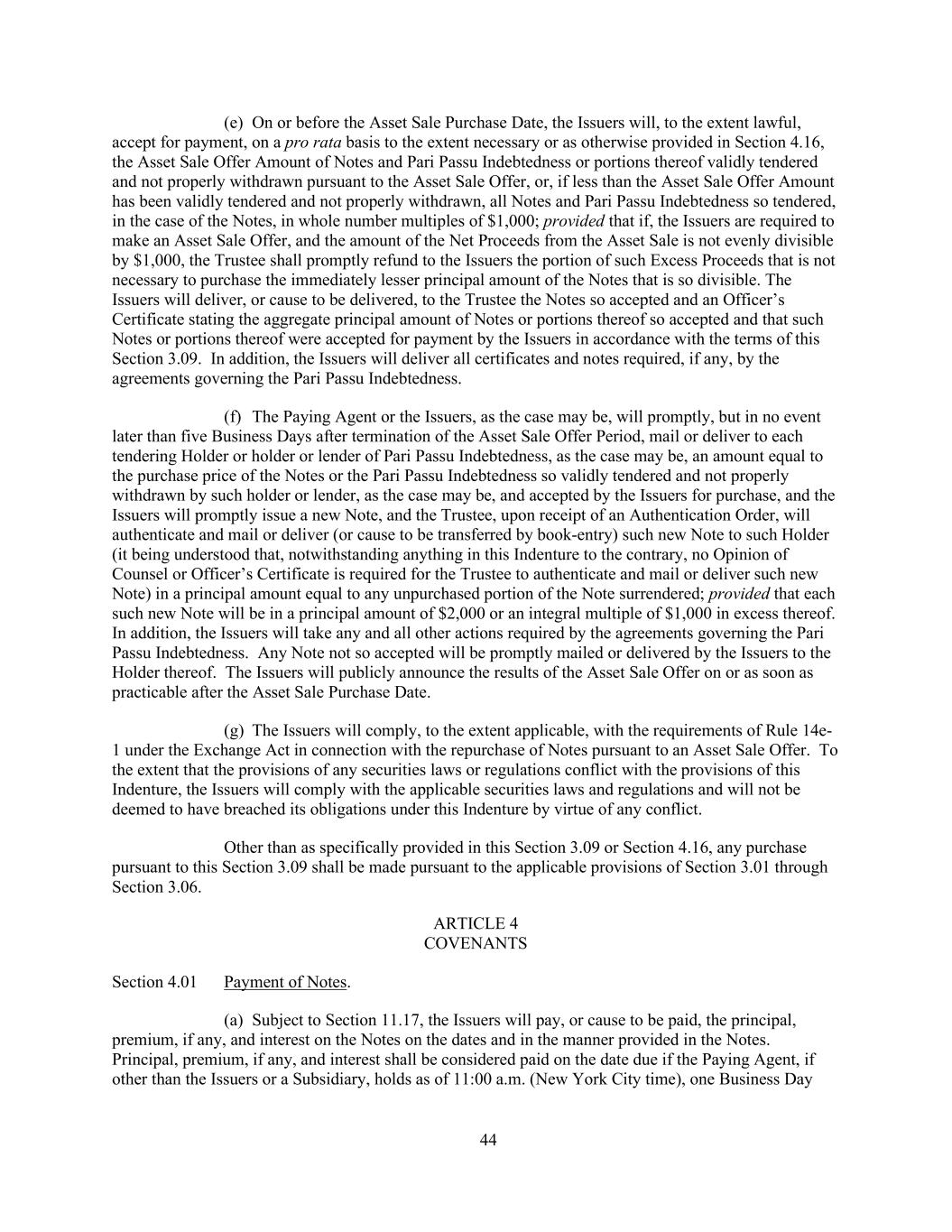 44 (e) On or before the Asset Sale Purchase Date, the Issuers will, to the extent lawful, accept for payment, on a pro rata basis to the extent necessary or as otherwise provided in Section 4.16, the Asset Sale Offer Amount of Notes and Pari Passu Indebtedness or portions thereof validly tendered and not properly withdrawn pursuant to the Asset Sale Offer, or, if less than the Asset Sale Offer Amount has been validly tendered and not properly withdrawn, all Notes and Pari Passu Indebtedness so tendered, in the case of the Notes, in whole number multiples of $1,000; provided that if, the Issuers are required to make an Asset Sale Offer, and the amount of the Net Proceeds from the Asset Sale is not evenly divisible by $1,000, the Trustee shall promptly refund to the Issuers the portion of such Excess Proceeds that is not necessary to purchase the immediately lesser principal amount of the Notes that is so divisible. The Issuers will deliver, or cause to be delivered, to the Trustee the Notes so accepted and an Officer’s Certificate stating the aggregate principal amount of Notes or portions thereof so accepted and that such Notes or portions thereof were accepted for payment by the Issuers in accordance with the terms of this Section 3.09. In addition, the Issuers will deliver all certificates and notes required, if any, by the agreements governing the Pari Passu Indebtedness. (f) The Paying Agent or the Issuers, as the case may be, will promptly, but in no event later than five Business Days after termination of the Asset Sale Offer Period, mail or deliver to each tendering Holder or holder or lender of Pari Passu Indebtedness, as the case may be, an amount equal to the purchase price of the Notes or the Pari Passu Indebtedness so validly tendered and not properly withdrawn by such holder or lender, as the case may be, and accepted by the Issuers for purchase, and the Issuers will promptly issue a new Note, and the Trustee, upon receipt of an Authentication Order, will authenticate and mail or deliver (or cause to be transferred by book-entry) such new Note to such Holder (it being understood that, notwithstanding anything in this Indenture to the contrary, no Opinion of Counsel or Officer’s Certificate is required for the Trustee to authenticate and mail or deliver such new Note) in a principal amount equal to any unpurchased portion of the Note surrendered; provided that each such new Note will be in a principal amount of $2,000 or an integral multiple of $1,000 in excess thereof. In addition, the Issuers will take any and all other actions required by the agreements governing the Pari Passu Indebtedness. Any Note not so accepted will be promptly mailed or delivered by the Issuers to the Holder thereof. The Issuers will publicly announce the results of the Asset Sale Offer on or as soon as practicable after the Asset Sale Purchase Date. (g) The Issuers will comply, to the extent applicable, with the requirements of Rule 14e- 1 under the Exchange Act in connection with the repurchase of Notes pursuant to an Asset Sale Offer. To the extent that the provisions of any securities laws or regulations conflict with the provisions of this Indenture, the Issuers will comply with the applicable securities laws and regulations and will not be deemed to have breached its obligations under this Indenture by virtue of any conflict. Other than as specifically provided in this Section 3.09 or Section 4.16, any purchase pursuant to this Section 3.09 shall be made pursuant to the applicable provisions of Section 3.01 through Section 3.06. ARTICLE 4 COVENANTS Section 4.01 Payment of Notes. (a) Subject to Section 11.17, the Issuers will pay, or cause to be paid, the principal, premium, if any, and interest on the Notes on the dates and in the manner provided in the Notes. Principal, premium, if any, and interest shall be considered paid on the date due if the Paying Agent, if other than the Issuers or a Subsidiary, holds as of 11:00 a.m. (New York City time), one Business Day