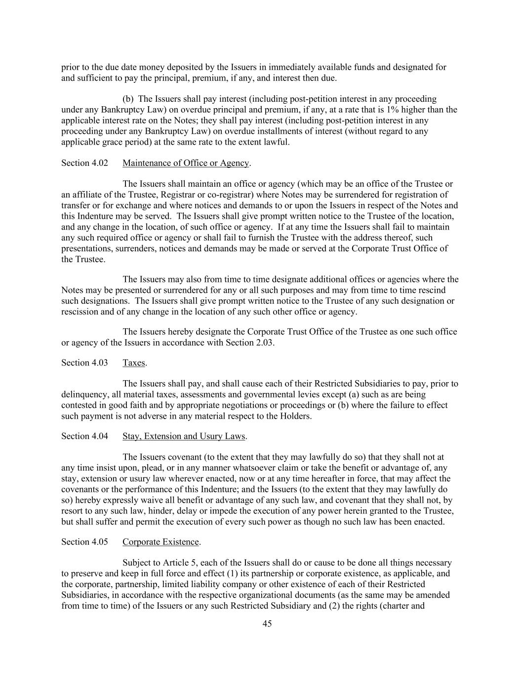 45 prior to the due date money deposited by the Issuers in immediately available funds and designated for and sufficient to pay the principal, premium, if any, and interest then due. (b) The Issuers shall pay interest (including post-petition interest in any proceeding under any Bankruptcy Law) on overdue principal and premium, if any, at a rate that is 1% higher than the applicable interest rate on the Notes; they shall pay interest (including post-petition interest in any proceeding under any Bankruptcy Law) on overdue installments of interest (without regard to any applicable grace period) at the same rate to the extent lawful. Section 4.02 Maintenance of Office or Agency. The Issuers shall maintain an office or agency (which may be an office of the Trustee or an affiliate of the Trustee, Registrar or co-registrar) where Notes may be surrendered for registration of transfer or for exchange and where notices and demands to or upon the Issuers in respect of the Notes and this Indenture may be served. The Issuers shall give prompt written notice to the Trustee of the location, and any change in the location, of such office or agency. If at any time the Issuers shall fail to maintain any such required office or agency or shall fail to furnish the Trustee with the address thereof, such presentations, surrenders, notices and demands may be made or served at the Corporate Trust Office of the Trustee. The Issuers may also from time to time designate additional offices or agencies where the Notes may be presented or surrendered for any or all such purposes and may from time to time rescind such designations. The Issuers shall give prompt written notice to the Trustee of any such designation or rescission and of any change in the location of any such other office or agency. The Issuers hereby designate the Corporate Trust Office of the Trustee as one such office or agency of the Issuers in accordance with Section 2.03. Section 4.03 Taxes. The Issuers shall pay, and shall cause each of their Restricted Subsidiaries to pay, prior to delinquency, all material taxes, assessments and governmental levies except (a) such as are being contested in good faith and by appropriate negotiations or proceedings or (b) where the failure to effect such payment is not adverse in any material respect to the Holders. Section 4.04 Stay, Extension and Usury Laws. The Issuers covenant (to the extent that they may lawfully do so) that they shall not at any time insist upon, plead, or in any manner whatsoever claim or take the benefit or advantage of, any stay, extension or usury law wherever enacted, now or at any time hereafter in force, that may affect the covenants or the performance of this Indenture; and the Issuers (to the extent that they may lawfully do so) hereby expressly waive all benefit or advantage of any such law, and covenant that they shall not, by resort to any such law, hinder, delay or impede the execution of any power herein granted to the Trustee, but shall suffer and permit the execution of every such power as though no such law has been enacted. Section 4.05 Corporate Existence. Subject to Article 5, each of the Issuers shall do or cause to be done all things necessary to preserve and keep in full force and effect (1) its partnership or corporate existence, as applicable, and the corporate, partnership, limited liability company or other existence of each of their Restricted Subsidiaries, in accordance with the respective organizational documents (as the same may be amended from time to time) of the Issuers or any such Restricted Subsidiary and (2) the rights (charter and