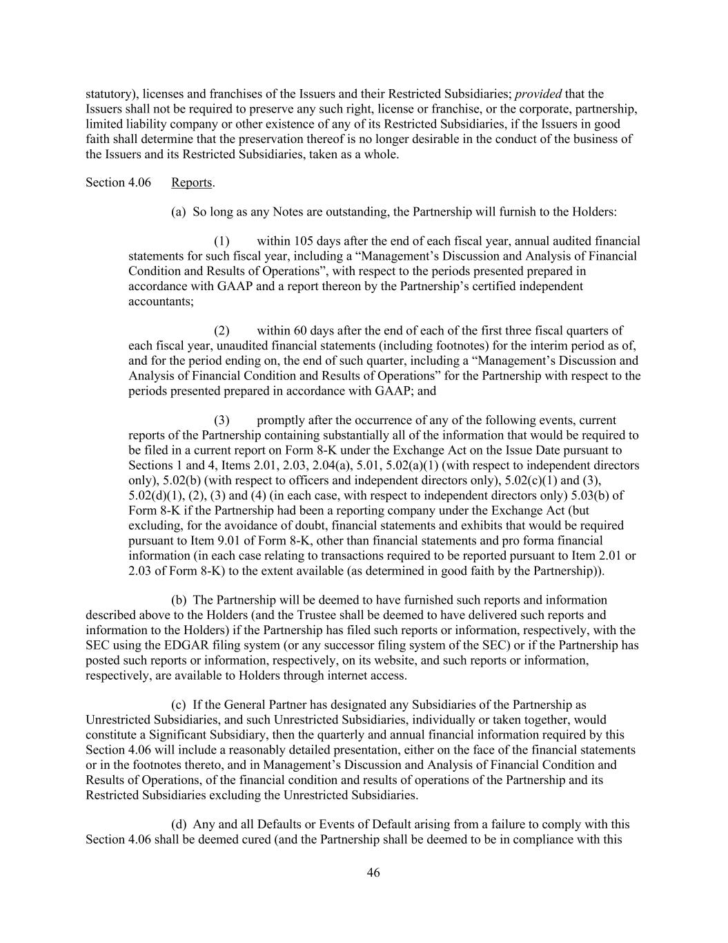 46 statutory), licenses and franchises of the Issuers and their Restricted Subsidiaries; provided that the Issuers shall not be required to preserve any such right, license or franchise, or the corporate, partnership, limited liability company or other existence of any of its Restricted Subsidiaries, if the Issuers in good faith shall determine that the preservation thereof is no longer desirable in the conduct of the business of the Issuers and its Restricted Subsidiaries, taken as a whole. Section 4.06 Reports. (a) So long as any Notes are outstanding, the Partnership will furnish to the Holders: (1) within 105 days after the end of each fiscal year, annual audited financial statements for such fiscal year, including a “Management’s Discussion and Analysis of Financial Condition and Results of Operations”, with respect to the periods presented prepared in accordance with GAAP and a report thereon by the Partnership’s certified independent accountants; (2) within 60 days after the end of each of the first three fiscal quarters of each fiscal year, unaudited financial statements (including footnotes) for the interim period as of, and for the period ending on, the end of such quarter, including a “Management’s Discussion and Analysis of Financial Condition and Results of Operations” for the Partnership with respect to the periods presented prepared in accordance with GAAP; and (3) promptly after the occurrence of any of the following events, current reports of the Partnership containing substantially all of the information that would be required to be filed in a current report on Form 8-K under the Exchange Act on the Issue Date pursuant to Sections 1 and 4, Items 2.01, 2.03, 2.04(a), 5.01, 5.02(a)(1) (with respect to independent directors only), 5.02(b) (with respect to officers and independent directors only), 5.02(c)(1) and (3), 5.02(d)(1), (2), (3) and (4) (in each case, with respect to independent directors only) 5.03(b) of Form 8-K if the Partnership had been a reporting company under the Exchange Act (but excluding, for the avoidance of doubt, financial statements and exhibits that would be required pursuant to Item 9.01 of Form 8-K, other than financial statements and pro forma financial information (in each case relating to transactions required to be reported pursuant to Item 2.01 or 2.03 of Form 8-K) to the extent available (as determined in good faith by the Partnership)). (b) The Partnership will be deemed to have furnished such reports and information described above to the Holders (and the Trustee shall be deemed to have delivered such reports and information to the Holders) if the Partnership has filed such reports or information, respectively, with the SEC using the EDGAR filing system (or any successor filing system of the SEC) or if the Partnership has posted such reports or information, respectively, on its website, and such reports or information, respectively, are available to Holders through internet access. (c) If the General Partner has designated any Subsidiaries of the Partnership as Unrestricted Subsidiaries, and such Unrestricted Subsidiaries, individually or taken together, would constitute a Significant Subsidiary, then the quarterly and annual financial information required by this Section 4.06 will include a reasonably detailed presentation, either on the face of the financial statements or in the footnotes thereto, and in Management’s Discussion and Analysis of Financial Condition and Results of Operations, of the financial condition and results of operations of the Partnership and its Restricted Subsidiaries excluding the Unrestricted Subsidiaries. (d) Any and all Defaults or Events of Default arising from a failure to comply with this Section 4.06 shall be deemed cured (and the Partnership shall be deemed to be in compliance with this