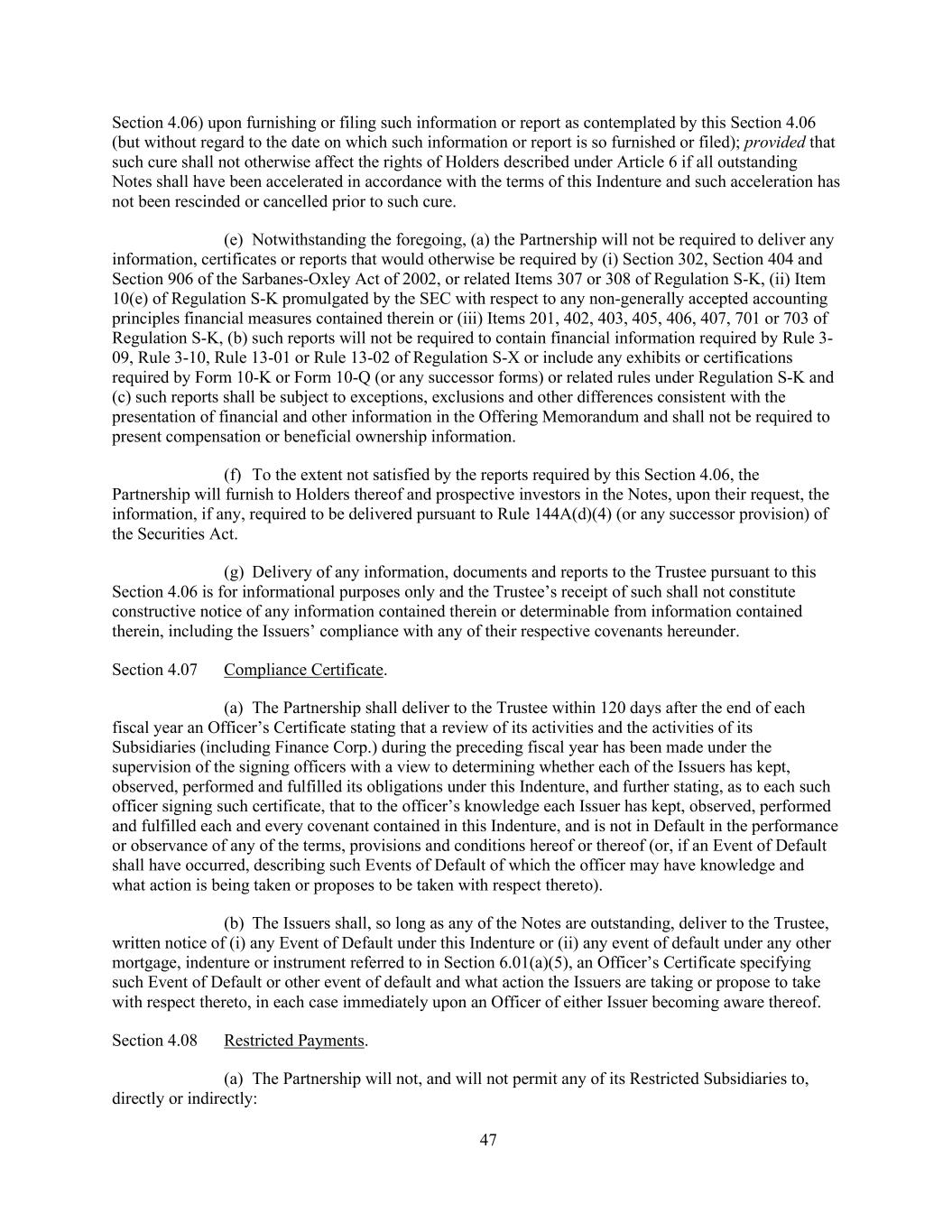 47 Section 4.06) upon furnishing or filing such information or report as contemplated by this Section 4.06 (but without regard to the date on which such information or report is so furnished or filed); provided that such cure shall not otherwise affect the rights of Holders described under Article 6 if all outstanding Notes shall have been accelerated in accordance with the terms of this Indenture and such acceleration has not been rescinded or cancelled prior to such cure. (e) Notwithstanding the foregoing, (a) the Partnership will not be required to deliver any information, certificates or reports that would otherwise be required by (i) Section 302, Section 404 and Section 906 of the Sarbanes-Oxley Act of 2002, or related Items 307 or 308 of Regulation S-K, (ii) Item 10(e) of Regulation S-K promulgated by the SEC with respect to any non-generally accepted accounting principles financial measures contained therein or (iii) Items 201, 402, 403, 405, 406, 407, 701 or 703 of Regulation S-K, (b) such reports will not be required to contain financial information required by Rule 3- 09, Rule 3-10, Rule 13-01 or Rule 13-02 of Regulation S-X or include any exhibits or certifications required by Form 10-K or Form 10-Q (or any successor forms) or related rules under Regulation S-K and (c) such reports shall be subject to exceptions, exclusions and other differences consistent with the presentation of financial and other information in the Offering Memorandum and shall not be required to present compensation or beneficial ownership information. (f) To the extent not satisfied by the reports required by this Section 4.06, the Partnership will furnish to Holders thereof and prospective investors in the Notes, upon their request, the information, if any, required to be delivered pursuant to Rule 144A(d)(4) (or any successor provision) of the Securities Act. (g) Delivery of any information, documents and reports to the Trustee pursuant to this Section 4.06 is for informational purposes only and the Trustee’s receipt of such shall not constitute constructive notice of any information contained therein or determinable from information contained therein, including the Issuers’ compliance with any of their respective covenants hereunder. Section 4.07 Compliance Certificate. (a) The Partnership shall deliver to the Trustee within 120 days after the end of each fiscal year an Officer’s Certificate stating that a review of its activities and the activities of its Subsidiaries (including Finance Corp.) during the preceding fiscal year has been made under the supervision of the signing officers with a view to determining whether each of the Issuers has kept, observed, performed and fulfilled its obligations under this Indenture, and further stating, as to each such officer signing such certificate, that to the officer’s knowledge each Issuer has kept, observed, performed and fulfilled each and every covenant contained in this Indenture, and is not in Default in the performance or observance of any of the terms, provisions and conditions hereof or thereof (or, if an Event of Default shall have occurred, describing such Events of Default of which the officer may have knowledge and what action is being taken or proposes to be taken with respect thereto). (b) The Issuers shall, so long as any of the Notes are outstanding, deliver to the Trustee, written notice of (i) any Event of Default under this Indenture or (ii) any event of default under any other mortgage, indenture or instrument referred to in Section 6.01(a)(5), an Officer’s Certificate specifying such Event of Default or other event of default and what action the Issuers are taking or propose to take with respect thereto, in each case immediately upon an Officer of either Issuer becoming aware thereof. Section 4.08 Restricted Payments. (a) The Partnership will not, and will not permit any of its Restricted Subsidiaries to, directly or indirectly: