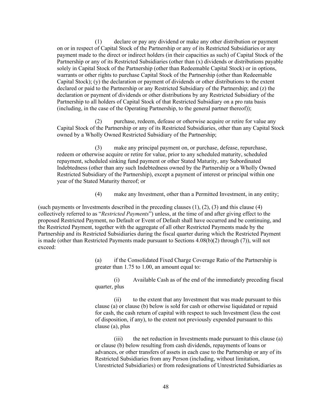 49 Restricted Subsidiaries, to the extent not previously expended pursuant to this clause (a); or (b) if the Consolidated Fixed Charge Coverage Ratio of the Partnership is equal to or less than 1.75 to 1.00, an amount equal to the sum of: (i) $300.0 million, less (ii) the aggregate amount of all restricted payments made by the Partnership and its Restricted Subsidiaries in accordance with this clause (b) during the period ending on the last day of the fiscal quarter of the Partnership immediately preceding the date of the restricted payment and beginning on the first day of the sixteenth full fiscal quarter immediately preceding the date of the restricted payment, plus (iii) the aggregate net cash proceeds of any substantially concurrent capital contribution to the Partnership from any Person (other than a Restricted Subsidiary of the Partnership), or issuance and sale of shares of Capital Stock (other than Redeemable Capital Stock) of the Partnership to any Person (other than to a Restricted Subsidiary of the Partnership). (b) Notwithstanding the foregoing, Section 4.08(a) will not prohibit: (1) the payment of any dividend, distribution or the consummation of any irrevocable redemption within 60 days after the date of declaration of the dividend or giving of the redemption notice, as the case may be, if at the date of declaration or notice, the dividend or redemption payment would have otherwise complied with the provisions of this Indenture; (2) the making of any Restricted Payment in exchange for, or out of the net cash proceeds of, a substantially concurrent (not to exceed 120 days following the receipt of such net cash proceeds) (x) capital contribution to the Partnership from any Person (other than a Restricted Subsidiary of the Partnership); or (y) issuance and sale of other Capital Stock (other than Redeemable Capital Stock) of the Partnership to any Person (other than to a Restricted Subsidiary of the Partnership); provided, however, that the amount of any net cash proceeds that are utilized for any such Restricted Payment will be excluded from the calculation of Available Cash; (3) any redemption, repurchase, defeasance or other acquisition or retirement of Subordinated Indebtedness in exchange for, or out of the net cash proceeds of, a substantially concurrent (not to exceed 120 days following the receipt of such net cash proceeds) (x) capital contribution to the Partnership from any Person (other than a Restricted Subsidiary of the Partnership); or (y) issuance and sale of (a) Capital Stock (other than Redeemable Capital Stock) of the Partnership to any Person (other than to a Restricted Subsidiary of the Partnership), or (b) Indebtedness of the Partnership issued to any Person (other than a Restricted Subsidiary of the Partnership), so long as the Indebtedness is Permitted Refinancing Indebtedness; provided, however, that the amount of any net cash proceeds that are utilized for any redemption, repurchase or other acquisition or retirement will be excluded from the calculation of Available Cash;