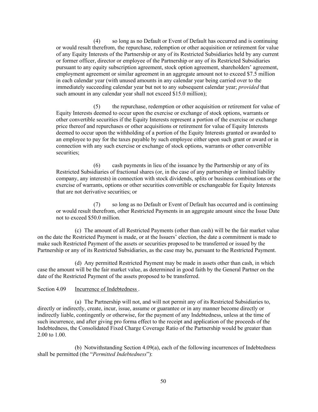 50 (4) so long as no Default or Event of Default has occurred and is continuing or would result therefrom, the repurchase, redemption or other acquisition or retirement for value of any Equity Interests of the Partnership or any of its Restricted Subsidiaries held by any current or former officer, director or employee of the Partnership or any of its Restricted Subsidiaries pursuant to any equity subscription agreement, stock option agreement, shareholders’ agreement, employment agreement or similar agreement in an aggregate amount not to exceed $7.5 million in each calendar year (with unused amounts in any calendar year being carried over to the immediately succeeding calendar year but not to any subsequent calendar year; provided that such amount in any calendar year shall not exceed $15.0 million); (5) the repurchase, redemption or other acquisition or retirement for value of Equity Interests deemed to occur upon the exercise or exchange of stock options, warrants or other convertible securities if the Equity Interests represent a portion of the exercise or exchange price thereof and repurchases or other acquisitions or retirement for value of Equity Interests deemed to occur upon the withholding of a portion of the Equity Interests granted or awarded to an employee to pay for the taxes payable by such employee either upon such grant or award or in connection with any such exercise or exchange of stock options, warrants or other convertible securities; (6) cash payments in lieu of the issuance by the Partnership or any of its Restricted Subsidiaries of fractional shares (or, in the case of any partnership or limited liability company, any interests) in connection with stock dividends, splits or business combinations or the exercise of warrants, options or other securities convertible or exchangeable for Equity Interests that are not derivative securities; or (7) so long as no Default or Event of Default has occurred and is continuing or would result therefrom, other Restricted Payments in an aggregate amount since the Issue Date not to exceed $50.0 million. (c) The amount of all Restricted Payments (other than cash) will be the fair market value on the date the Restricted Payment is made, or at the Issuers’ election, the date a commitment is made to make such Restricted Payment of the assets or securities proposed to be transferred or issued by the Partnership or any of its Restricted Subsidiaries, as the case may be, pursuant to the Restricted Payment. (d) Any permitted Restricted Payment may be made in assets other than cash, in which case the amount will be the fair market value, as determined in good faith by the General Partner on the date of the Restricted Payment of the assets proposed to be transferred. Section 4.09 Incurrence of Indebtedness . (a) The Partnership will not, and will not permit any of its Restricted Subsidiaries to, directly or indirectly, create, incur, issue, assume or guarantee or in any manner become directly or indirectly liable, contingently or otherwise, for the payment of any Indebtedness, unless at the time of such incurrence, and after giving pro forma effect to the receipt and application of the proceeds of the Indebtedness, the Consolidated Fixed Charge Coverage Ratio of the Partnership would be greater than 2.00 to 1.00. (b) Notwithstanding Section 4.09(a), each of the following incurrences of Indebtedness shall be permitted (the “Permitted Indebtedness”):