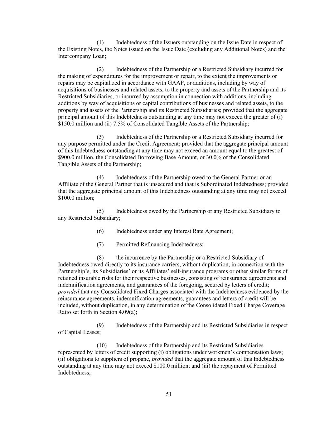 51 (1) Indebtedness of the Issuers outstanding on the Issue Date in respect of the Existing Notes, the Notes issued on the Issue Date (excluding any Additional Notes) and the Intercompany Loan; (2) Indebtedness of the Partnership or a Restricted Subsidiary incurred for the making of expenditures for the improvement or repair, to the extent the improvements or repairs may be capitalized in accordance with GAAP, or additions, including by way of acquisitions of businesses and related assets, to the property and assets of the Partnership and its Restricted Subsidiaries, or incurred by assumption in connection with additions, including additions by way of acquisitions or capital contributions of businesses and related assets, to the property and assets of the Partnership and its Restricted Subsidiaries; provided that the aggregate principal amount of this Indebtedness outstanding at any time may not exceed the greater of (i) $150.0 million and (ii) 7.5% of Consolidated Tangible Assets of the Partnership; (3) Indebtedness of the Partnership or a Restricted Subsidiary incurred for any purpose permitted under the Credit Agreement; provided that the aggregate principal amount of this Indebtedness outstanding at any time may not exceed an amount equal to the greatest of $900.0 million, the Consolidated Borrowing Base Amount, or 30.0% of the Consolidated Tangible Assets of the Partnership; (4) Indebtedness of the Partnership owed to the General Partner or an Affiliate of the General Partner that is unsecured and that is Subordinated Indebtedness; provided that the aggregate principal amount of this Indebtedness outstanding at any time may not exceed $100.0 million; (5) Indebtedness owed by the Partnership or any Restricted Subsidiary to any Restricted Subsidiary; (6) Indebtedness under any Interest Rate Agreement; (7) Permitted Refinancing Indebtedness; (8) the incurrence by the Partnership or a Restricted Subsidiary of Indebtedness owed directly to its insurance carriers, without duplication, in connection with the Partnership’s, its Subsidiaries’ or its Affiliates’ self-insurance programs or other similar forms of retained insurable risks for their respective businesses, consisting of reinsurance agreements and indemnification agreements, and guarantees of the foregoing, secured by letters of credit; provided that any Consolidated Fixed Charges associated with the Indebtedness evidenced by the reinsurance agreements, indemnification agreements, guarantees and letters of credit will be included, without duplication, in any determination of the Consolidated Fixed Charge Coverage Ratio set forth in Section 4.09(a); (9) Indebtedness of the Partnership and its Restricted Subsidiaries in respect of Capital Leases; (10) Indebtedness of the Partnership and its Restricted Subsidiaries represented by letters of credit supporting (i) obligations under workmen’s compensation laws; (ii) obligations to suppliers of propane, provided that the aggregate amount of this Indebtedness outstanding at any time may not exceed $100.0 million; and (iii) the repayment of Permitted Indebtedness;
