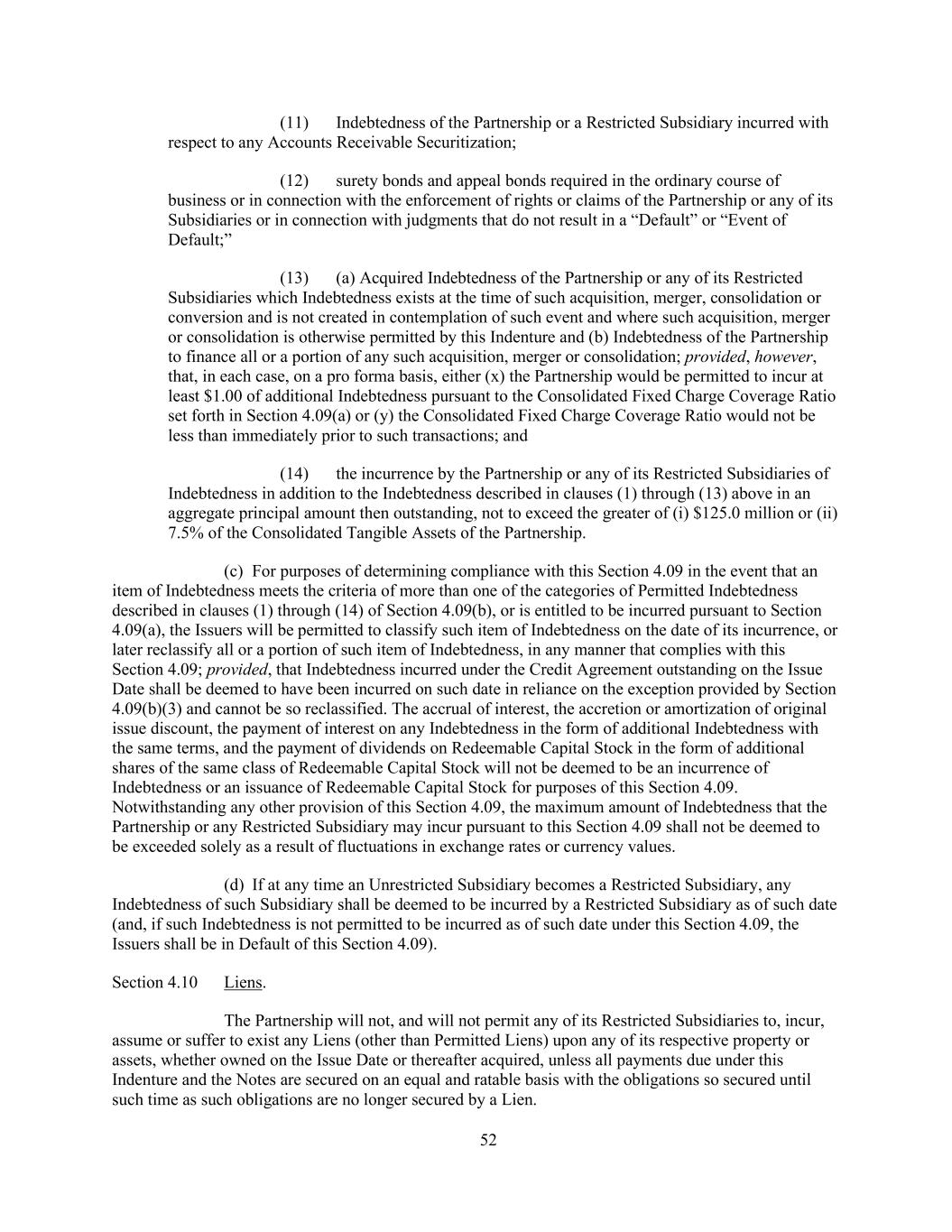 52 (11) Indebtedness of the Partnership or a Restricted Subsidiary incurred with respect to any Accounts Receivable Securitization; (12) surety bonds and appeal bonds required in the ordinary course of business or in connection with the enforcement of rights or claims of the Partnership or any of its Subsidiaries or in connection with judgments that do not result in a “Default” or “Event of Default;” (13) (a) Acquired Indebtedness of the Partnership or any of its Restricted Subsidiaries which Indebtedness exists at the time of such acquisition, merger, consolidation or conversion and is not created in contemplation of such event and where such acquisition, merger or consolidation is otherwise permitted by this Indenture and (b) Indebtedness of the Partnership to finance all or a portion of any such acquisition, merger or consolidation; provided, however, that, in each case, on a pro forma basis, either (x) the Partnership would be permitted to incur at least $1.00 of additional Indebtedness pursuant to the Consolidated Fixed Charge Coverage Ratio set forth in Section 4.09(a) or (y) the Consolidated Fixed Charge Coverage Ratio would not be less than immediately prior to such transactions; and (14) the incurrence by the Partnership or any of its Restricted Subsidiaries of Indebtedness in addition to the Indebtedness described in clauses (1) through (13) above in an aggregate principal amount then outstanding, not to exceed the greater of (i) $125.0 million or (ii) 7.5% of the Consolidated Tangible Assets of the Partnership. (c) For purposes of determining compliance with this Section 4.09 in the event that an item of Indebtedness meets the criteria of more than one of the categories of Permitted Indebtedness described in clauses (1) through (14) of Section 4.09(b), or is entitled to be incurred pursuant to Section 4.09(a), the Issuers will be permitted to classify such item of Indebtedness on the date of its incurrence, or later reclassify all or a portion of such item of Indebtedness, in any manner that complies with this Section 4.09; provided, that Indebtedness incurred under the Credit Agreement outstanding on the Issue Date shall be deemed to have been incurred on such date in reliance on the exception provided by Section 4.09(b)(3) and cannot be so reclassified. The accrual of interest, the accretion or amortization of original issue discount, the payment of interest on any Indebtedness in the form of additional Indebtedness with the same terms, and the payment of dividends on Redeemable Capital Stock in the form of additional shares of the same class of Redeemable Capital Stock will not be deemed to be an incurrence of Indebtedness or an issuance of Redeemable Capital Stock for purposes of this Section 4.09. Notwithstanding any other provision of this Section 4.09, the maximum amount of Indebtedness that the Partnership or any Restricted Subsidiary may incur pursuant to this Section 4.09 shall not be deemed to be exceeded solely as a result of fluctuations in exchange rates or currency values. (d) If at any time an Unrestricted Subsidiary becomes a Restricted Subsidiary, any Indebtedness of such Subsidiary shall be deemed to be incurred by a Restricted Subsidiary as of such date (and, if such Indebtedness is not permitted to be incurred as of such date under this Section 4.09, the Issuers shall be in Default of this Section 4.09). Section 4.10 Liens. The Partnership will not, and will not permit any of its Restricted Subsidiaries to, incur, assume or suffer to exist any Liens (other than Permitted Liens) upon any of its respective property or assets, whether owned on the Issue Date or thereafter acquired, unless all payments due under this Indenture and the Notes are secured on an equal and ratable basis with the obligations so secured until such time as such obligations are no longer secured by a Lien.