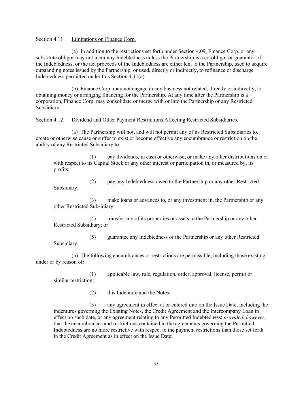 53 Section 4.11 Limitations on Finance Corp. (a) In addition to the restrictions set forth under Section 4.09, Finance Corp. or any substitute obligor may not incur any Indebtedness unless the Partnership is a co-obligor or guarantor of the Indebtedness, or the net proceeds of the Indebtedness are either lent to the Partnership, used to acquire outstanding notes issued by the Partnership, or used, directly or indirectly, to refinance or discharge Indebtedness permitted under this Section 4.11(a). (b) Finance Corp. may not engage in any business not related, directly or indirectly, to obtaining money or arranging financing for the Partnership. At any time after the Partnership is a corporation, Finance Corp. may consolidate or merge with or into the Partnership or any Restricted Subsidiary. Section 4.12 Dividend and Other Payment Restrictions Affecting Restricted Subsidiaries. (a) The Partnership will not, and will not permit any of its Restricted Subsidiaries to, create or otherwise cause or suffer to exist or become effective any encumbrance or restriction on the ability of any Restricted Subsidiary to: (1) pay dividends, in cash or otherwise, or make any other distributions on or with respect to its Capital Stock or any other interest or participation in, or measured by, its profits; (2) pay any Indebtedness owed to the Partnership or any other Restricted Subsidiary; (3) make loans or advances to, or any investment in, the Partnership or any other Restricted Subsidiary; (4) transfer any of its properties or assets to the Partnership or any other Restricted Subsidiary; or (5) guarantee any Indebtedness of the Partnership or any other Restricted Subsidiary. (b) The following encumbrances or restrictions are permissible, including those existing under or by reason of: (1) applicable law, rule, regulation, order, approval, license, permit or similar restriction; (2) this Indenture and the Notes; (3) any agreement in effect at or entered into on the Issue Date, including the indentures governing the Existing Notes, the Credit Agreement and the Intercompany Loan in effect on such date, or any agreement relating to any Permitted Indebtedness; provided, however, that the encumbrances and restrictions contained in the agreements governing the Permitted Indebtedness are no more restrictive with respect to the payment restrictions than those set forth in the Credit Agreement as in effect on the Issue Date;