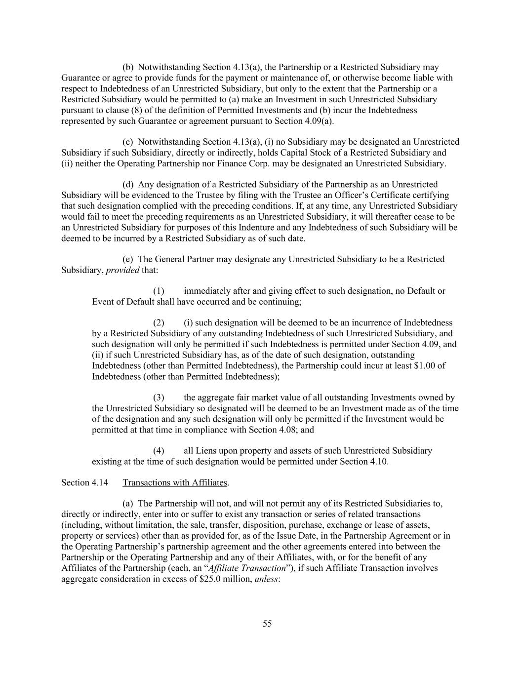 55 (b) Notwithstanding Section 4.13(a), the Partnership or a Restricted Subsidiary may Guarantee or agree to provide funds for the payment or maintenance of, or otherwise become liable with respect to Indebtedness of an Unrestricted Subsidiary, but only to the extent that the Partnership or a Restricted Subsidiary would be permitted to (a) make an Investment in such Unrestricted Subsidiary pursuant to clause (8) of the definition of Permitted Investments and (b) incur the Indebtedness represented by such Guarantee or agreement pursuant to Section 4.09(a). (c) Notwithstanding Section 4.13(a), (i) no Subsidiary may be designated an Unrestricted Subsidiary if such Subsidiary, directly or indirectly, holds Capital Stock of a Restricted Subsidiary and (ii) neither the Operating Partnership nor Finance Corp. may be designated an Unrestricted Subsidiary. (d) Any designation of a Restricted Subsidiary of the Partnership as an Unrestricted Subsidiary will be evidenced to the Trustee by filing with the Trustee an Officer’s Certificate certifying that such designation complied with the preceding conditions. If, at any time, any Unrestricted Subsidiary would fail to meet the preceding requirements as an Unrestricted Subsidiary, it will thereafter cease to be an Unrestricted Subsidiary for purposes of this Indenture and any Indebtedness of such Subsidiary will be deemed to be incurred by a Restricted Subsidiary as of such date. (e) The General Partner may designate any Unrestricted Subsidiary to be a Restricted Subsidiary, provided that: (1) immediately after and giving effect to such designation, no Default or Event of Default shall have occurred and be continuing; (2) (i) such designation will be deemed to be an incurrence of Indebtedness by a Restricted Subsidiary of any outstanding Indebtedness of such Unrestricted Subsidiary, and such designation will only be permitted if such Indebtedness is permitted under Section 4.09, and (ii) if such Unrestricted Subsidiary has, as of the date of such designation, outstanding Indebtedness (other than Permitted Indebtedness), the Partnership could incur at least $1.00 of Indebtedness (other than Permitted Indebtedness); (3) the aggregate fair market value of all outstanding Investments owned by the Unrestricted Subsidiary so designated will be deemed to be an Investment made as of the time of the designation and any such designation will only be permitted if the Investment would be permitted at that time in compliance with Section 4.08; and (4) all Liens upon property and assets of such Unrestricted Subsidiary existing at the time of such designation would be permitted under Section 4.10. Section 4.14 Transactions with Affiliates. (a) The Partnership will not, and will not permit any of its Restricted Subsidiaries to, directly or indirectly, enter into or suffer to exist any transaction or series of related transactions (including, without limitation, the sale, transfer, disposition, purchase, exchange or lease of assets, property or services) other than as provided for, as of the Issue Date, in the Partnership Agreement or in the Operating Partnership’s partnership agreement and the other agreements entered into between the Partnership or the Operating Partnership and any of their Affiliates, with, or for the benefit of any Affiliates of the Partnership (each, an “Affiliate Transaction”), if such Affiliate Transaction involves aggregate consideration in excess of $25.0 million, unless: